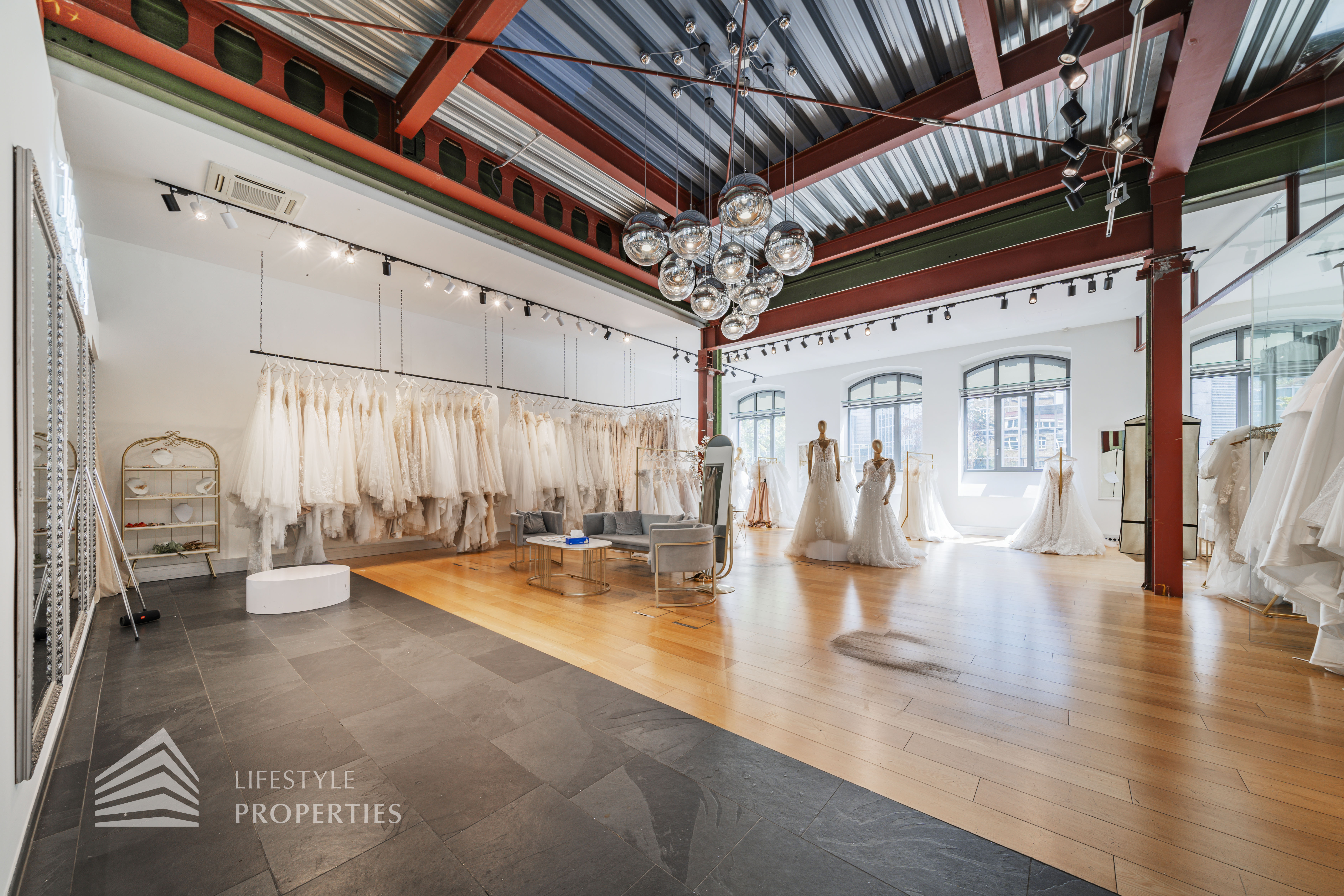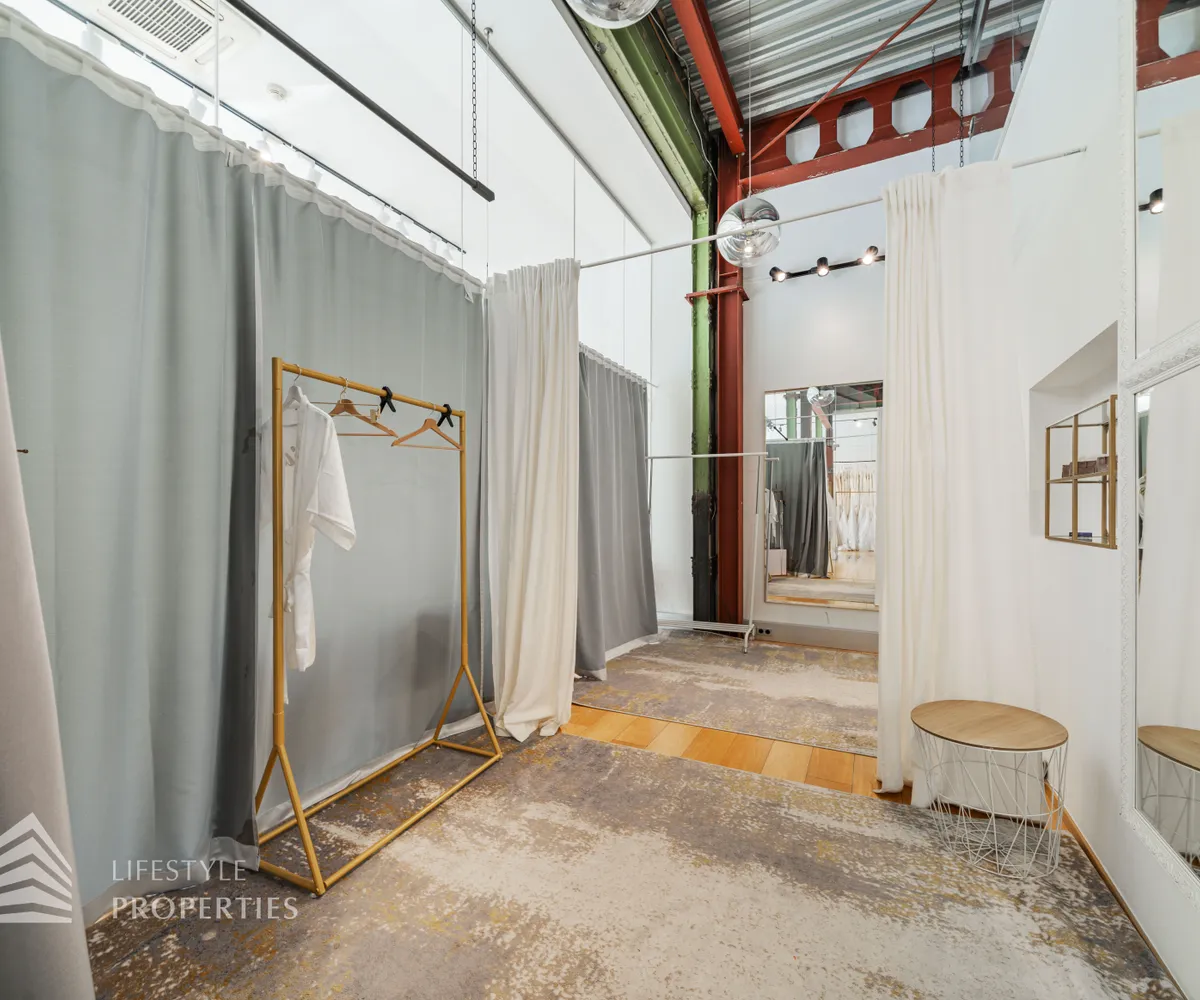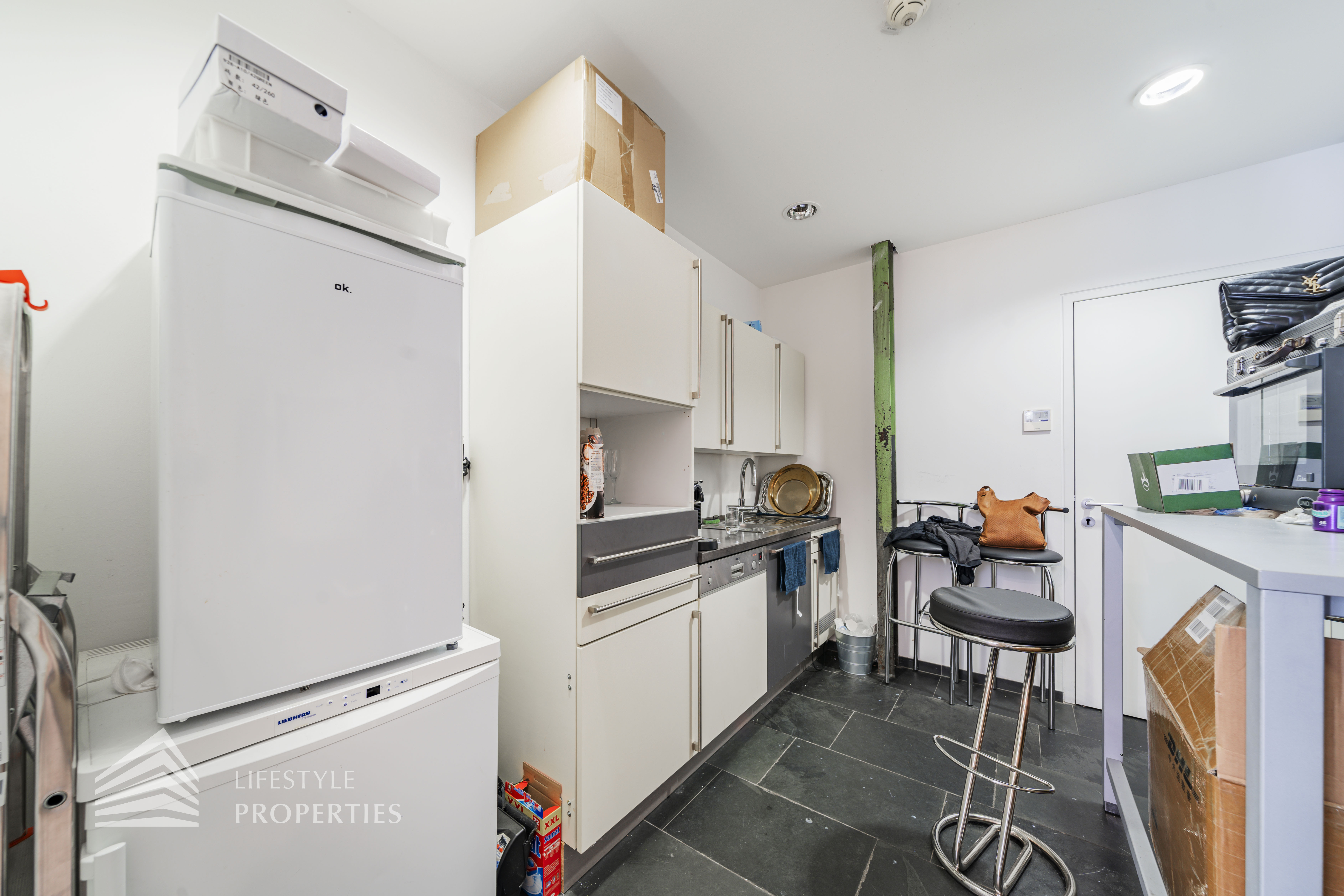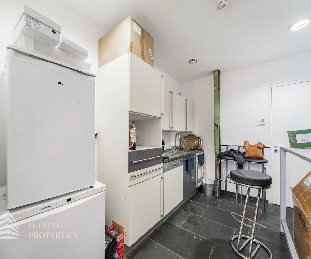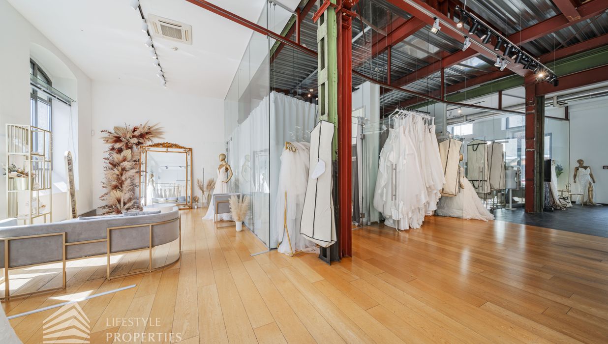 Das Büro zeichnet sich durch die offene Raumgestaltung aus. Viele große Fenster versorgen die Räumlichkeiten mit viel Licht und schaffen eine angenehme Arbeitsatmosphäre. Die Küche ist mit allen notwendigen Geräten ausgestattet und verfügt über ausreichend Stauraum. Die Fotos zeigen die Räumlichkeiten, wie sie damals ausgesehen haben, als sie für Bürozwecke genutzt wurden, und wie sie im Moment aussehen.