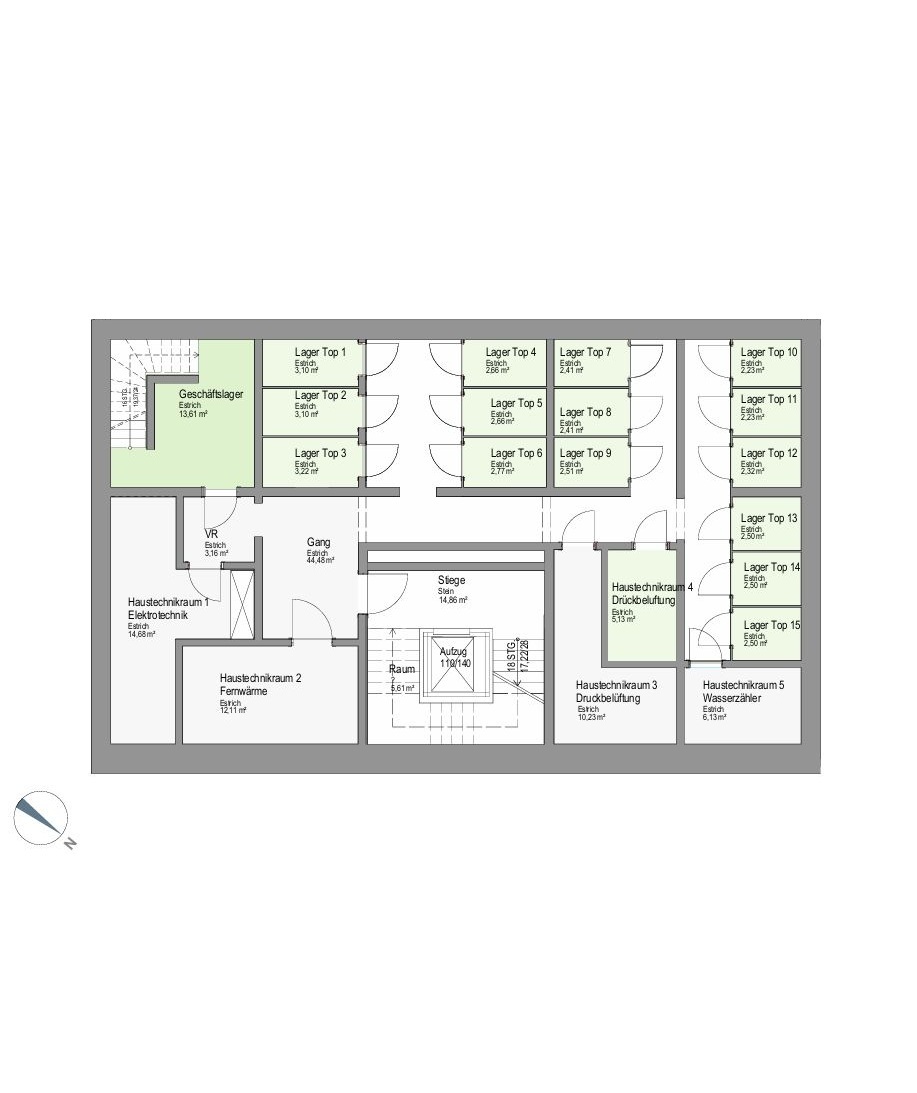 Die reine Bürofläche beträgt 43,35qm und es gibt noch eine Lagerfläche in Keller in Ausmaß von 13,61qm.