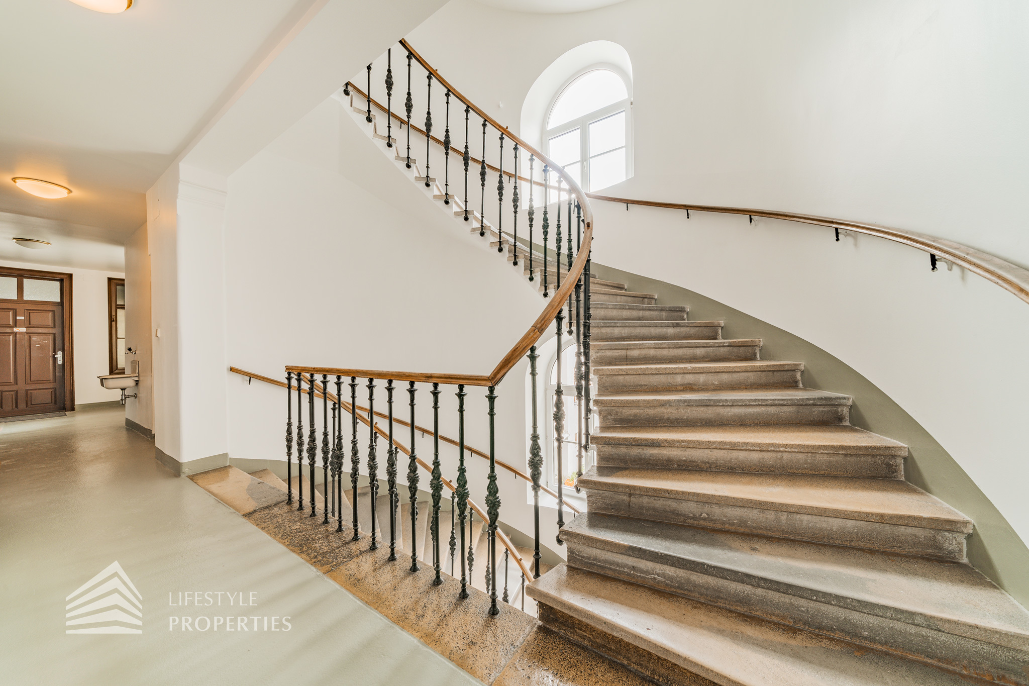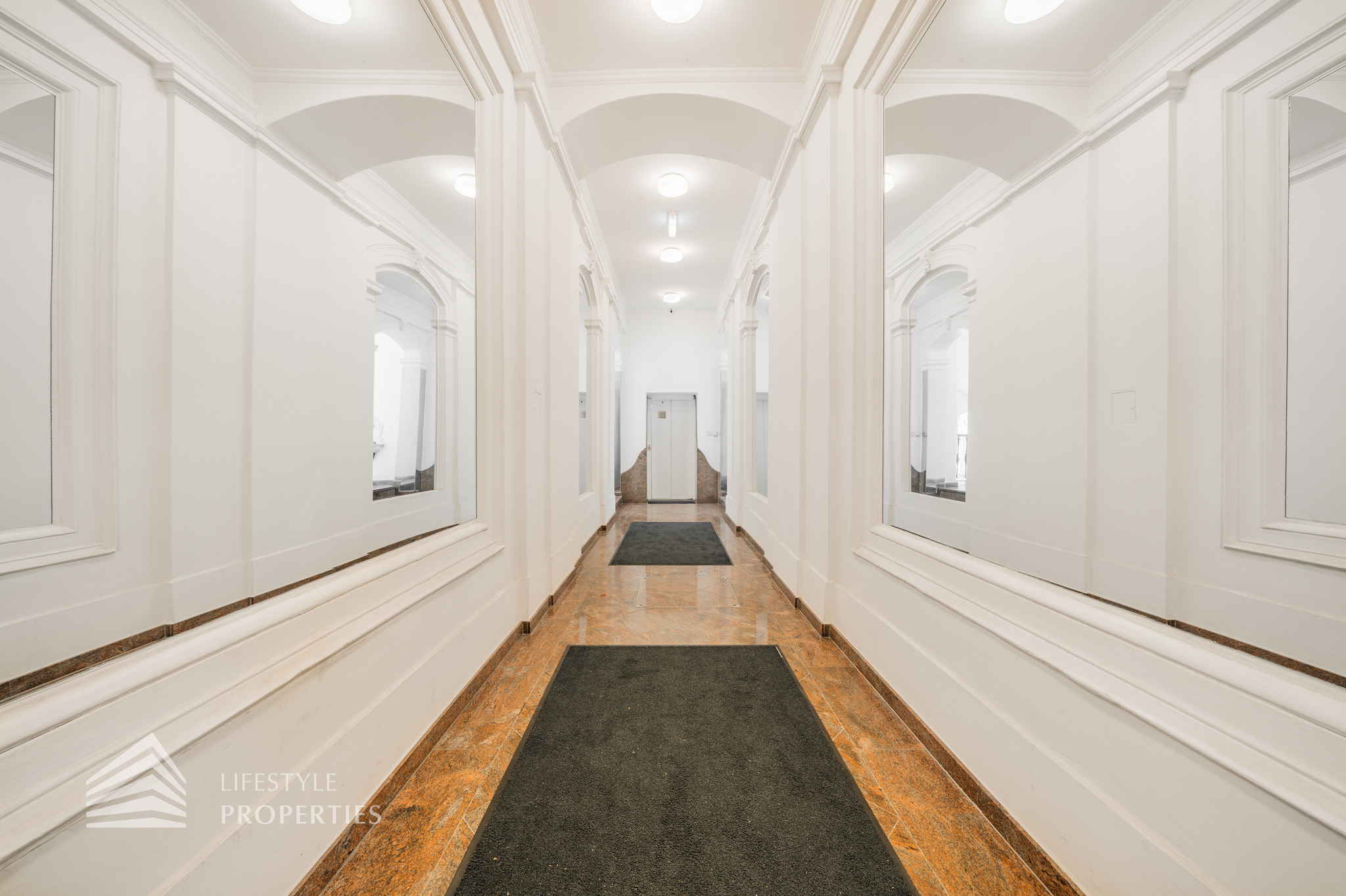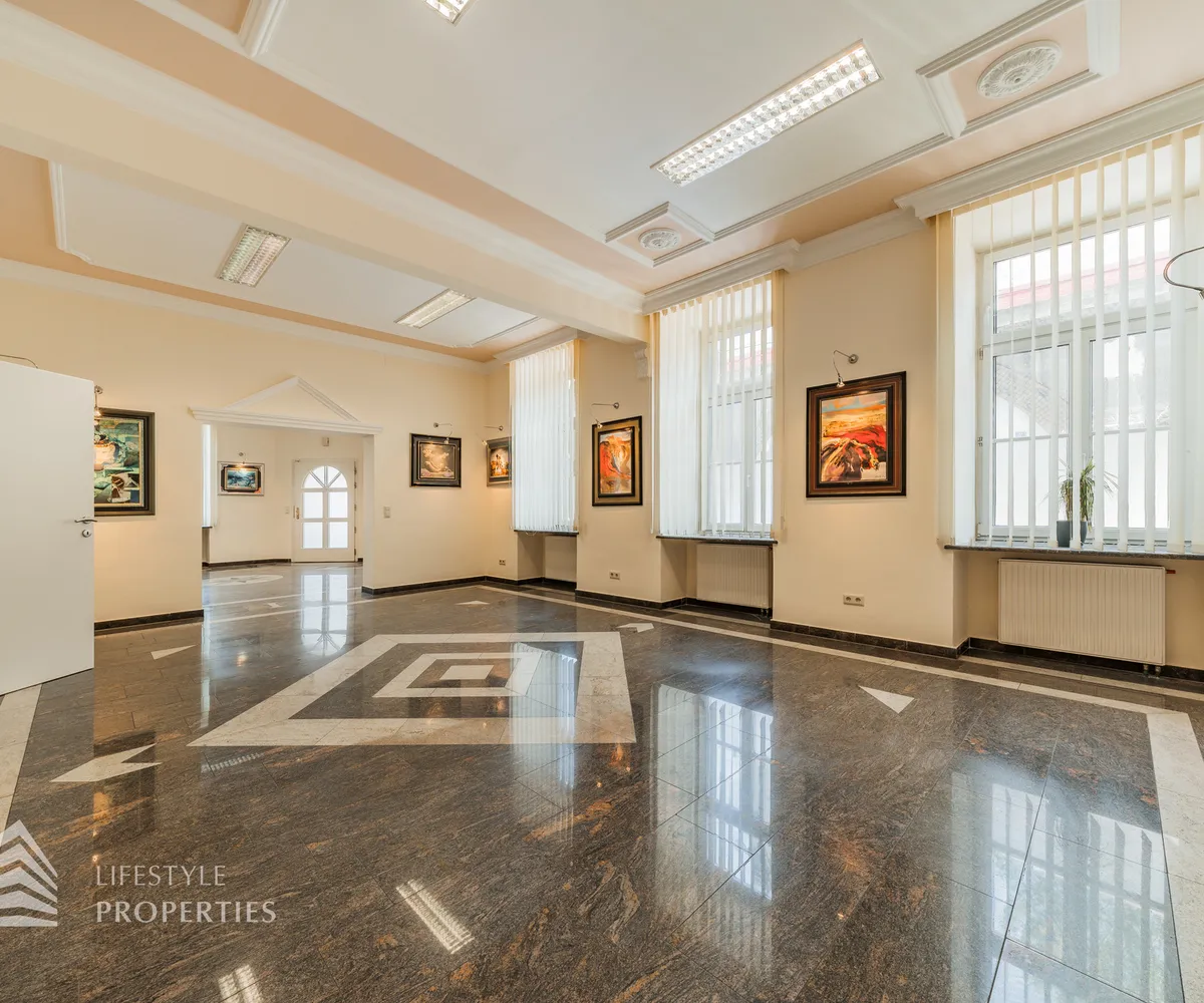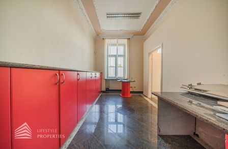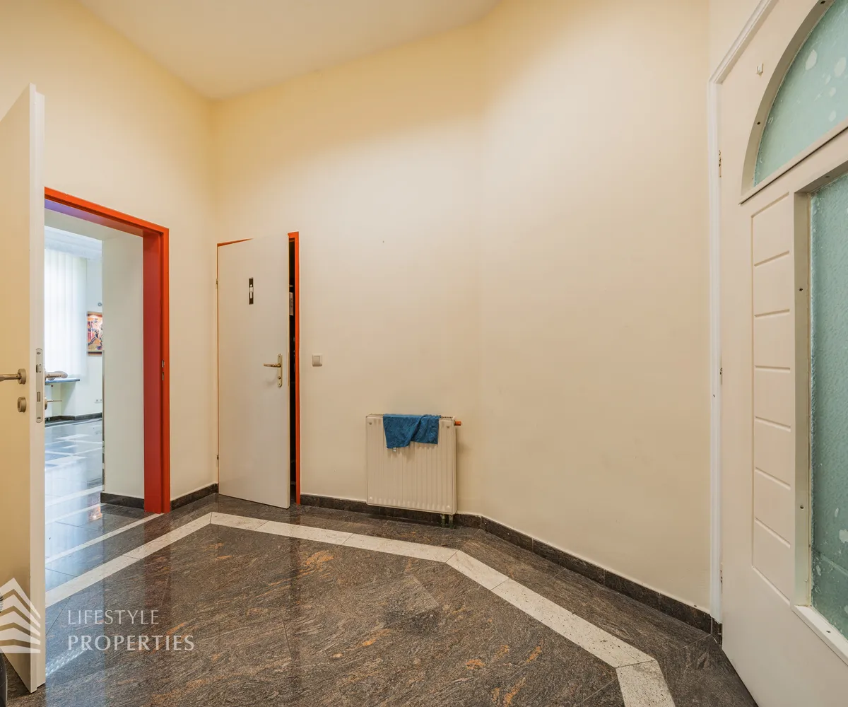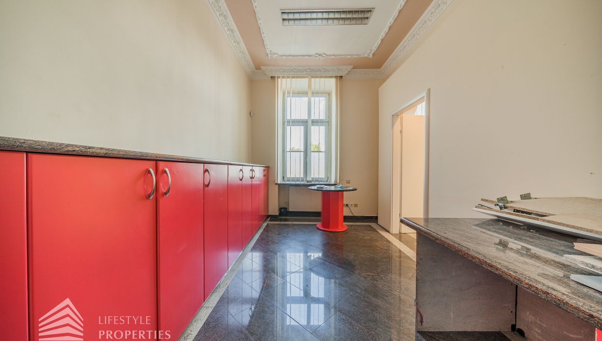 Die Bürofläche mit einer Gesamtnutzfläche von ca. 164 m² befindet sich im Erdgeschoss eines altehrwürdigen Hauses aus der Jahrhundertwende. Das Büro befindet sich an der Ecke und liegt somit auf zwei Straßenseiten, wovon die Eingangstüre mittig gelegen ist. Bereits bei Betreten imponiert sowohl der Stuck und die teils indirekte Beleuchtung, als auch der Marmorboden mit kunstvollen Einlegearbeiten. Harmonische Farben ziehen sich durch das gesamte Objekt und sogar die zwei getrennten Toiletten wurden höchst anspruchsvoll mit Marmor und Granit verkleidet. Neun Fenster sowie der vorgelagerte Park sorgen für ausreichend Tageslicht. Viele der ursprünglichen Zimmer wurden dahingehend verändert, sodass Sie heute zwei großzügige Räume links und rechts vom Eingang erwarten. Im Anschluss daran befinden sich noch kleinere Räume, wovon einer mit einer Glastür getrennt wurde. Die Küche und die beiden getrennten Toiletten liegen zentral in der Mitte des Objekts. Einige weitere Räume dienen als perfekte Lagerräume. Im hinteren Teil, über einen Gang finden Sie einen Ausgang Richtung Hof des Hauses. .