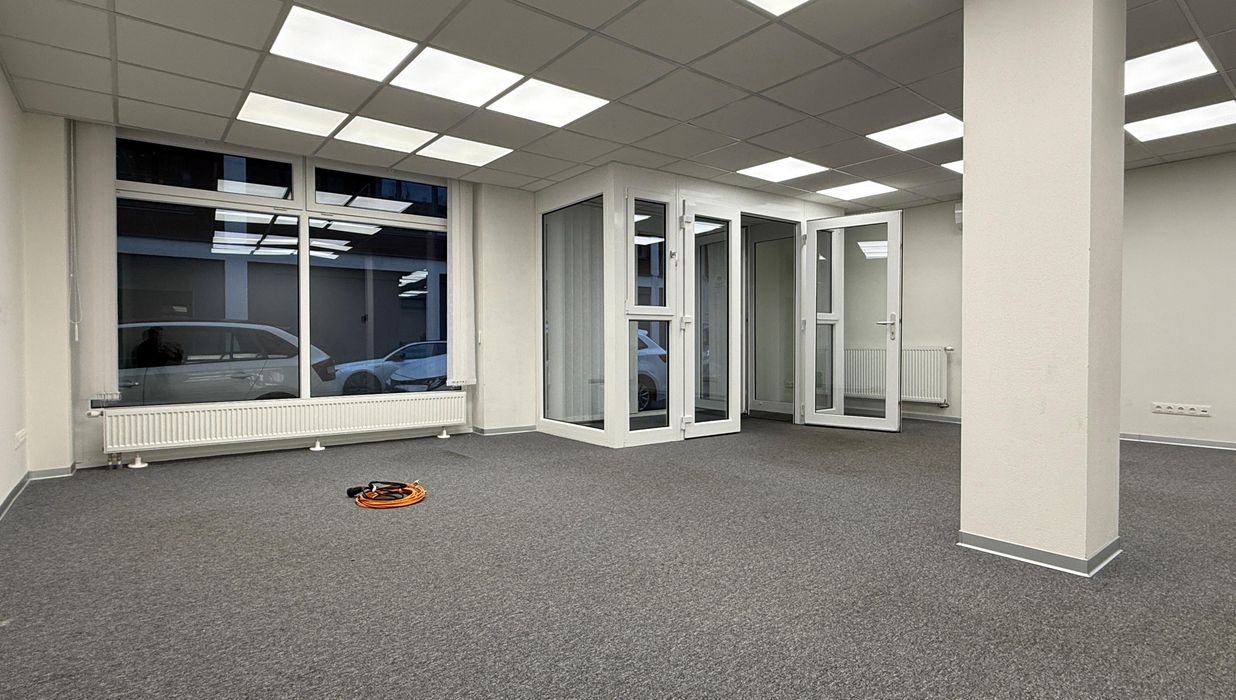 Ein besonderes Highlight ist die große Glasfläche zur Straße hin, die für viel Tageslicht sorgt und dem Büro eine offene, gut sichtbare Präsenz verleiht. Der großzügige Hauptraum bietet vielfältige Nutzungsmöglichkeiten und wird durch einen separaten Besprechungs- bzw. Seminarraum ergänzt, der sich optimal für Meetings, Kundentermine oder konzentriertes Arbeiten eignet. Die vorhandene Klimaanlage sorgt dabei ganzjährig für ein angenehmes Arbeitsklima.