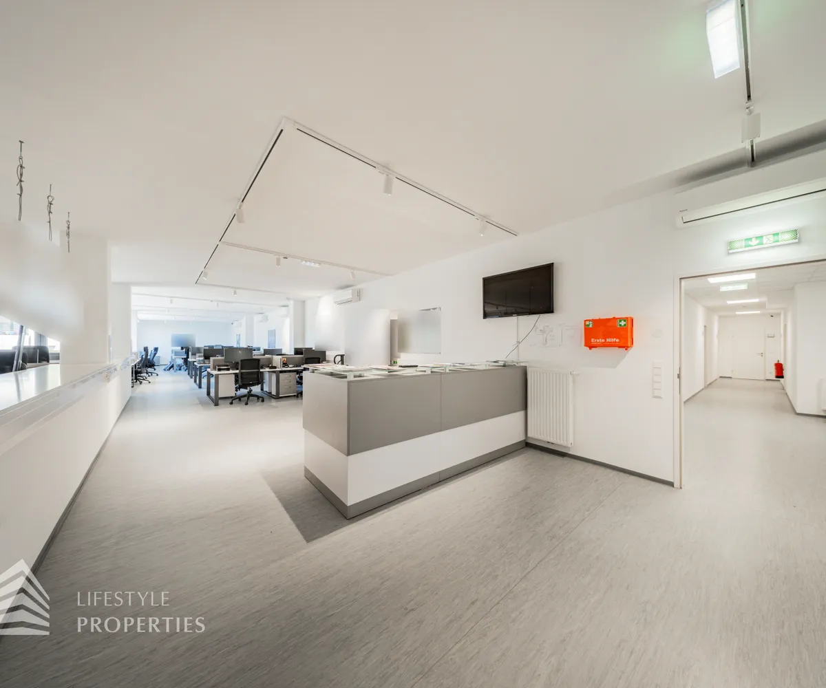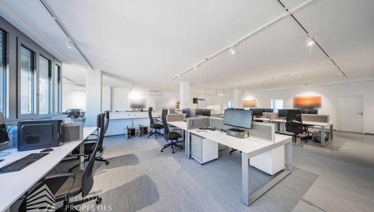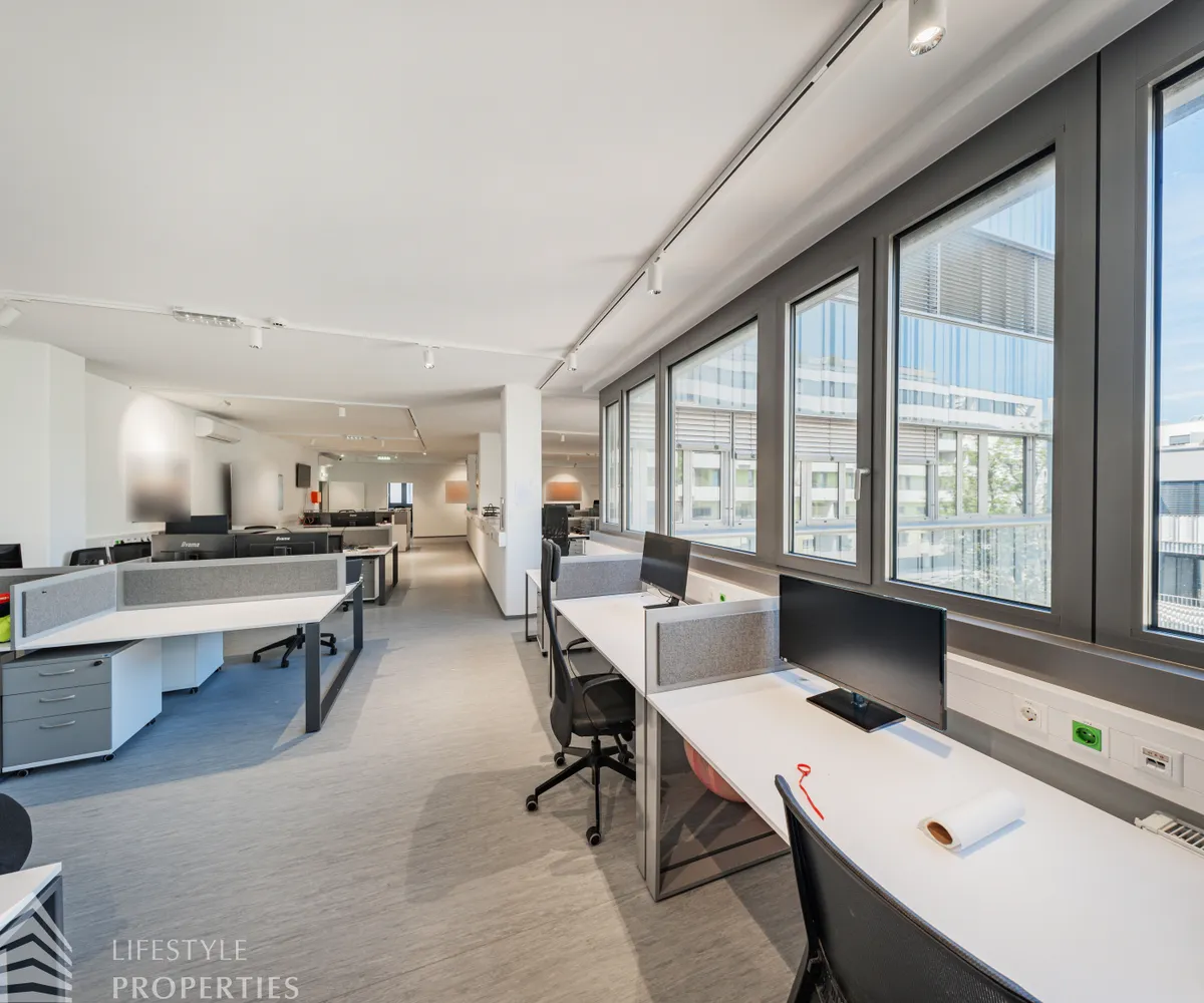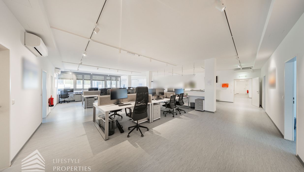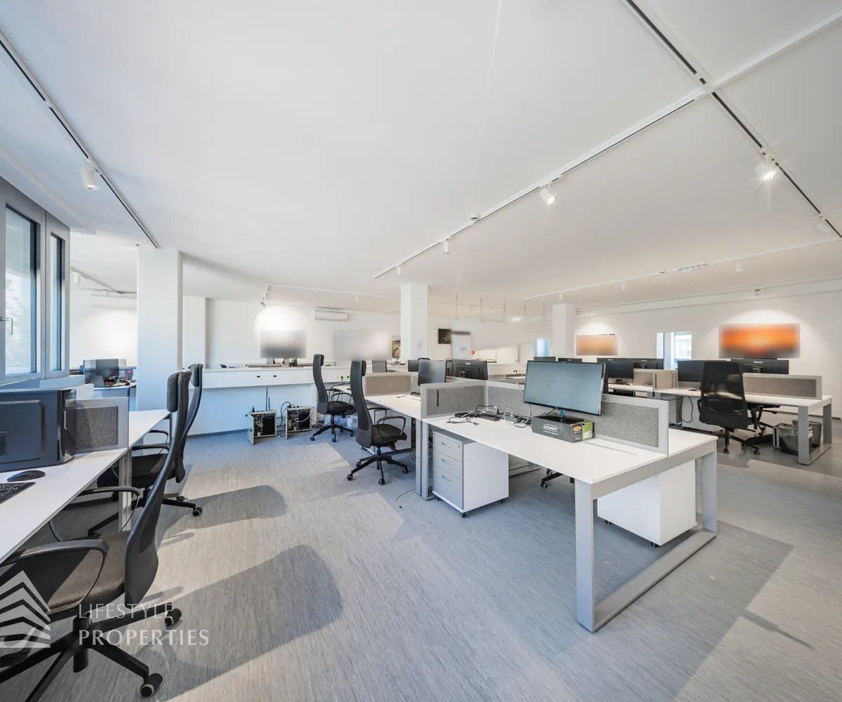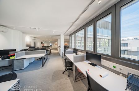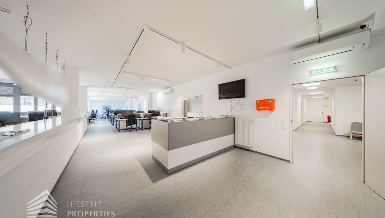 Die moderne Bürofläche befindet sich im 3. Stockwerk eines Neubaugebäudes und verfügt über ca. 697 m². Bei der Ausstattung wird auf moderne Technik und großem Komfort viel Wert gelegt. Dies beinhaltet zum Beispiel die unsichtbare Verkabelung im Boden, die Kameras sowie die Möglichkeit die Räume individuell zu klimatisieren. Die Immobilie besticht durch die ideale Lage und Anbindung an den öffentlichen Verkehr.