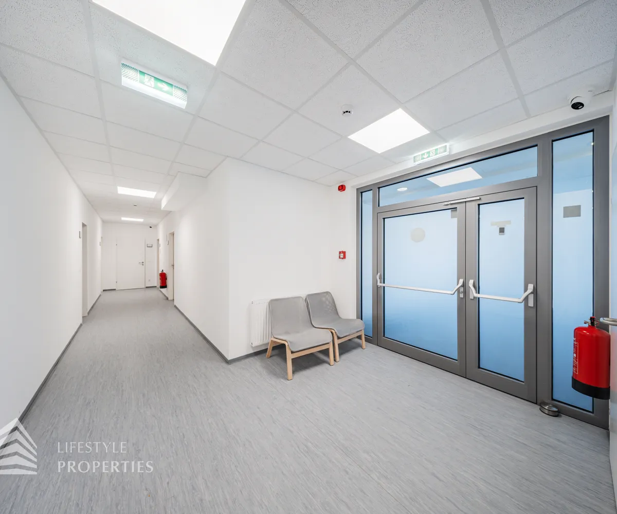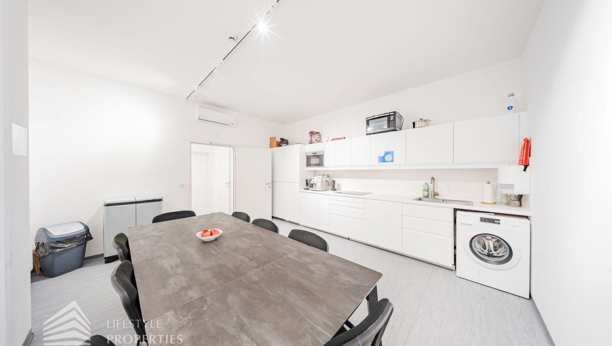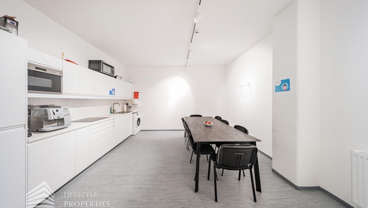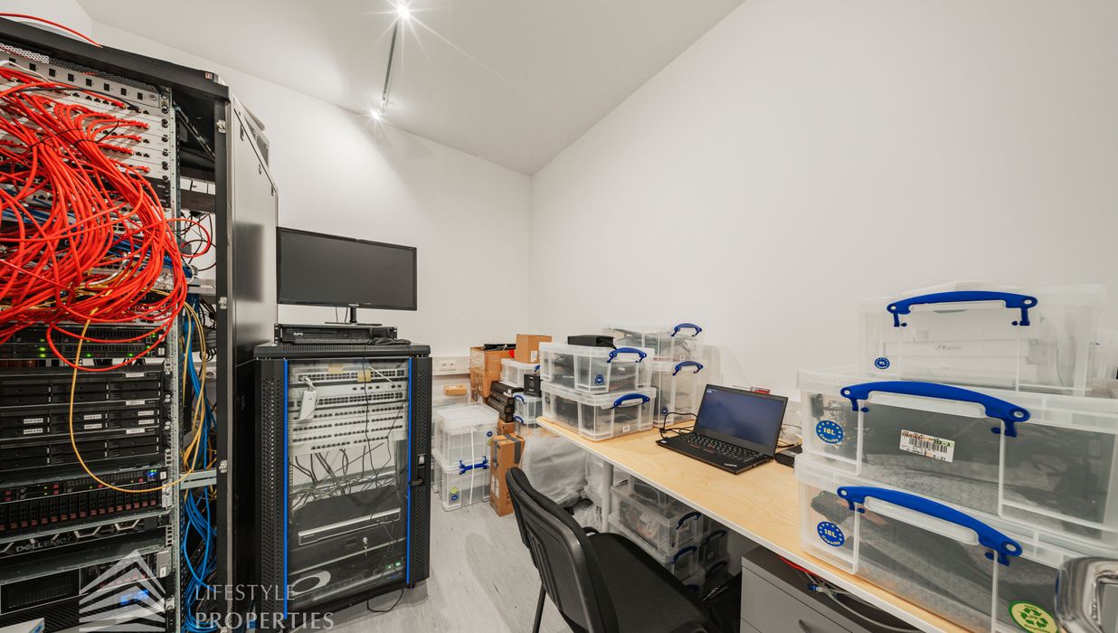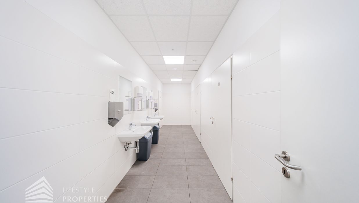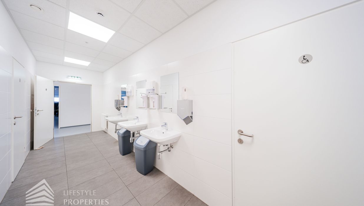 Sie betreten die Immobilie und befinden sich direkt beim ca. 20 m² großen Empfang. Links vom Empfang erreicht man den ca. 207,74 m² offenen Büroraum, von diesen man fünf weitere Büroräume und den Serverraum betreten kann. Es besteht somit die Option eine bedeutende Anzahl an Arbeitsplätzen einzurichten. Geradeaus vom Empfang gelangt man über einen Gang zu zwei weiteren Büroräumen mit einer Größe von 61,40 m² und 39,41 m². Rechts vom Empfang gelangt man sowohl zu zwei Büroräume von 48,82 m² und 41,55 m². Die vielen Fenster sorgen für ausreichend Licht und eine angenehme und freundliche Arbeitsatmosphäre. Ein Abstellraum sowie fünf separate WCs und eine großflächige Einbauküche, die ebenfalls als Sozialraum genutzt werden kann, sind ebenso vorhanden.