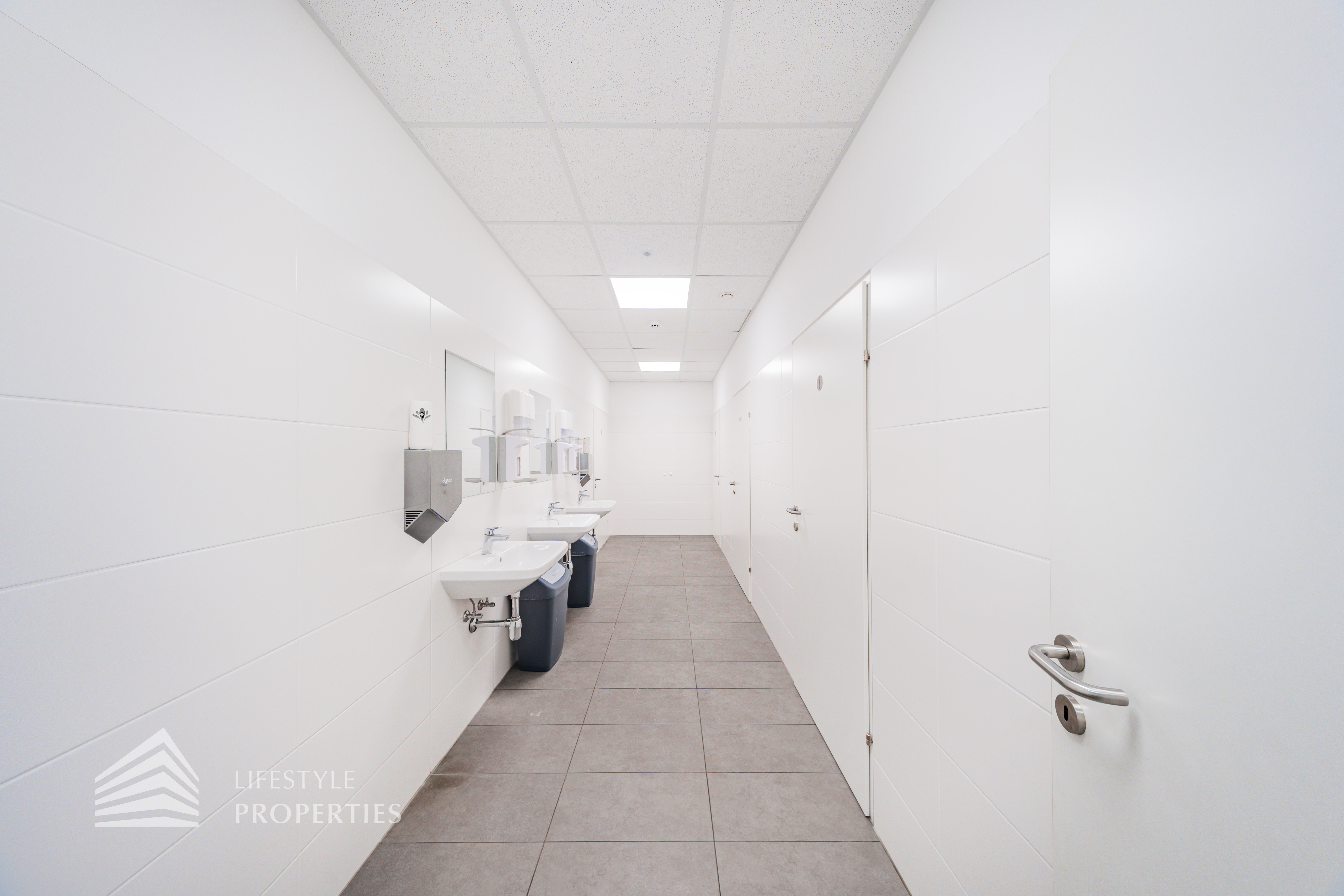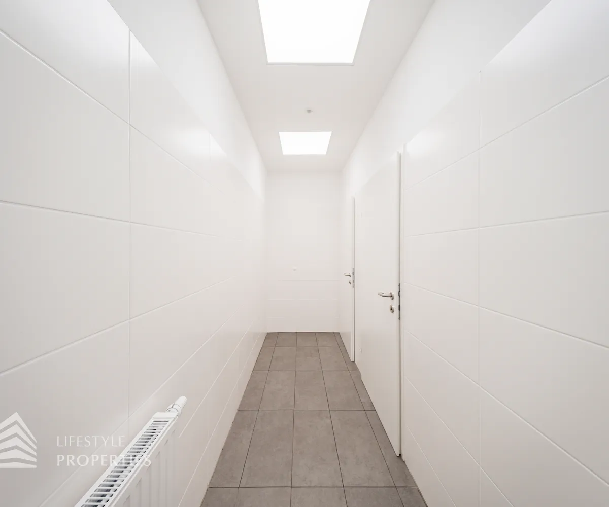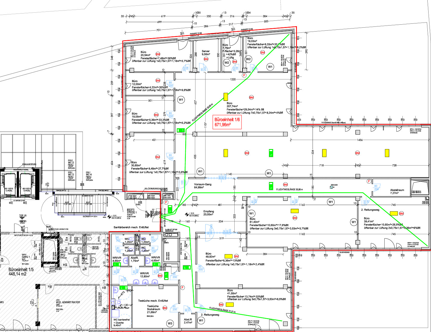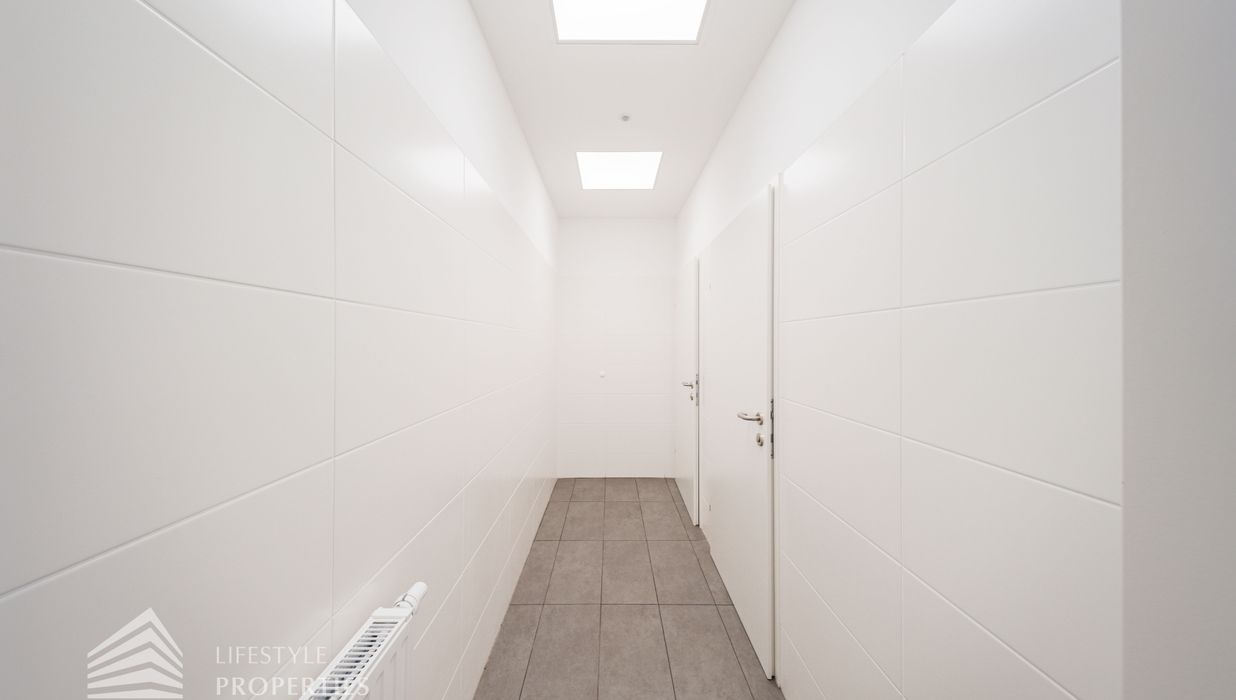 Sie betreten die Immobilie und befinden sich direkt beim ca. 20 m² großen Empfang. Links vom Empfang erreicht man den ca. 207,74 m² offenen Büroraum, von diesen man fünf weitere Büroräume und den Serverraum betreten kann. Es besteht somit die Option eine bedeutende Anzahl an Arbeitsplätzen einzurichten. Geradeaus vom Empfang gelangt man über einen Gang zu zwei weiteren Büroräumen mit einer Größe von 61,40 m² und 39,41 m². Rechts vom Empfang gelangt man sowohl zu zwei Büroräume von 48,82 m² und 41,55 m². Die vielen Fenster sorgen für ausreichend Licht und eine angenehme und freundliche Arbeitsatmosphäre. Ein Abstellraum sowie fünf separate WCs und eine großflächige Einbauküche, die ebenfalls als Sozialraum genutzt werden kann, sind ebenso vorhanden.