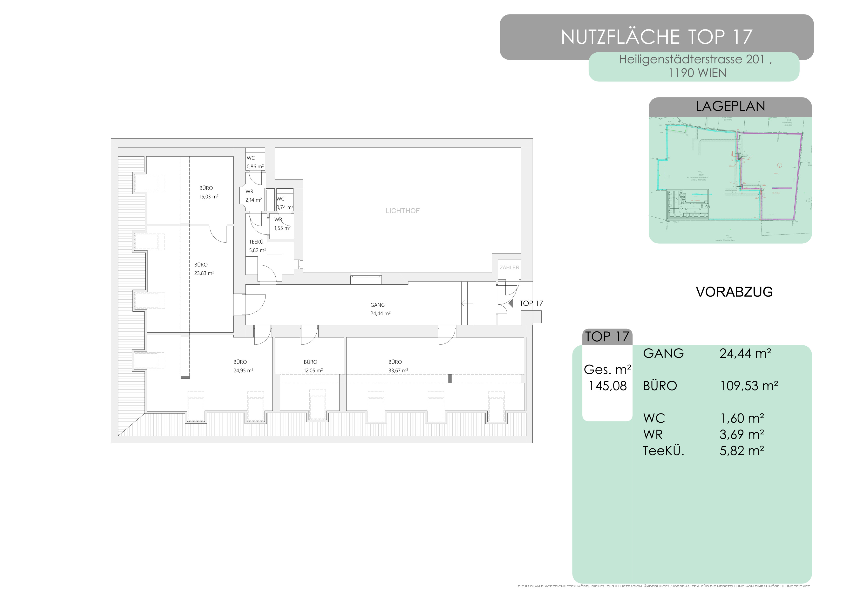 Die Bürofläche befindet sich im 19. Wiener Gemeindebezirk in unmittelbarer Nähe zum Nußdorfer Platz. Der Standort verfügt über eine gut ausgebaute Infrastruktur. Einkaufsmöglichkeiten des täglichen Bedarfs sowie Schulen und weitere Einrichtungen sind fußläufig erreichbar. Die Anbindung an den öffentlichen Verkehr (Bus, Straßenbahn, Bahn) sowie an das übergeordnete Straßennetz ist gegeben.