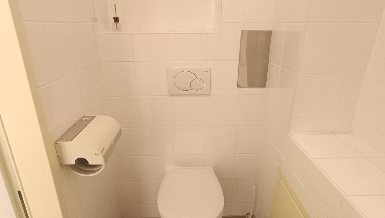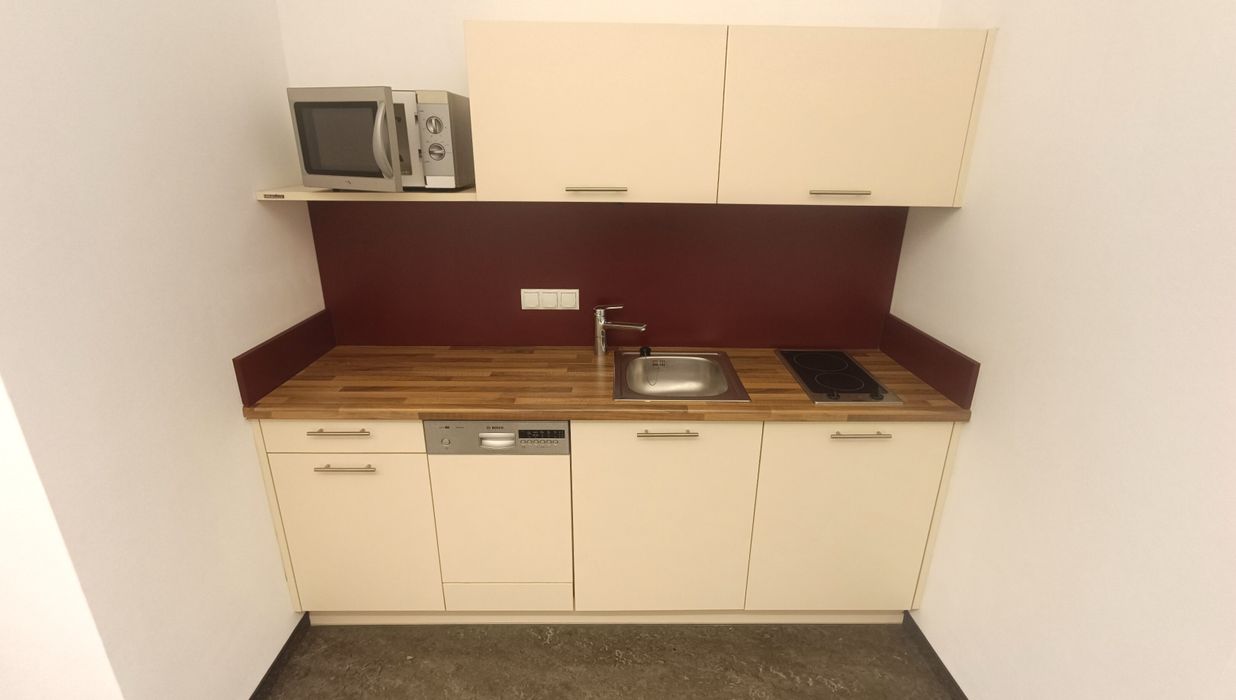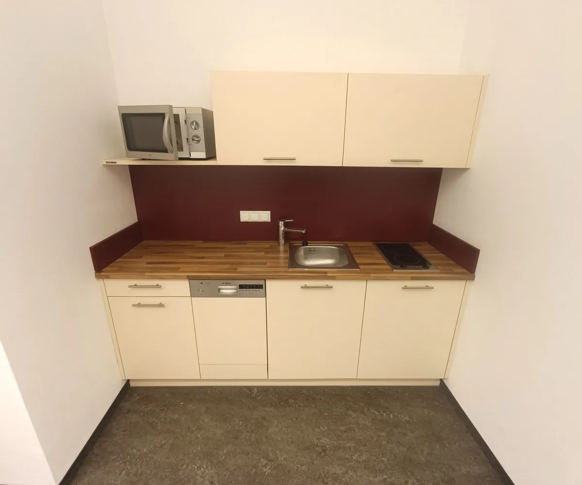 Vom Vorraum aus zu erreichen sind die Gäste-Toilette mit Handwaschbecken und ein weiterer Raum mit verbauter Einbauküche und Serverraum. Die Gesamtfläche (Inklusive Serverraum) beträgt rund 18,73 m² und bietet die Möglichkeit für weitere Arbeitsplätze. Die Einbauküche ist vollausgestattet und bietet Geschirrspüler, zwei Ceran-Kochfelder, Mikrowelle und Kühlschrank mit Gefrierfach alles was Sie für das entspannte Kochen oder den kleinen Snack zwischendurch benötigen.