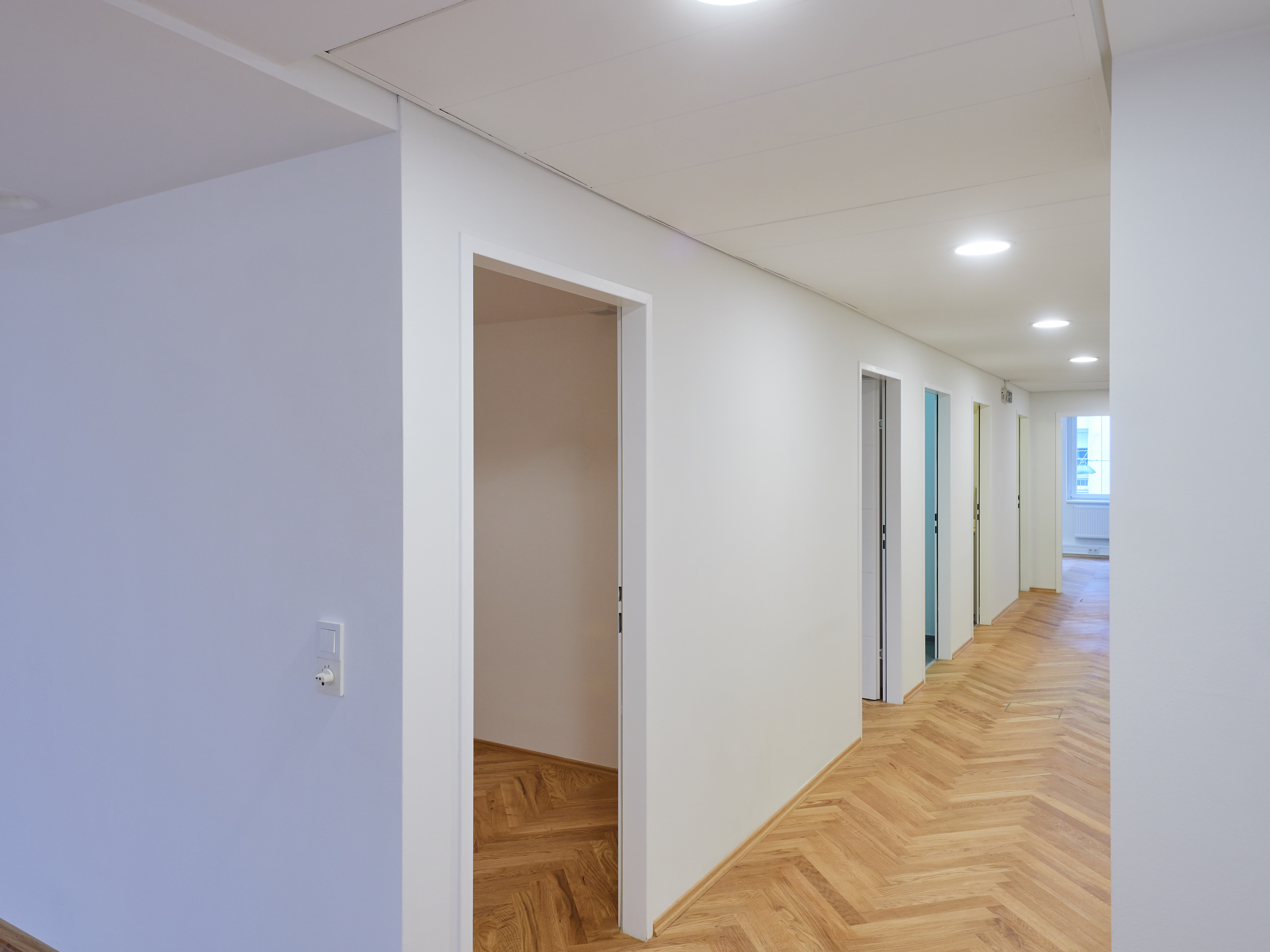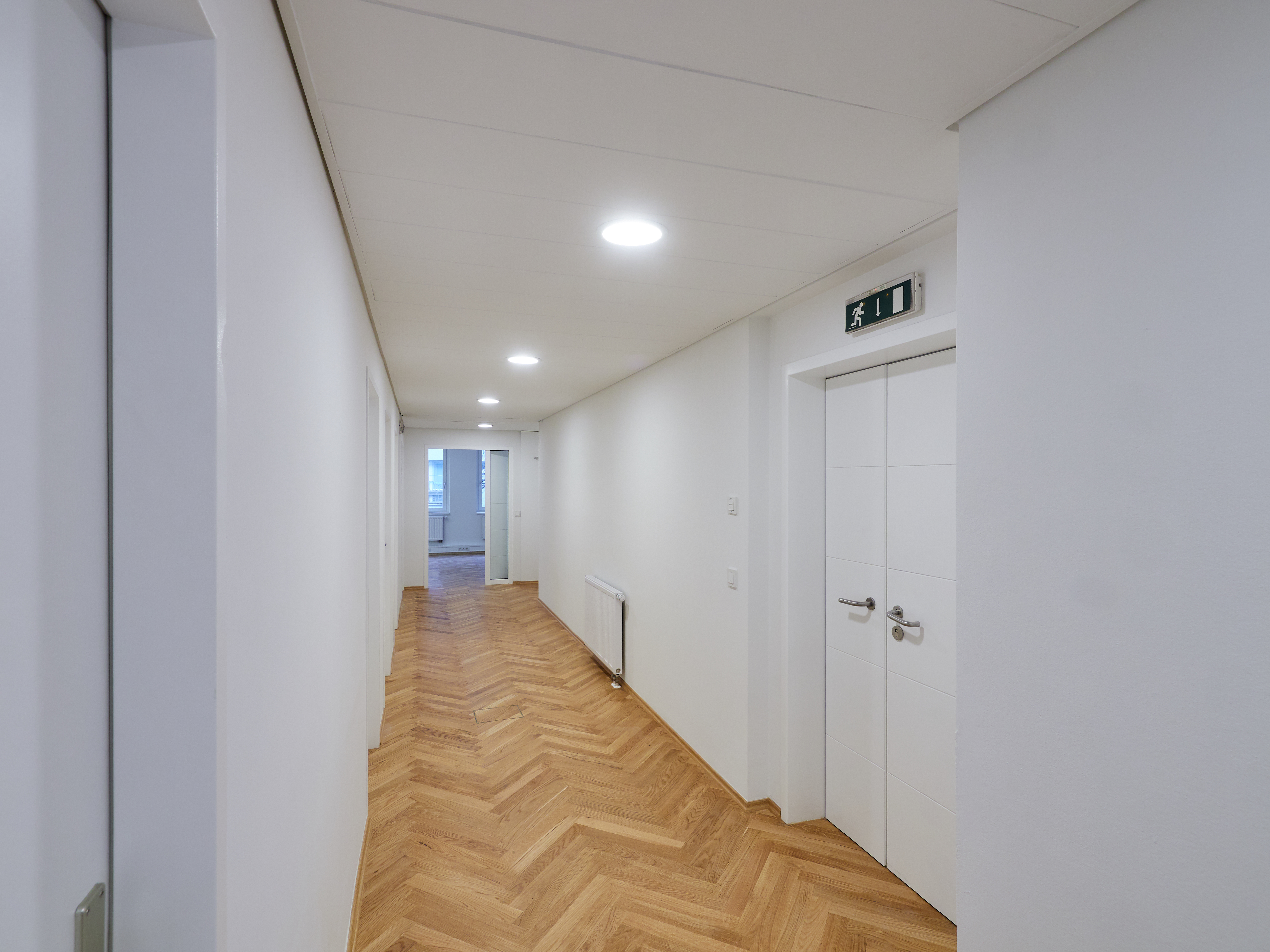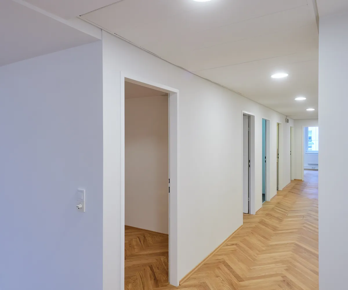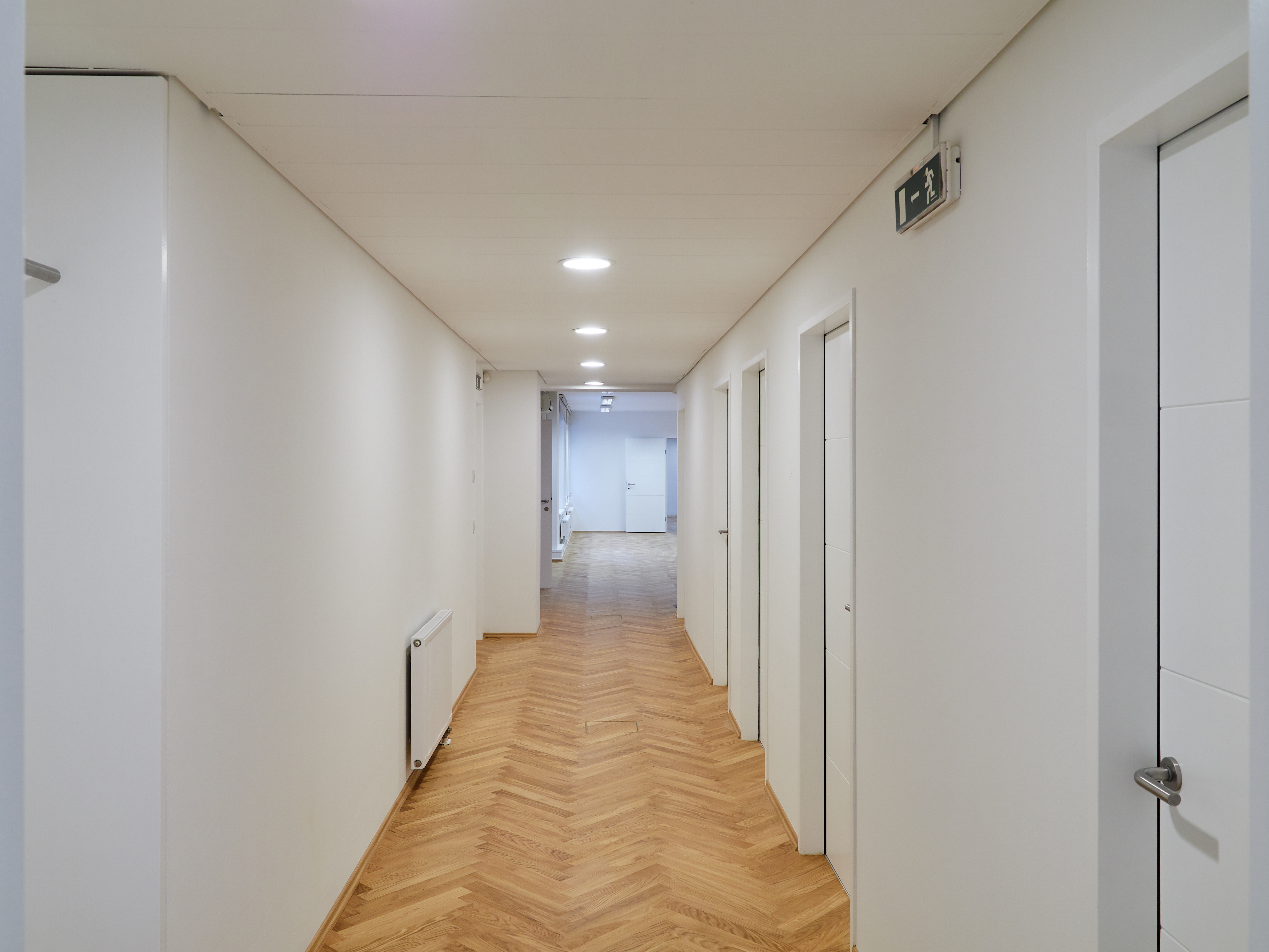 Die durchdachte Grundstruktur ermöglicht eine individuelle Anpassung an unterschiedliche Nutzungskonzepte – von klassischen Einzel- oder Doppelbüros bis hin zu strukturierten Praxisräumlichkeiten oder offenen Arbeitsbereichen.