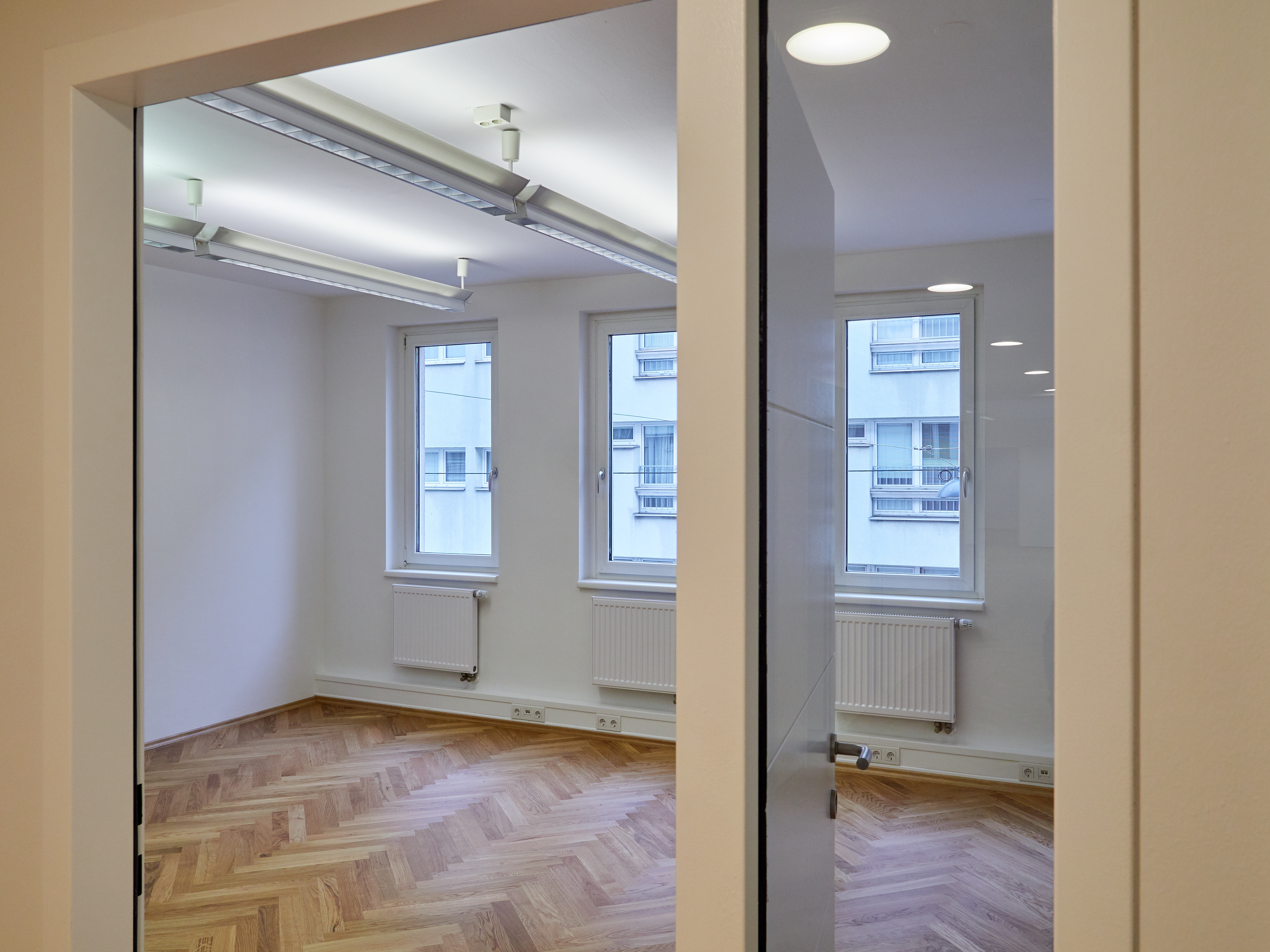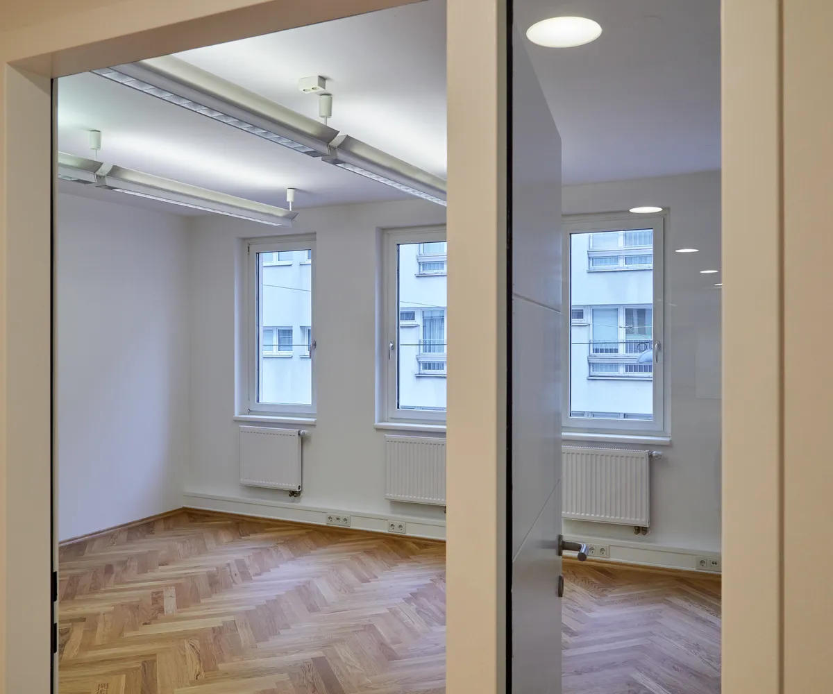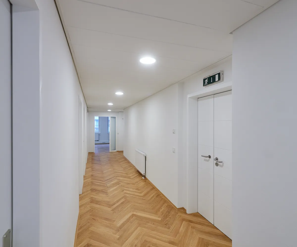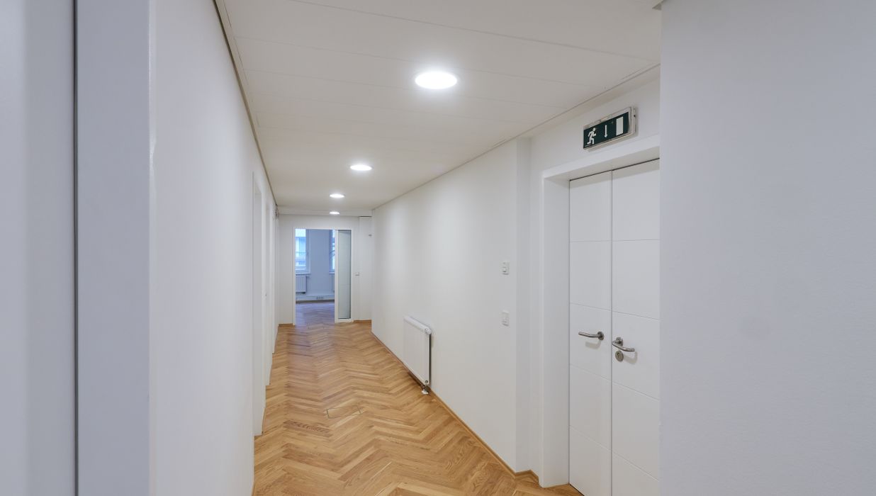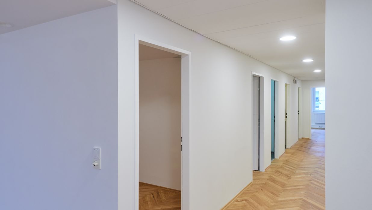 Die durchdachte Grundstruktur ermöglicht eine individuelle Anpassung an unterschiedliche Nutzungskonzepte – von klassischen Einzel- oder Doppelbüros bis hin zu strukturierten Praxisräumlichkeiten oder offenen Arbeitsbereichen.