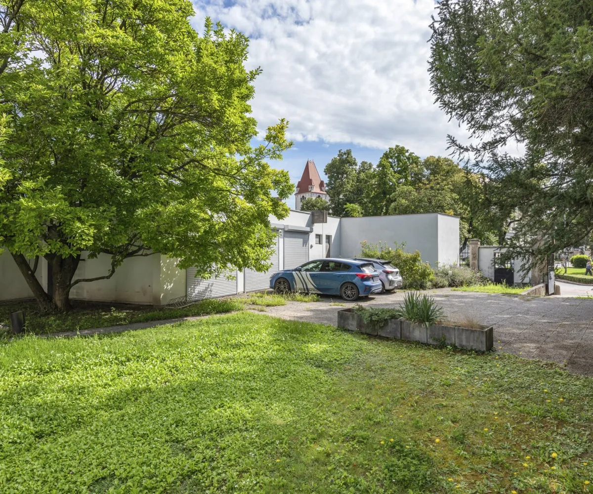 Über das zweiflügelige Stahltor zwischen massiven Naturpfeilern gelangt man in die Auffahrt zu dem Grundstück und der Einfahrt in die Garage. Der Vorplatz bietet ebenfalls Platz für mehrere PKW-Stellplätze . Neben dem Garagentrakt befindet sich ein noch nicht ausgebautes Geschäftslokal mit straßenseitigem Eingang, welches derzeit als Lager genutzt wird. Die restliche Grundstücksfläche in Richtung Süden ist eine gepflegte Grünfläche mit altem Nadelbaumbestand und Ziersträuchern.