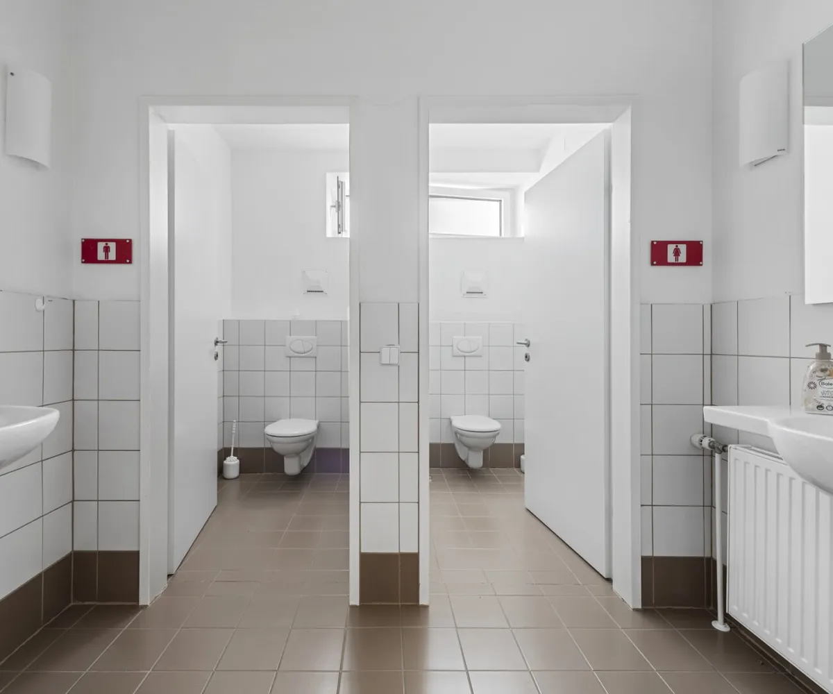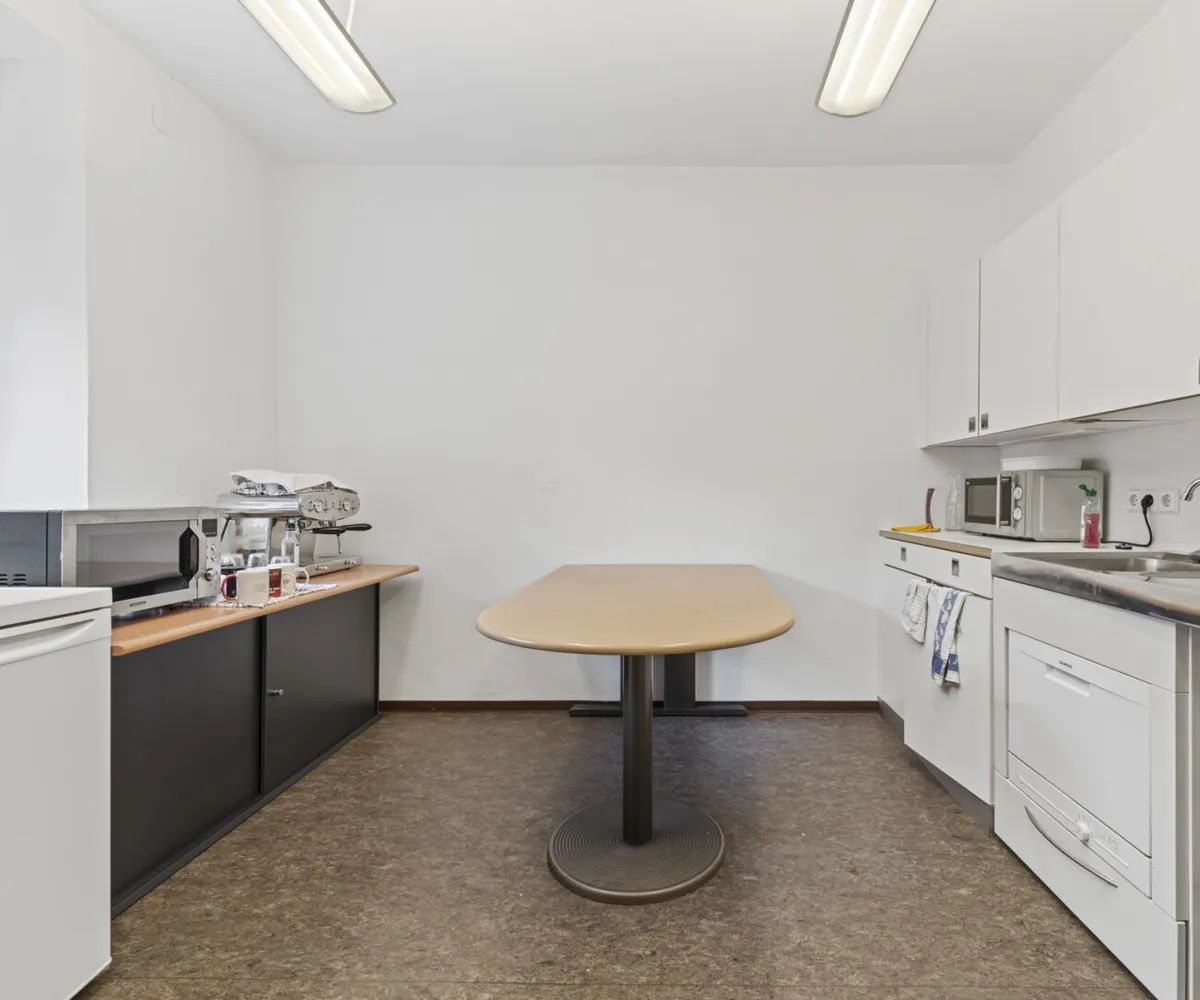 Das erste Obergeschoß beherbergt linkerhand das Chef-Büro mit Zugang zum Balkon sowie ein weiteres Zimmer und ein separates WC . Rechterhand befinden sich die Mitarbeiter-Sanitäranlagen , der Küchen-/Aufenthaltsbereich , ein Abstellraum sowie 4 Büros .