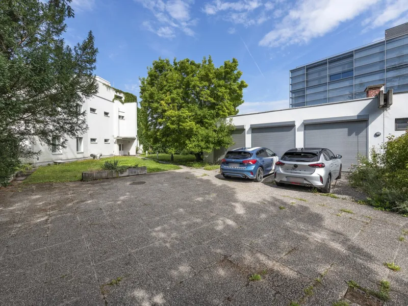Über das zweiflügelige Stahltor zwischen massiven Naturpfeilern gelangt man in die Auffahrt zu dem Grundstück und der Einfahrt in die Garage. Der Vorplatz bietet ebenfalls Platz für mehrere PKW-Stellplätze . Neben dem Garagentrakt befindet sich ein noch nicht ausgebautes Geschäftslokal mit straßenseitigem Eingang, welches derzeit als Lager genutzt wird. Die restliche Grundstücksfläche in Richtung Süden ist eine gepflegte Grünfläche mit altem Nadelbaumbestand und Ziersträuchern.