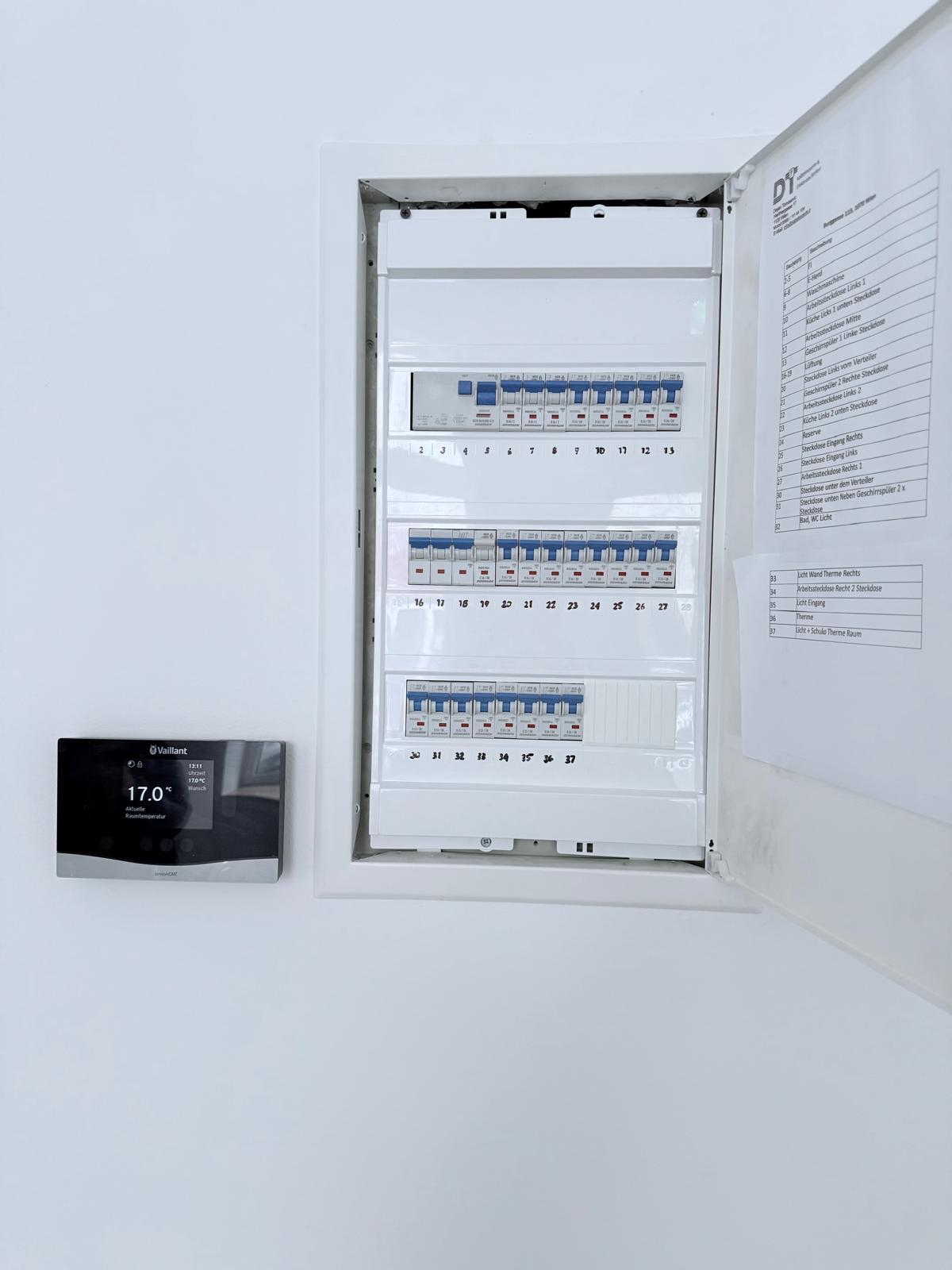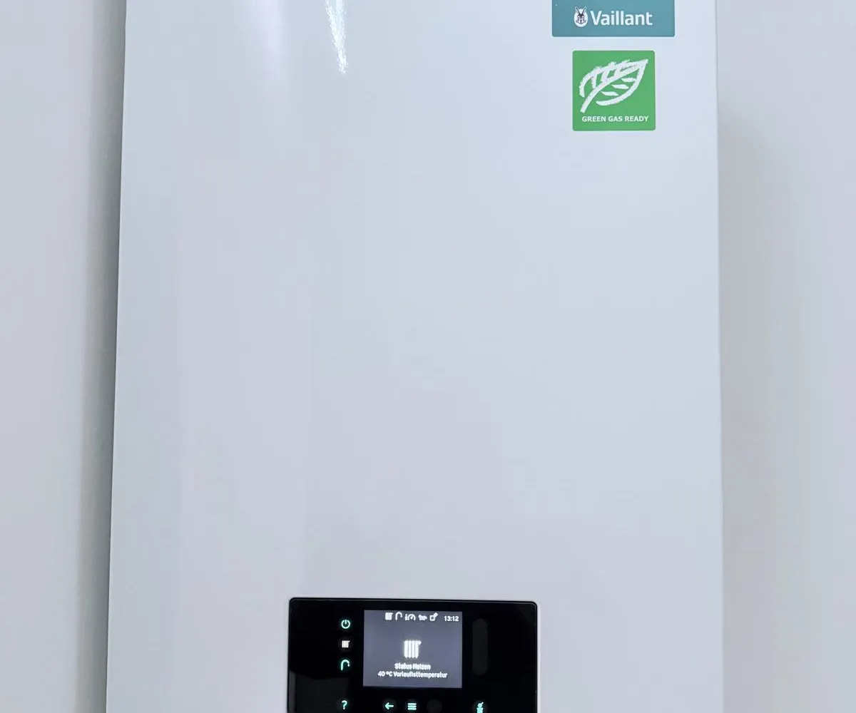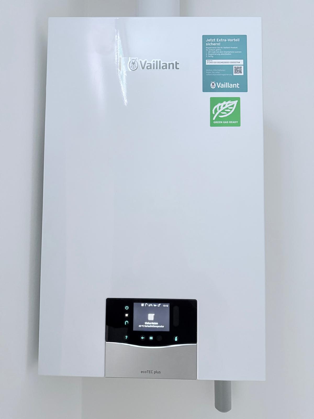 Beheizt wird es mittels einer Gasetagenheizung, und zwar durch eine kamingebundene Vaillant-Therme!