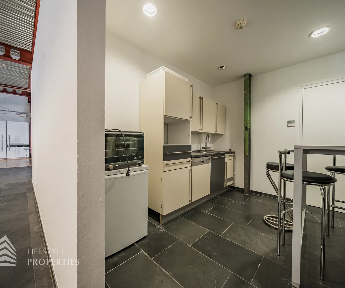 Das Geschäftslokal zeichnet sich durch die offene Raumgestaltung aus. Viele große Fenster versorgen die Räumlichkeiten mit viel Licht und präsentieren die Ware in bestem Licht. Die Küche ist mit allen notwendigen Geräten ausgestattet und verfügt über ausreichend Stauraum. Die Fotos zeigen die Räumlichkeiten, wie sie damals ausgesehen haben, als sie für Bürozwecke bzw. Brautmodengeschäft genutzt wurden.