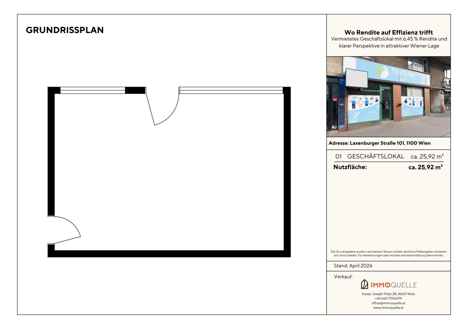 Das Lokal verfügt über eine Nutzfläche von ca. 25,92 m² und überzeugt durch eine kompakte, effizient gestaltete Raumaufteilung. Der offen geschnittene Hauptraum bildet das Zentrum der Immobilie und eignet sich sowohl ideal für ein Geschäft als auch für eine strukturierte Büronutzung.