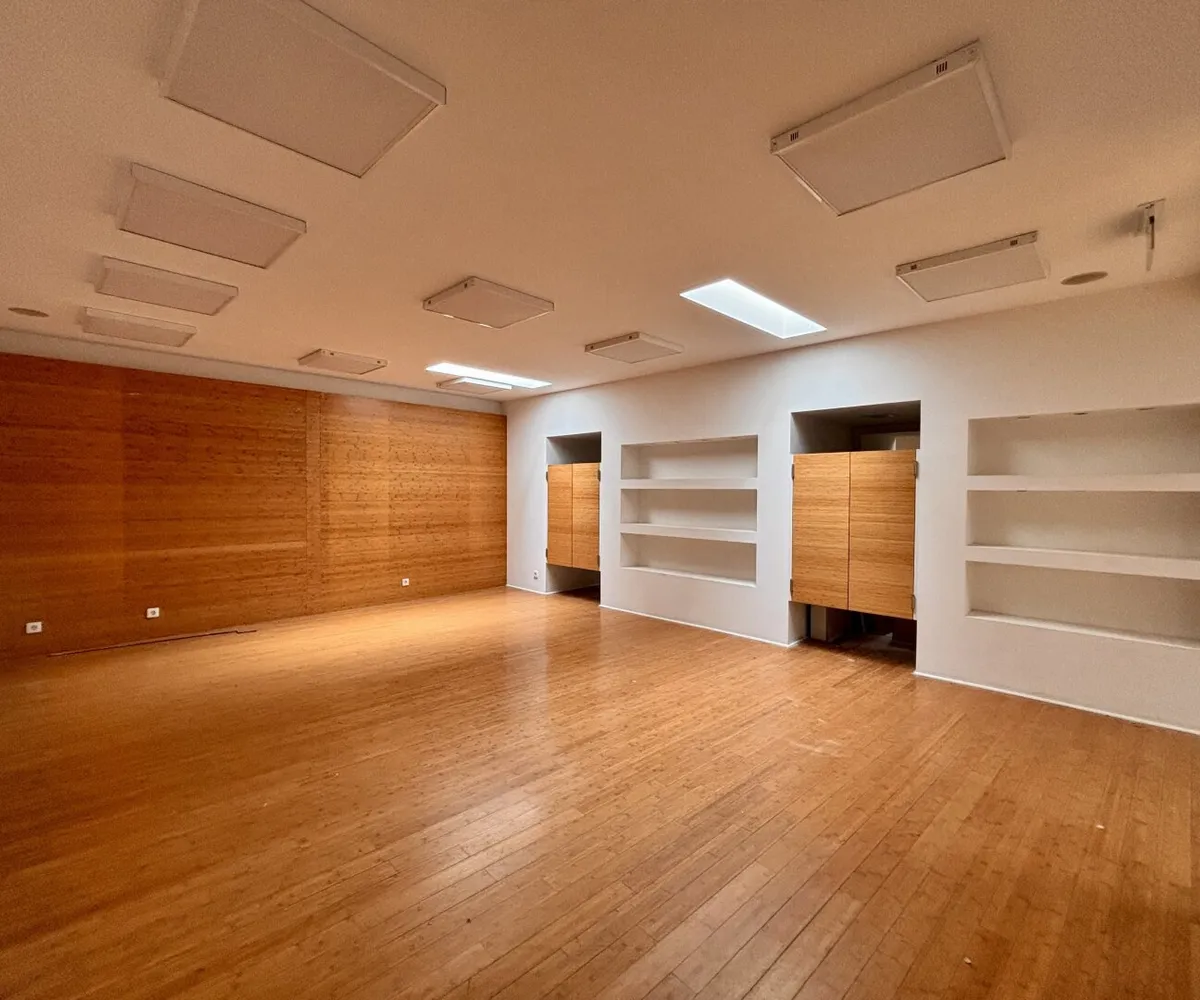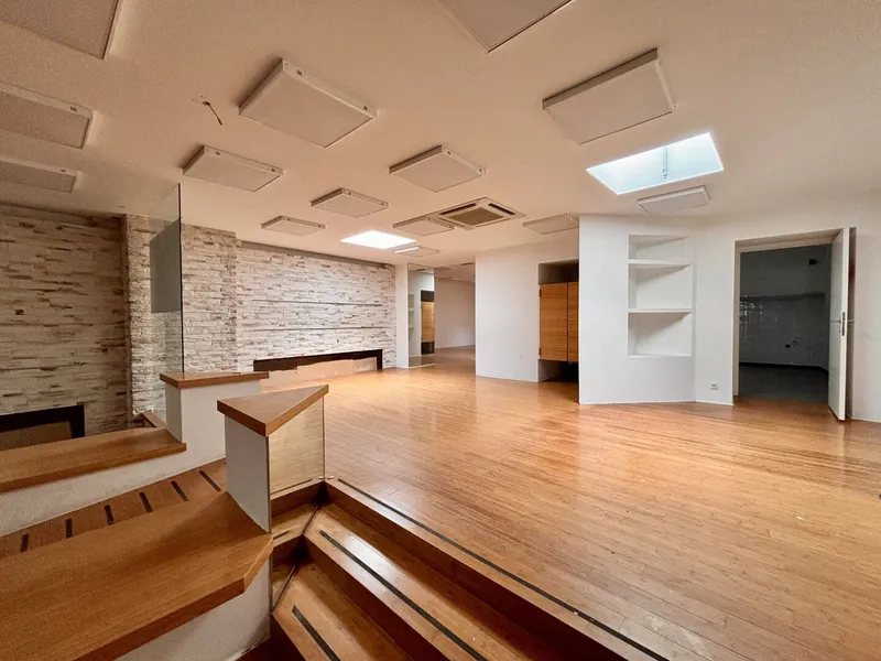 Schon auf den ersten Blick verraten die hochwertigen Glasportale (zwei Eingänge!) , dass sich auch im Inneren Stil und Qualität fortsetzen. Ursprünglich als Modestore konzipiert, finden sich noch Garderoben, Präsentationsflächen sowie eine Rampe für den barrierefreien Zugang zum hinteren Raum in der Immobilie – ebenso ein Mitarbeiterraum, in dem Platz für eine Teeküche und einen Besprechungsbereich gegeben ist sowie eine Mitarbeitertoilette. Die natürliche Belichtung (u.a. durch öffenbare Dachkuppeln) lässt die ca. 265 qm Gesamtfläche im Loftstil durchgehend glänzen und macht sie ideal für zahlreiche Nutzungsmöglichkeiten : vom Shop über ein Tanzstudio bis hin zur Schaffung von Büroflächen.
