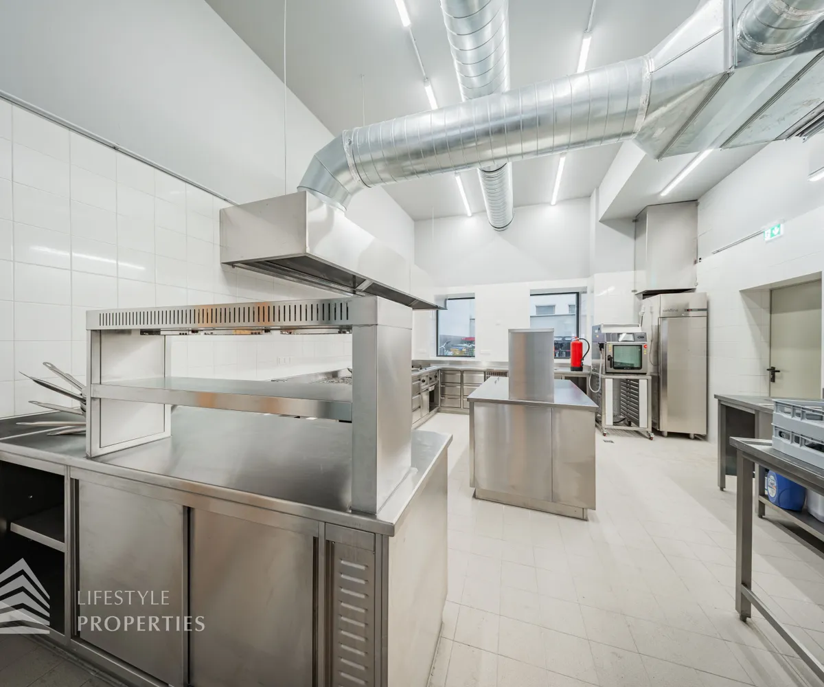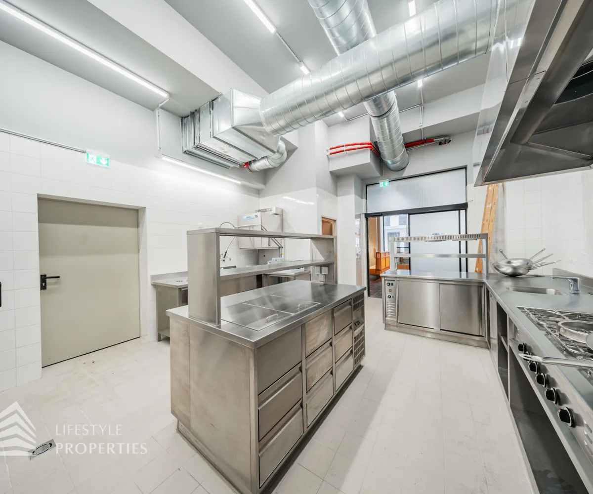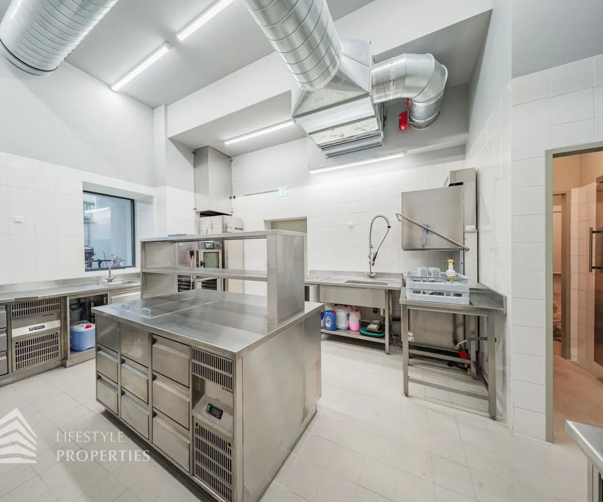 Durch eine elektrische Glastüre gelangt man in die hochwertige Gastro-Küche aus Edelstahl, diese mit allen Geräten ausgestattet ist und einen Gastronomen das Herz höher schlagen lässt.