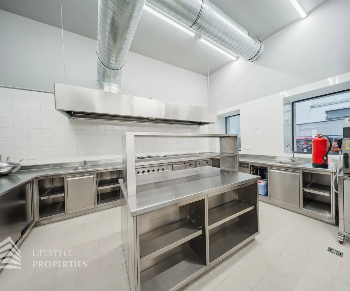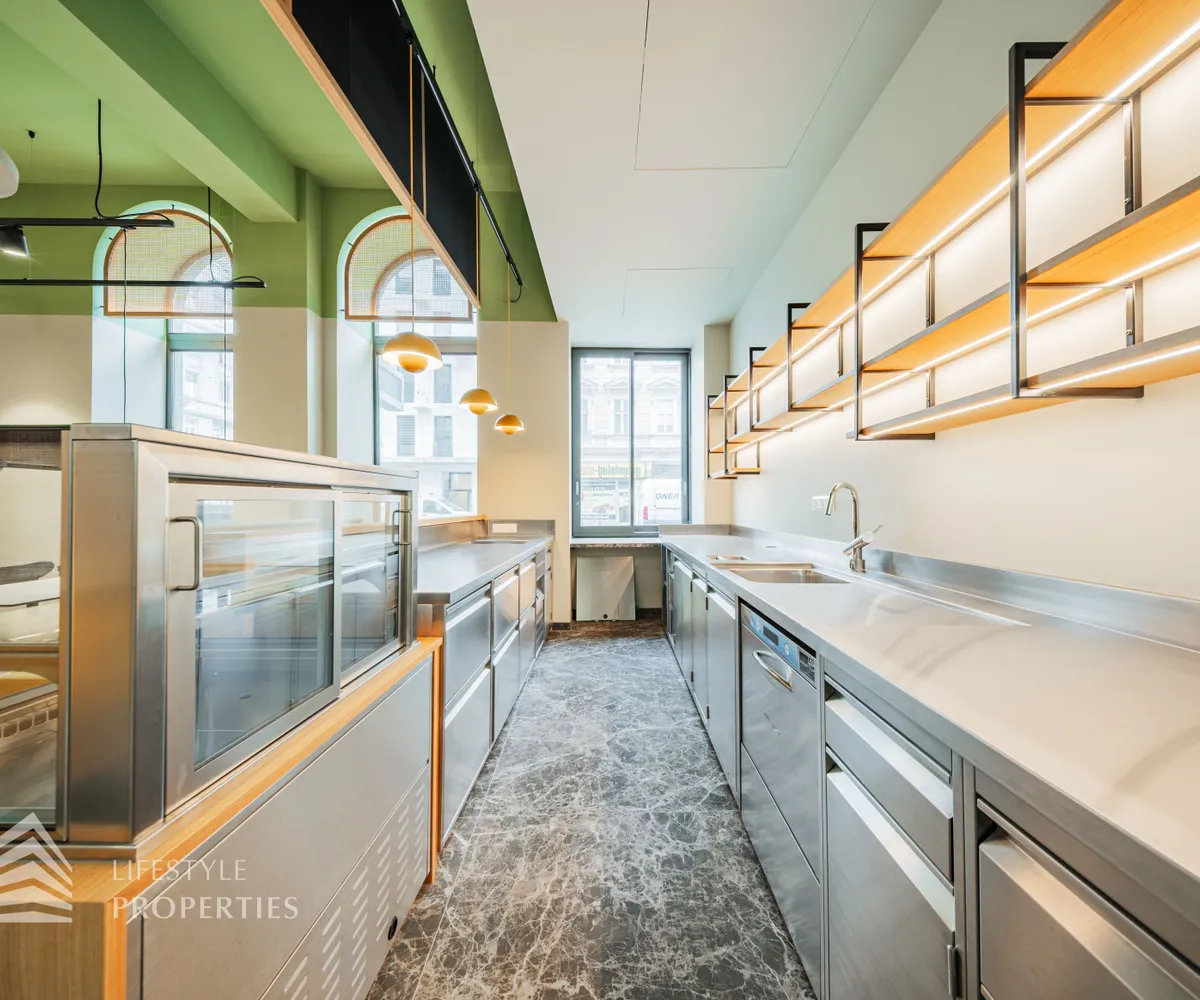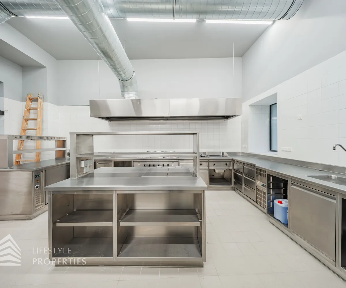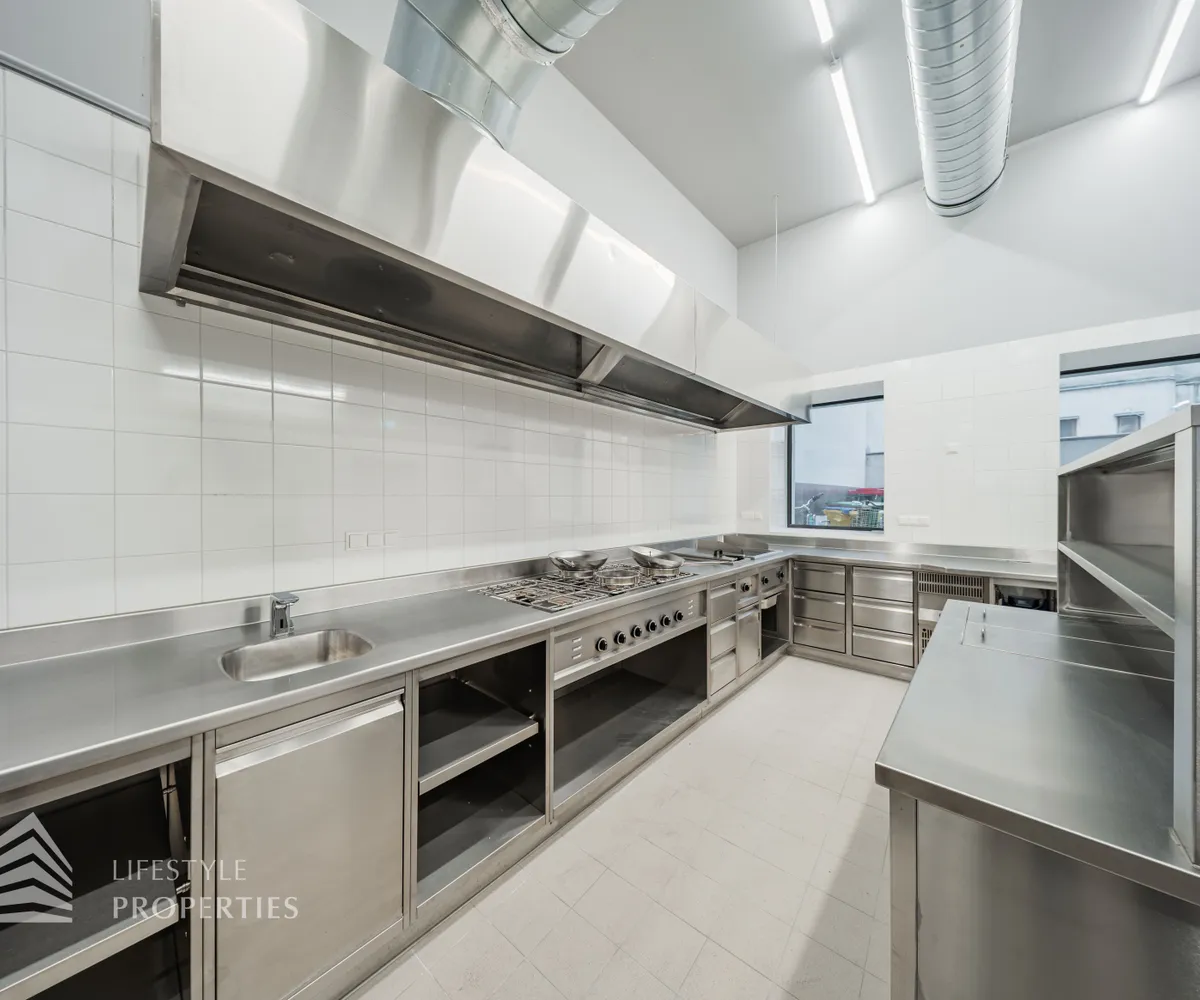 Durch eine elektrische Glastüre gelangt man in die hochwertige Gastro-Küche aus Edelstahl, diese mit allen Geräten ausgestattet ist und einen Gastronomen das Herz höher schlagen lässt.