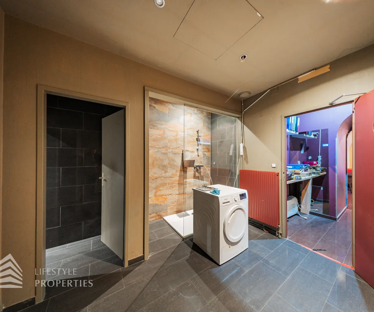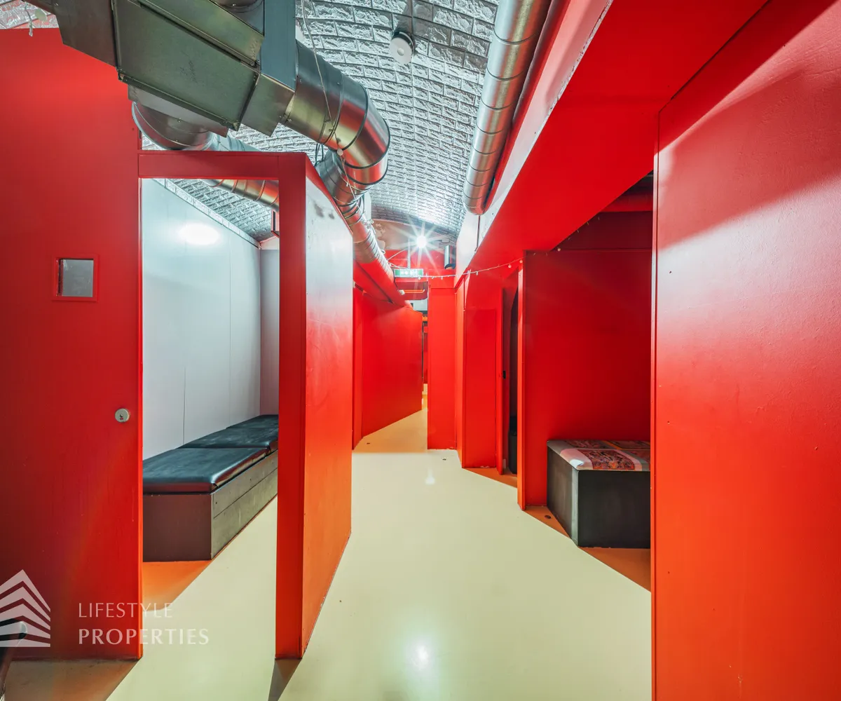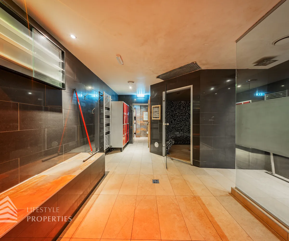 Das Objekt verfügt über eine vollausgestattete Küche mit Bar sowie über einen Saunabereich mit einer Finnischen Sauna und einem Dampfbad als auch einen Ruheraum. Des Weiteren gibt es geteilte Garderoben mit verschließbaren Spinten und ausreichend Duschen. Den Fitnessbereich kann man sowohl im Souterrain als auch im Keller auf verschiedene Flächen aufteilen. Es gibt auch abgetrennte Räume, diese sich für ein Solarium eignen.