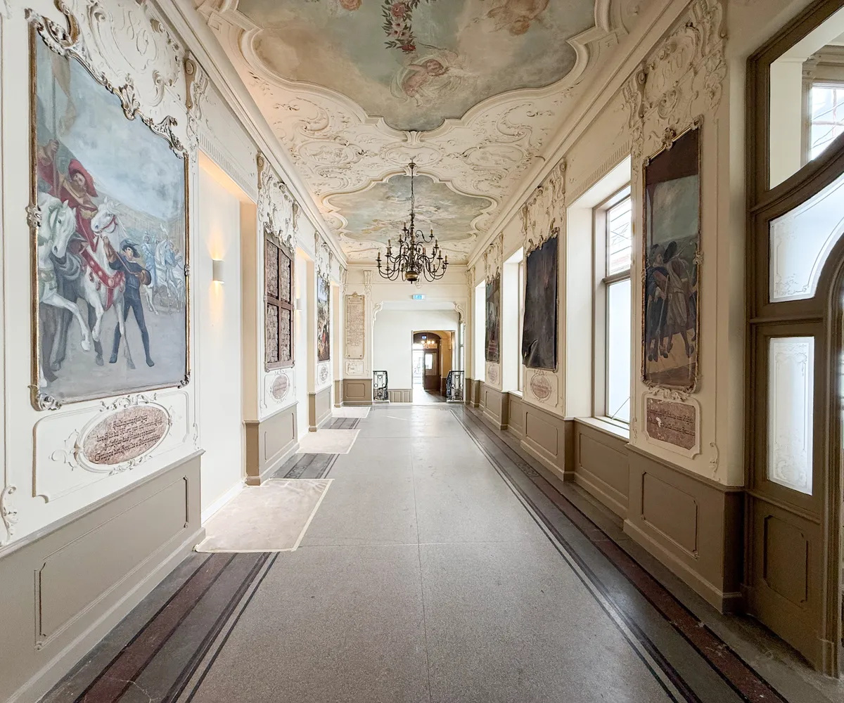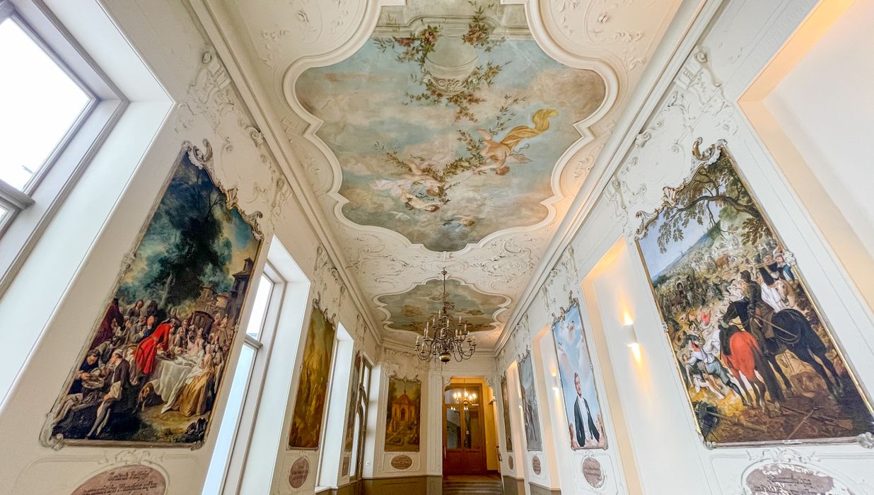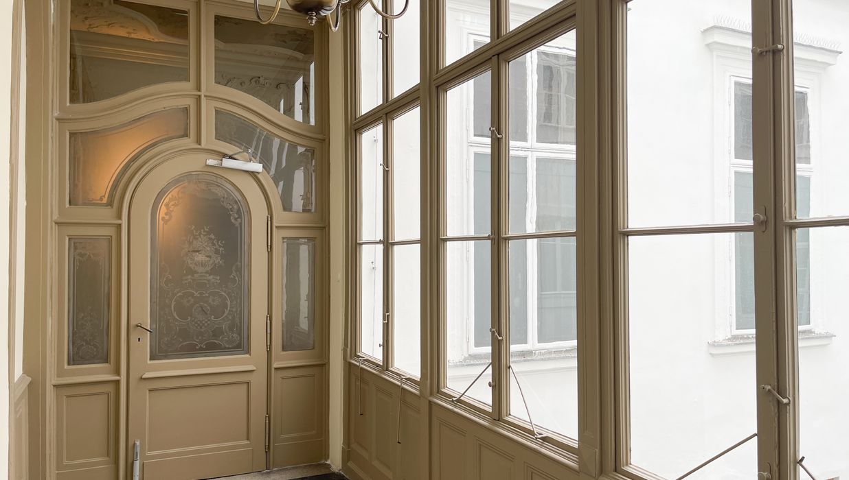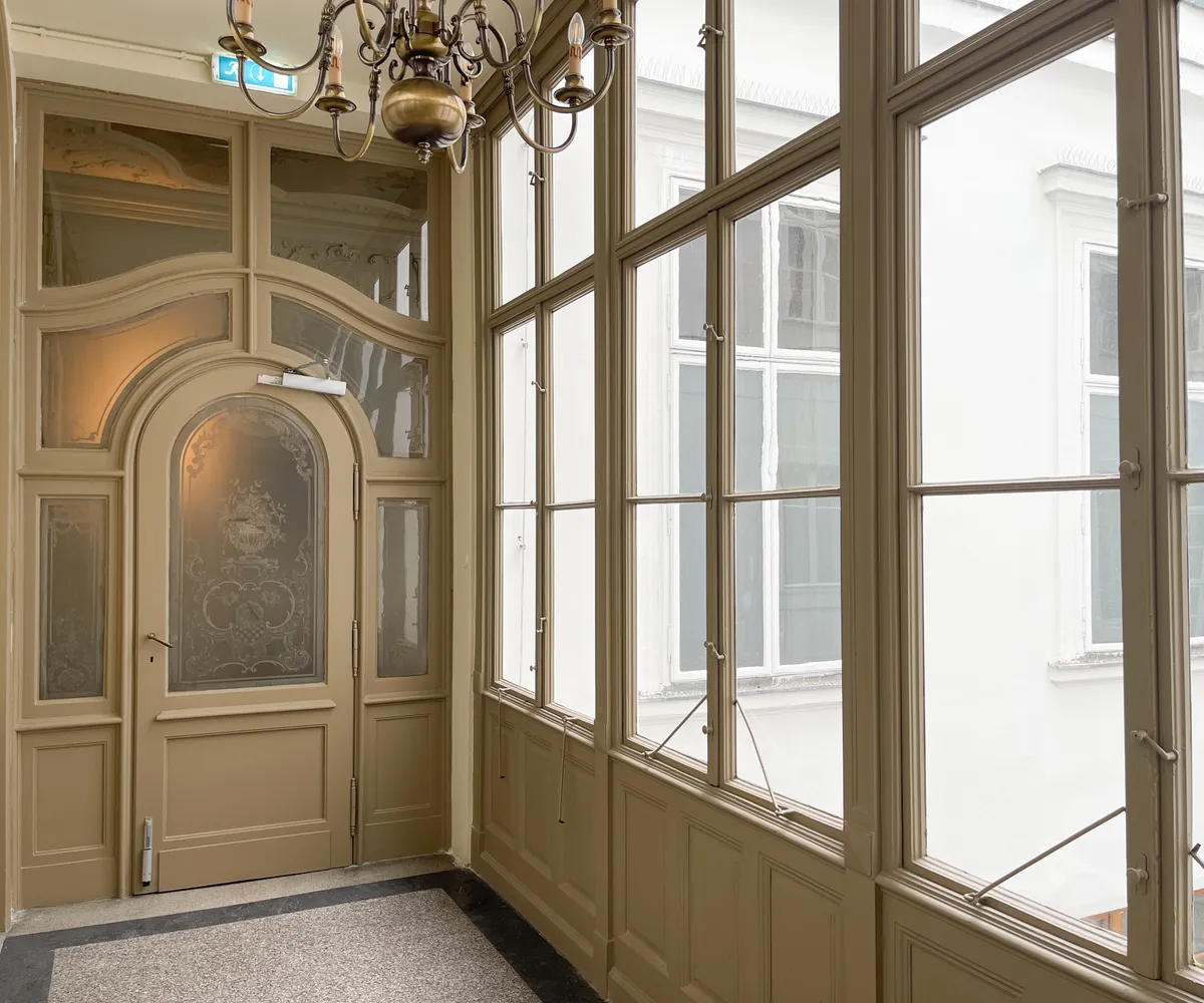 Historische Details – darunter Gemälde des Künstlers Adalbert Franz Seligmann im repräsentativen Vestibül – verleihen dem Haus eine unverwechselbare Identität.