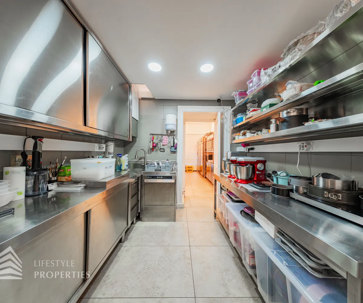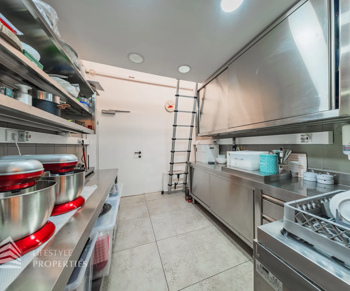 Die Ausstattung erfüllt professionelle Konditorei-Standards: ein professioneller Schockfroster bis −35 °C, zwei Kühlgeräte (ein- und zweiflügelig), großzügige Inox-Arbeitsflächen und eine GGM Gastro-Kücheneinrichtung, drei Backöfen, eine belüftete Vitrine mit Glas-Auslage, eine professionelle Geschirrspülmaschine mit Kurzprogrammen sowie leistungsstarke Mixsysteme (ein großer Mixer plus drei kleinere) und umfassendes Kleininventar. Rezepturen sind vorhanden. Ein separater Arbeitsbereich auf der über eine Leiter zugänglichen Galerie bietet zusätzlichen Platz zur Vorbereitung oder als Büro.