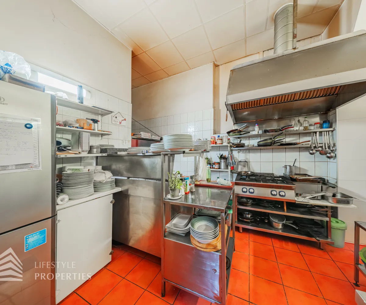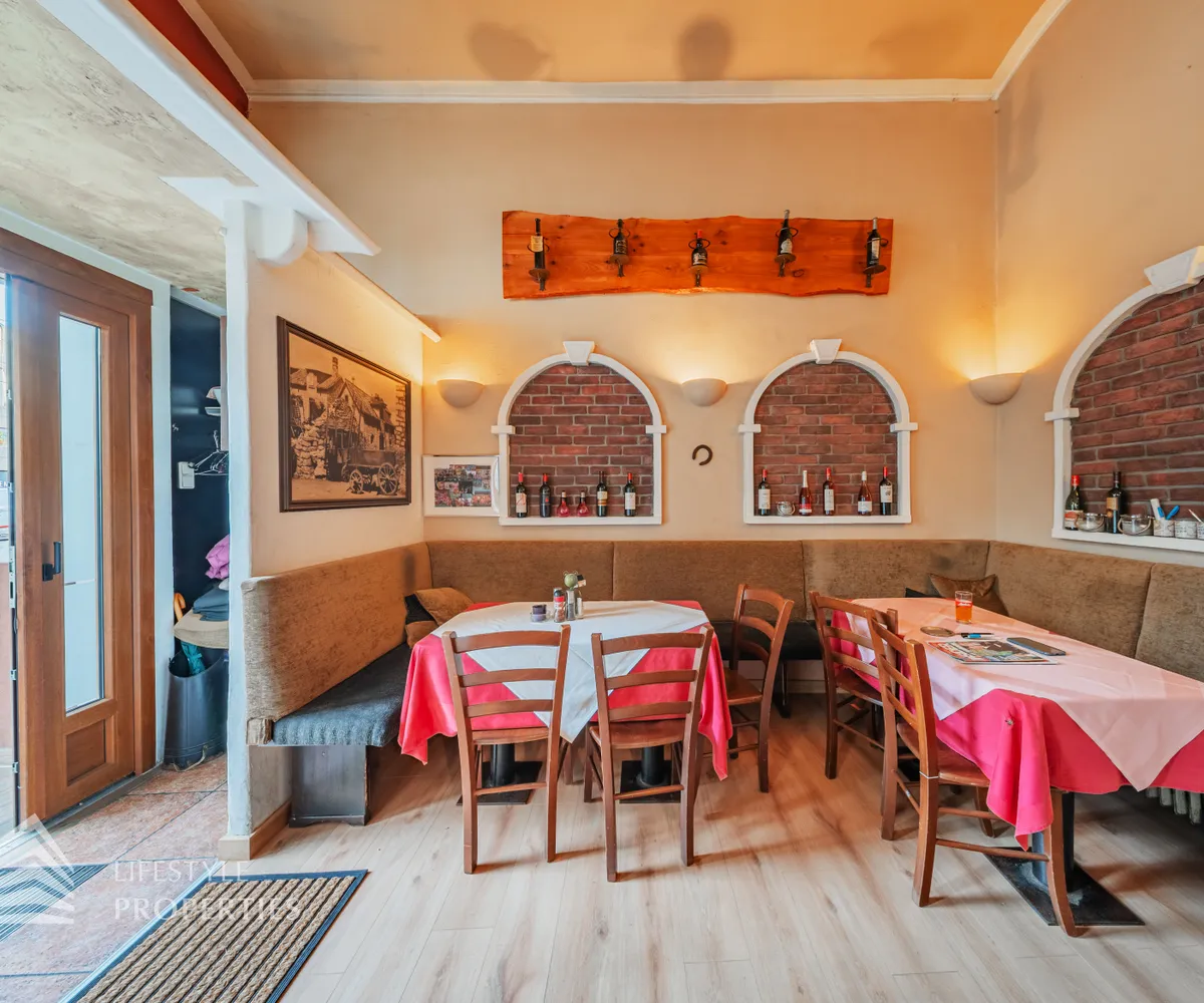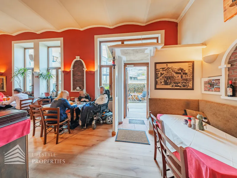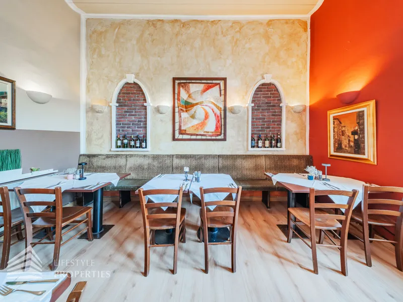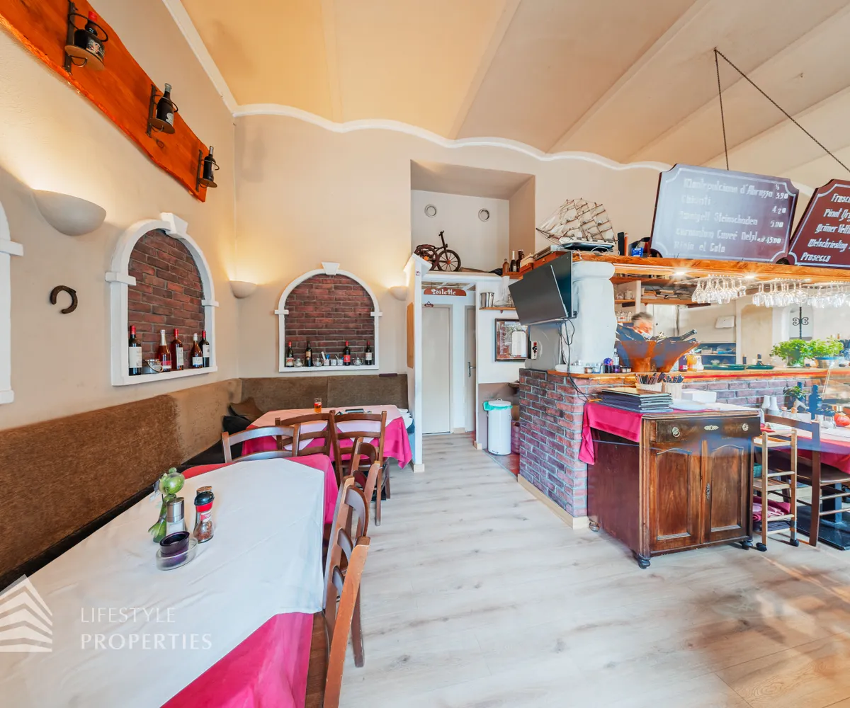 Das Restaurant befindet sich in einer sehr frequentierten Lage mit hoher Sichtbarkeit und besteht aus einem großzügigen Gastraum mit ca. 49 m²,der Küche mit ca. 18 m² und den Sanitärräumen mit ca. 6 m². Gleich beim Eintreten befindet sich der einladende Gastraum mit einer großen Bar, dahinter die offene Küche samt Pizzaofen – perfekt für authentische mediterrane Küche. Gäste-WCs sind direkt im Erdgeschoss vorhanden.