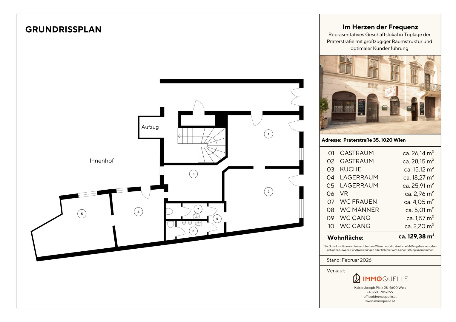 Willkommen an einer der bekanntesten Adressen Wiens - der Praterstraße im 2. Bezirk. Eine Lage, die seit jeher für Frequenz, Urbanität und wirtschaftliche Dynamik steht. Genau hier präsentiert sich dieses vielseitige Geschäftslokal mit ca. 129,38 m² Nutzfläche als seltene Gelegenheit für Unternehmer, Investoren oder Marken