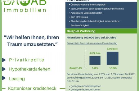 *Der Vertrag kommt nicht mit der INFINA Credit Broker GmbH zustande. Das Objekt wird von einem externen Immobilienunternehmen angeboten. Allfällige aus dem Vertragsabschluss resultierende Rechte sind ausschließlich gegenüber dem anbietenden Immobilienunternehmen geltend zu machen. Wir weisen Sie darauf hin, dass die gemachten Angaben und Informationen lediglich unverbindliche Vorabinformationen sind und daher ohne Gewähr erfolgen. Der Vermittler ist als Doppelmakler tätig.