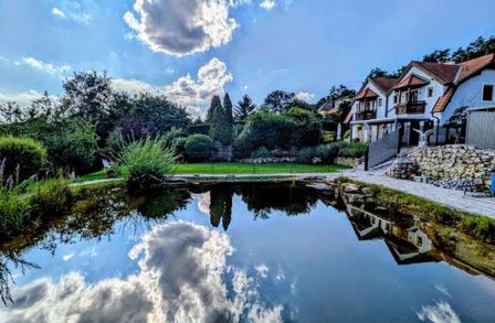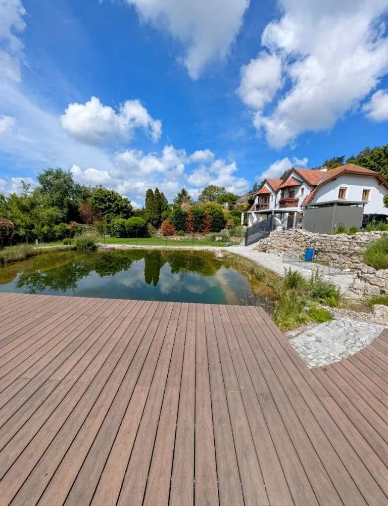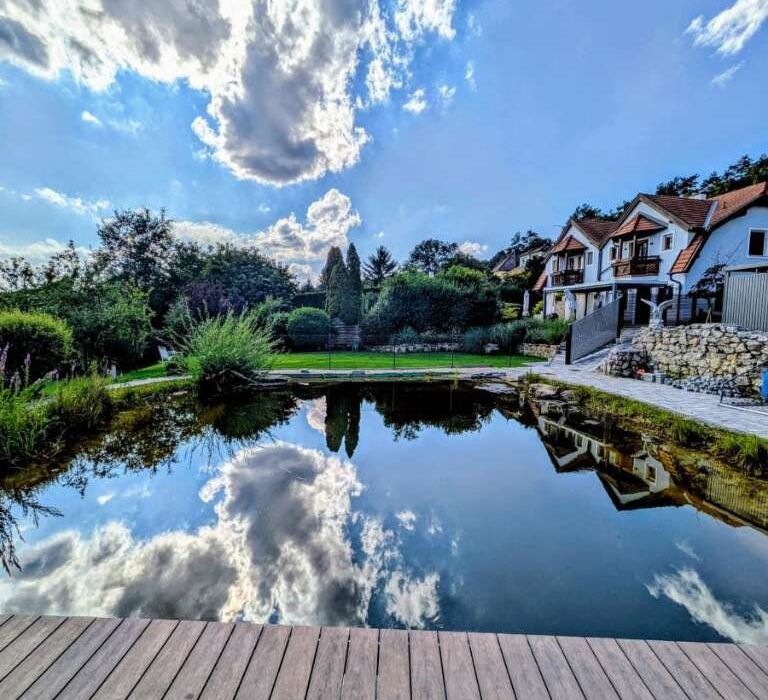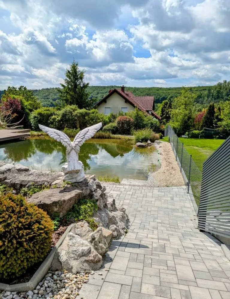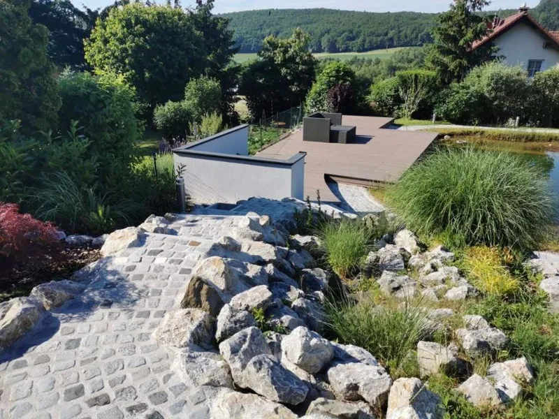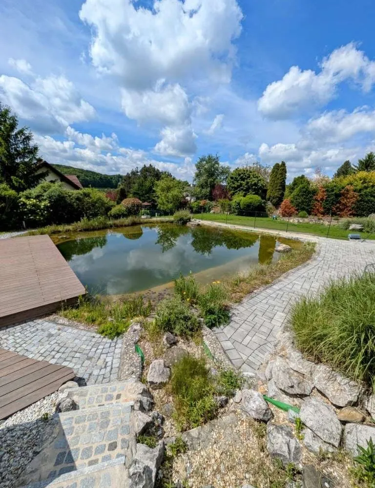 Privater Badeteich/Schwimmteich mit Wasserfall & Steg