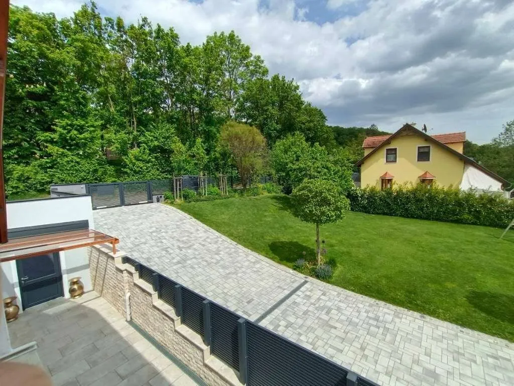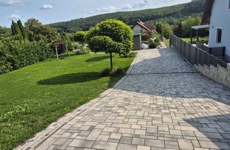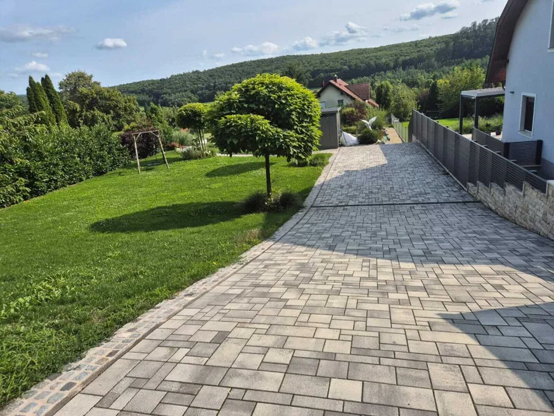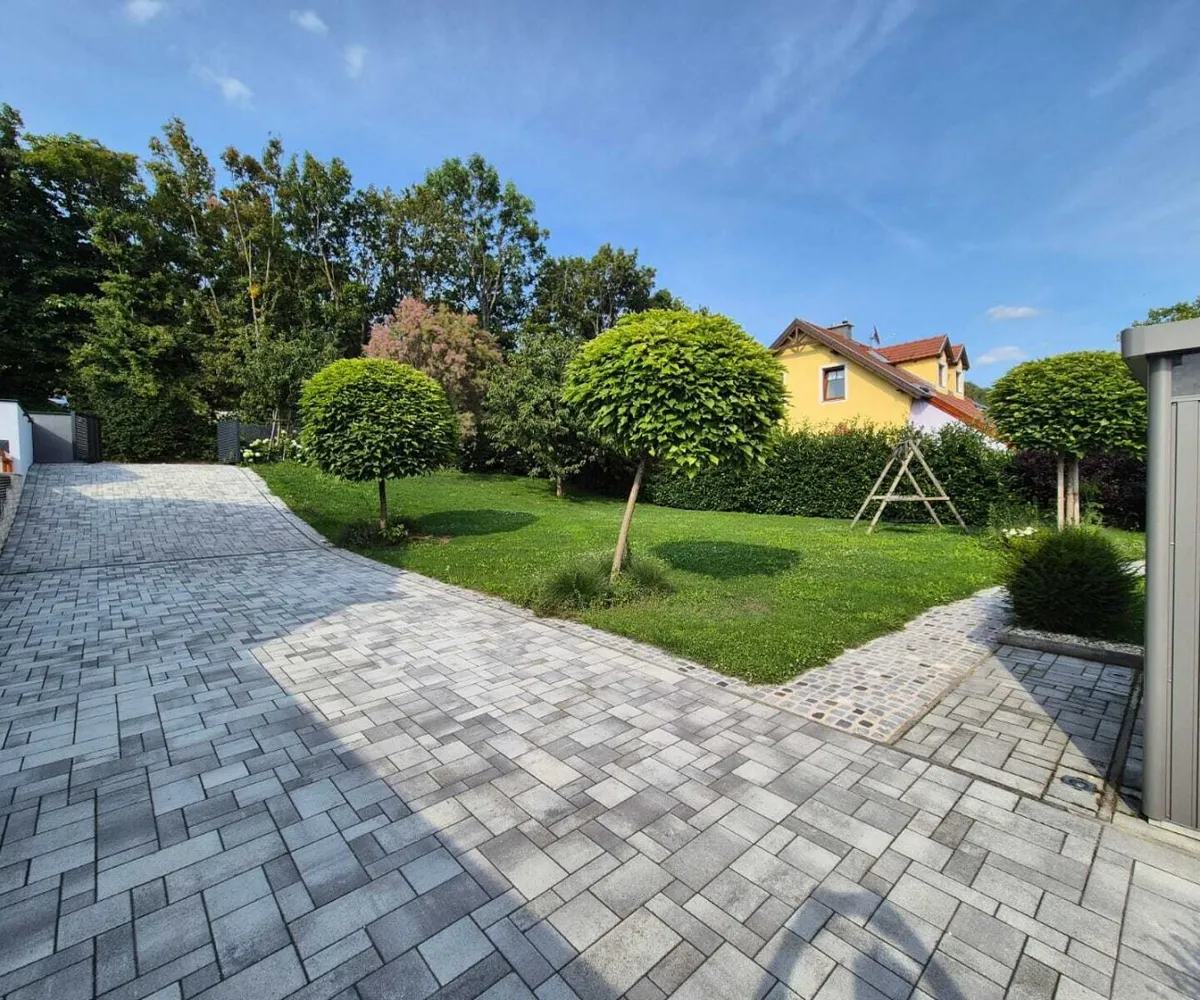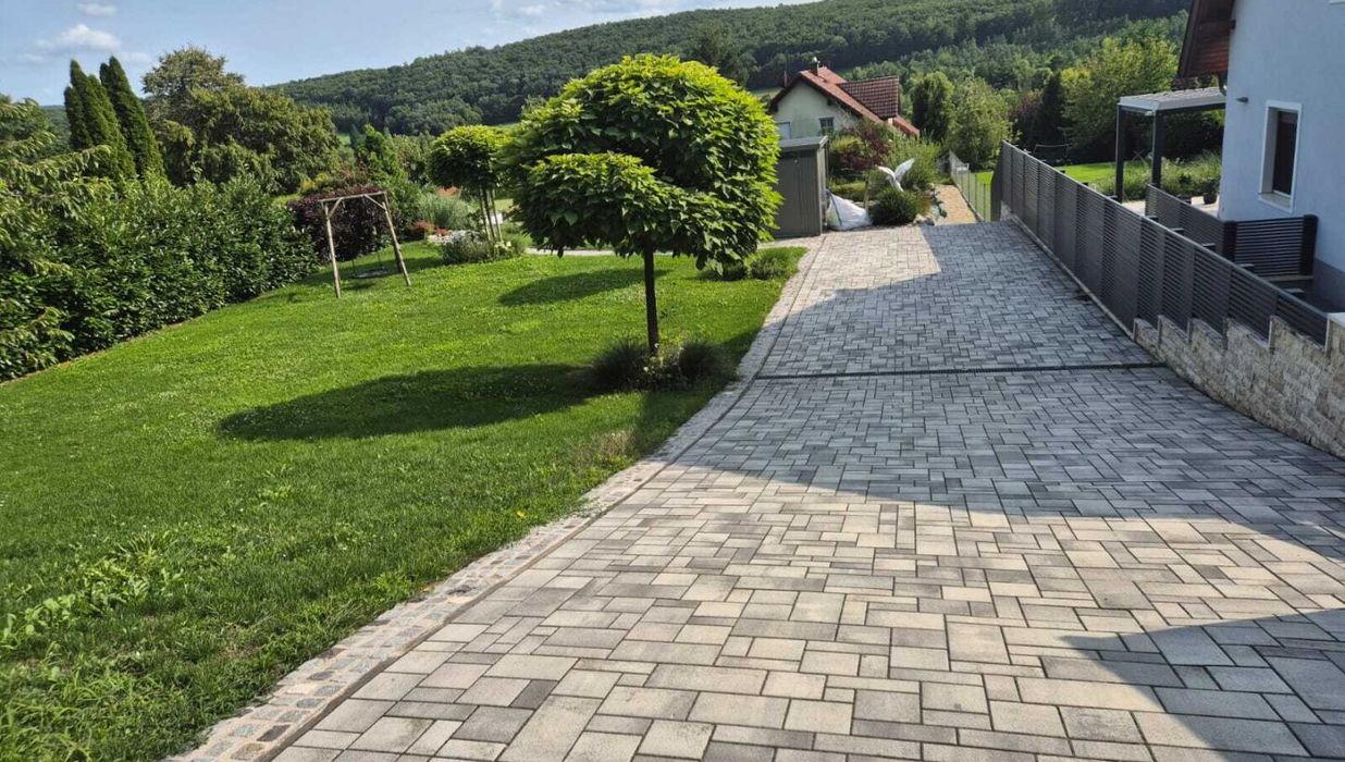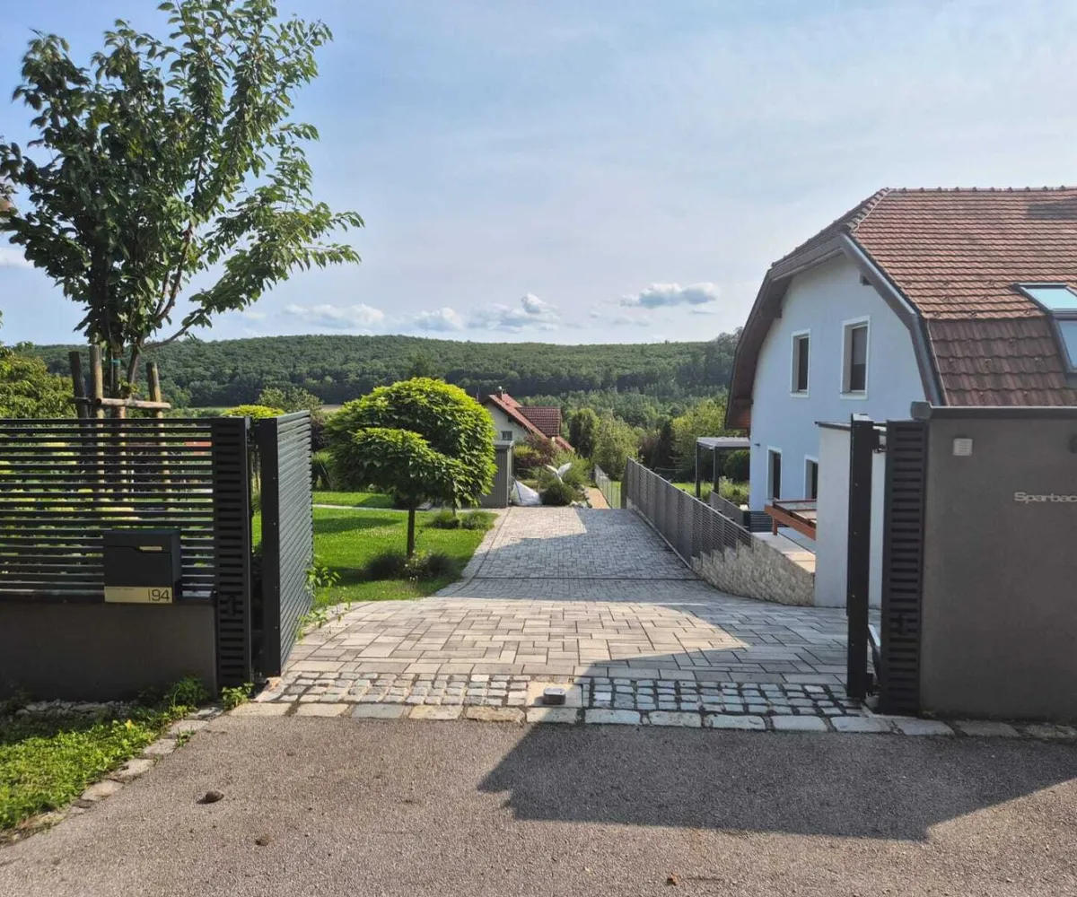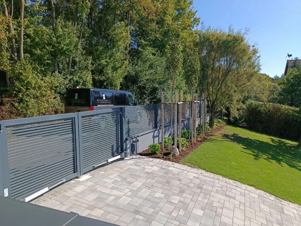 Gepflasterte Einfahrt (5 m), elektrisches Einfahrtstor & Guardi-Zaun