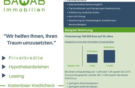 Bei jedem Kauf einer Immobilie oder eines Grundstücks ist es wichtig, die passende Finanzierung zu finden. Mit seiner eigenen Vertriebsorganisation ist Infina als Wohnbau-Finanz-Experte an über 100 Standorten in ganz Österreich vertreten und vermittelt Finanzierungen an über 150 Banken und Bausparkassen. Nutzen Sie unseren kostenlosen Kreditvergleich für den passenden Wohnkredit: