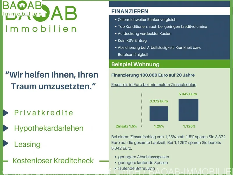 Bei jedem Kauf einer Immobilie oder eines Grundstücks ist es wichtig, die passende Finanzierung zu finden. Mit seiner eigenen Vertriebsorganisation ist Infina als Wohnbau-Finanz-Experte an über 100 Standorten in ganz Österreich vertreten und vermittelt Finanzierungen an über 150 Banken und Bausparkassen. Nutzen Sie unseren kostenlosen Kreditvergleich für den passenden Wohnkredit: