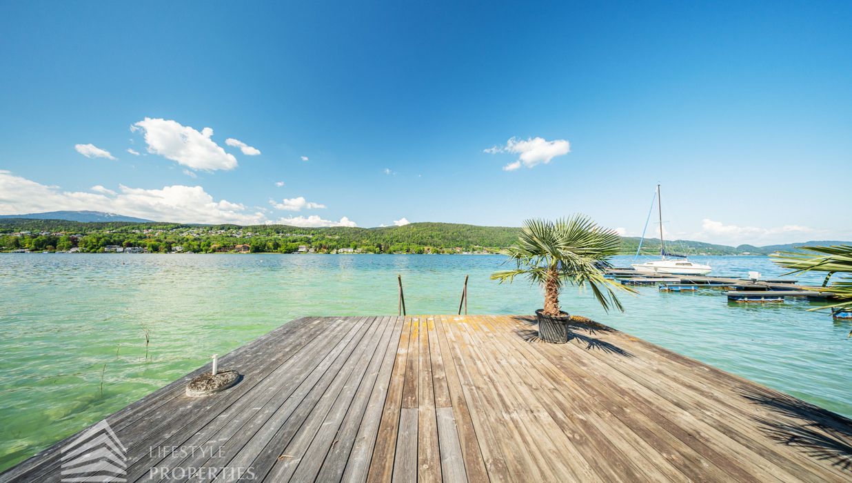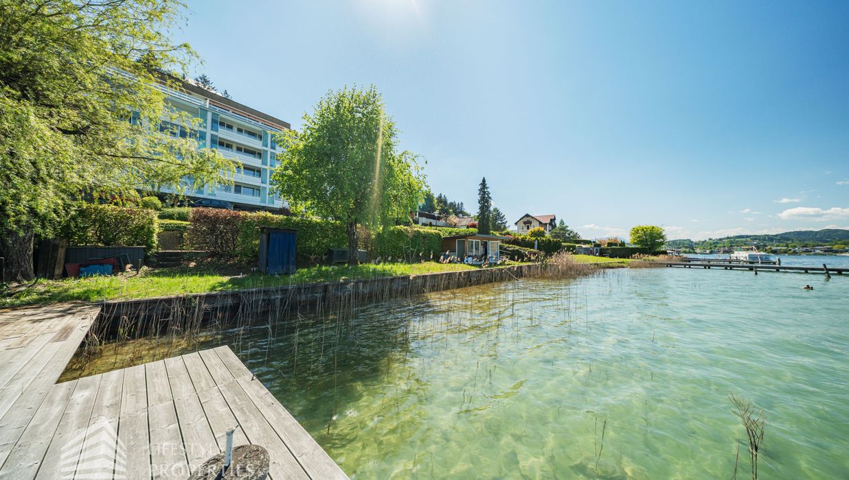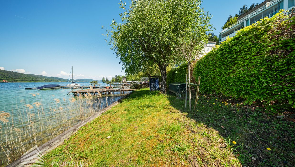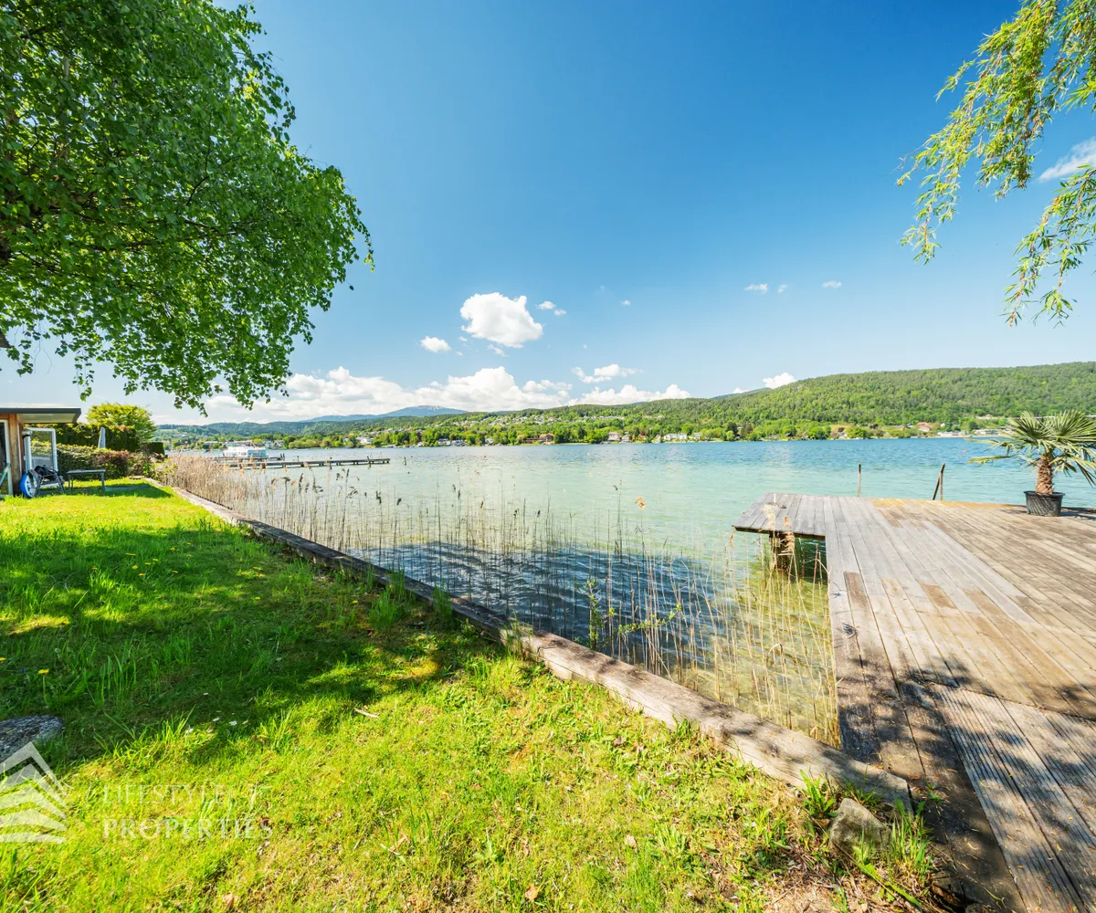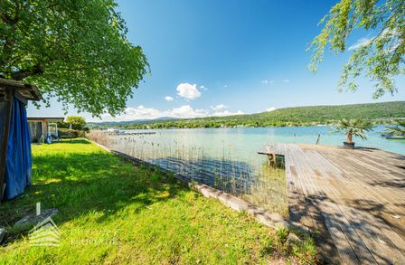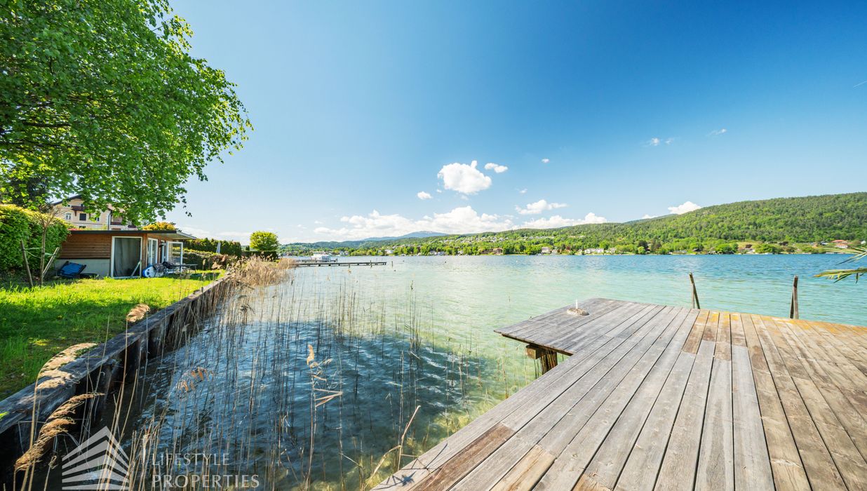 Das Grundstück verfügt über einen rund 30 Meter langen Uferabschnitt mit eigenem Badesteg und bietet damit direkten Zugang zum kristallklaren Wasser. Der großzügige Liegebereich von rund 230 m² lädt zum Sonnenbaden und Entspannen ein und ermöglicht ungestörte Badefreuden in absoluter Privatsphäre.
