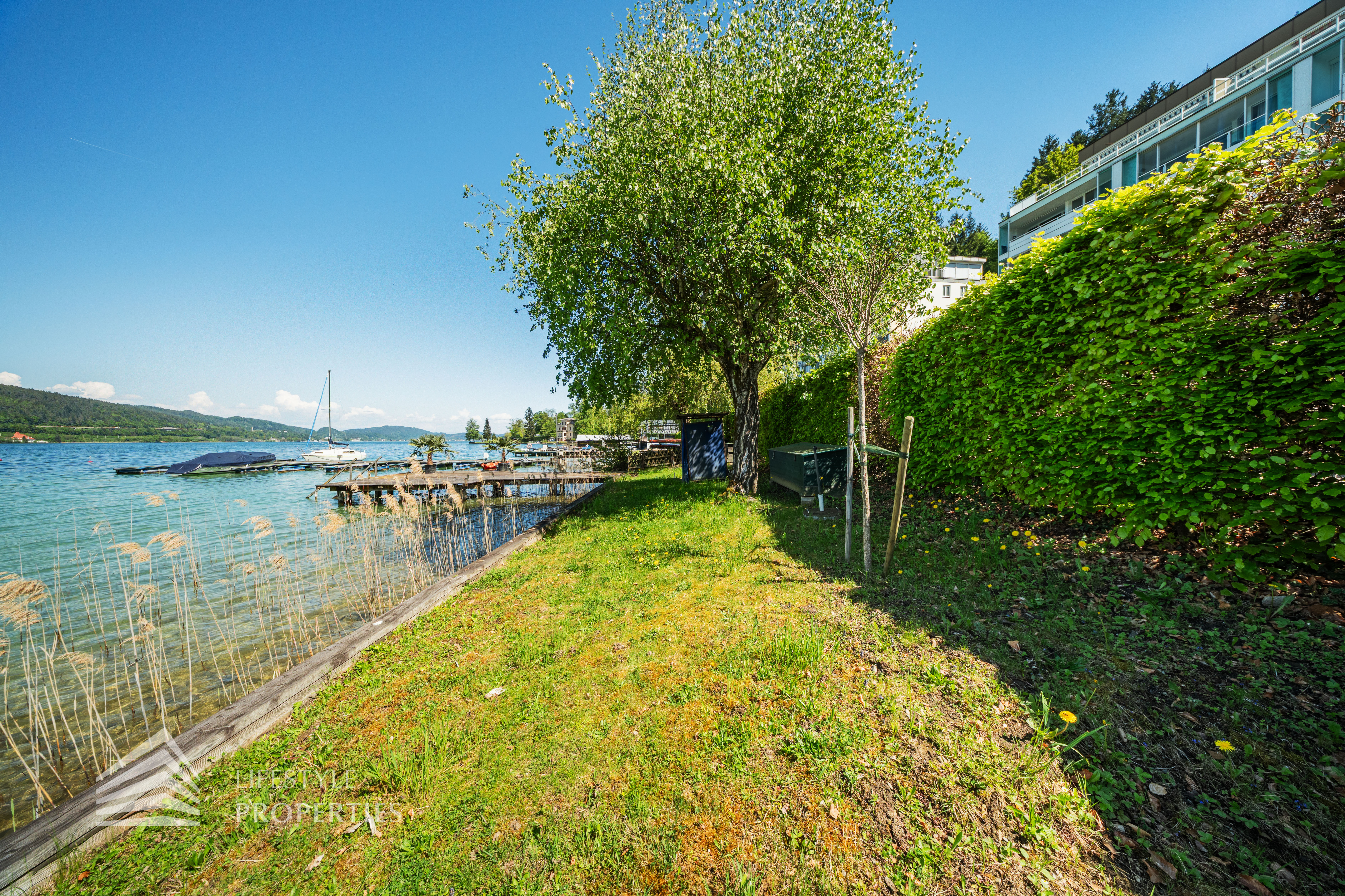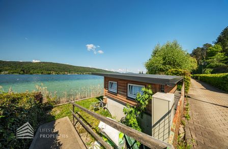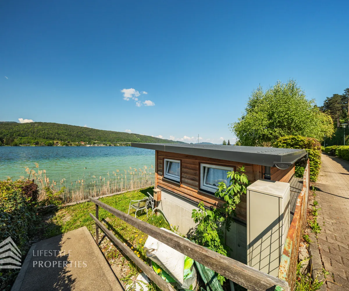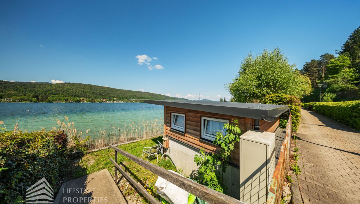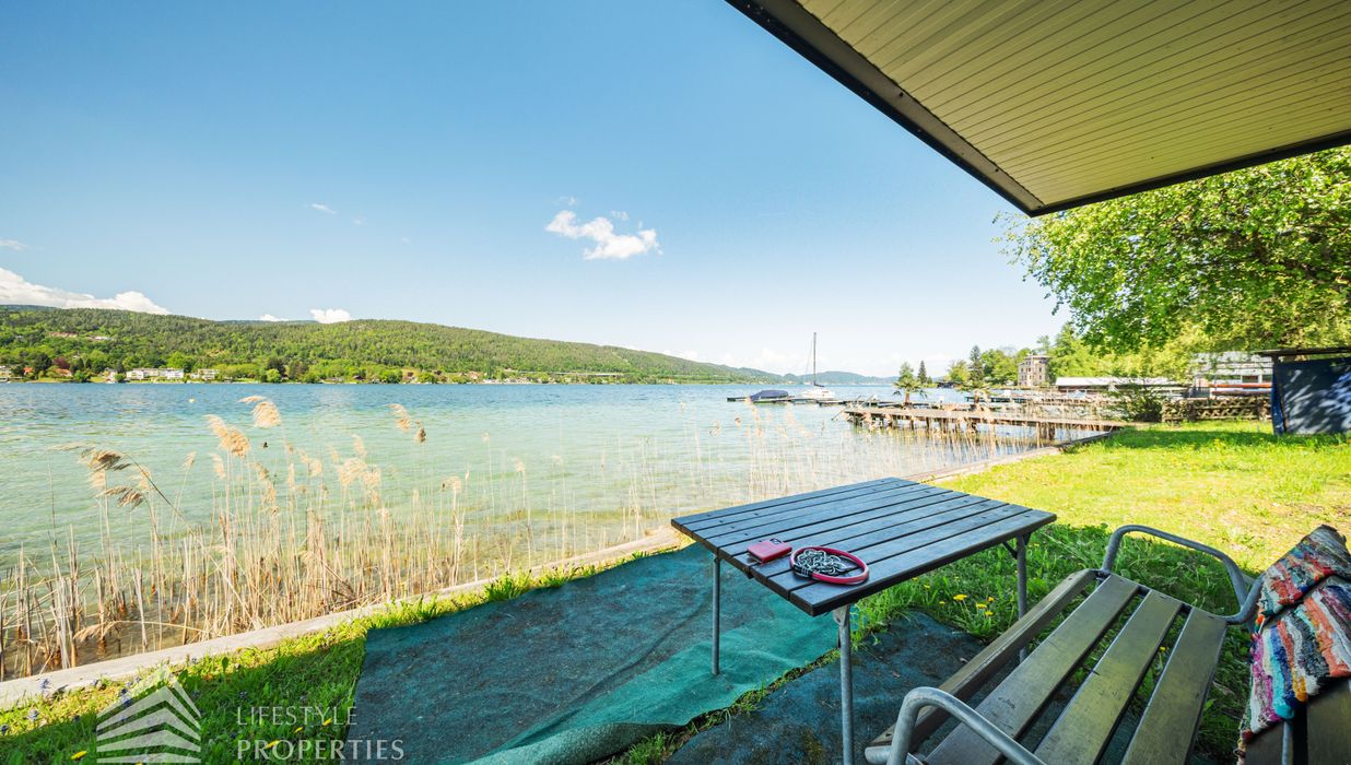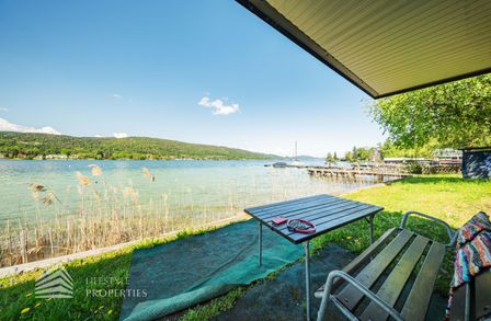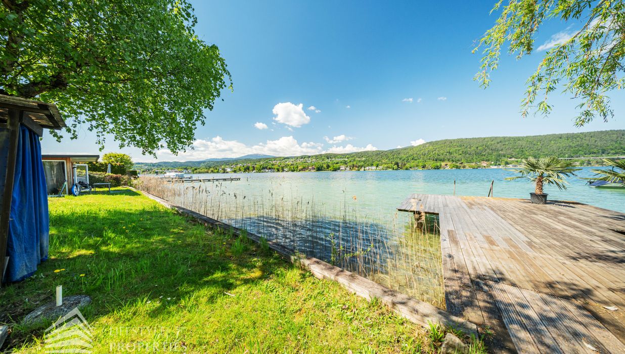 Das Grundstück verfügt über einen rund 30 Meter langen Uferabschnitt mit eigenem Badesteg und bietet damit direkten Zugang zum kristallklaren Wasser. Der großzügige Liegebereich von rund 230 m² lädt zum Sonnenbaden und Entspannen ein und ermöglicht ungestörte Badefreuden in absoluter Privatsphäre.