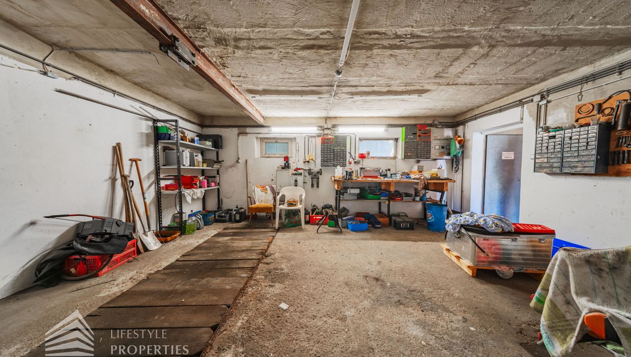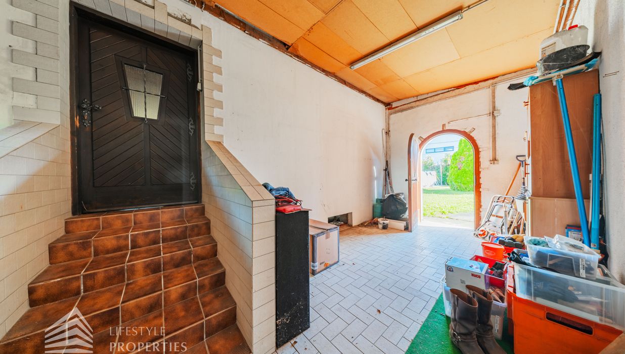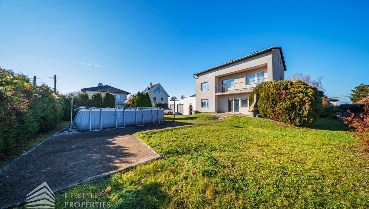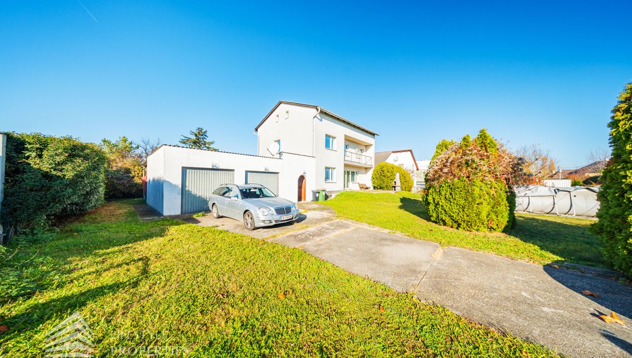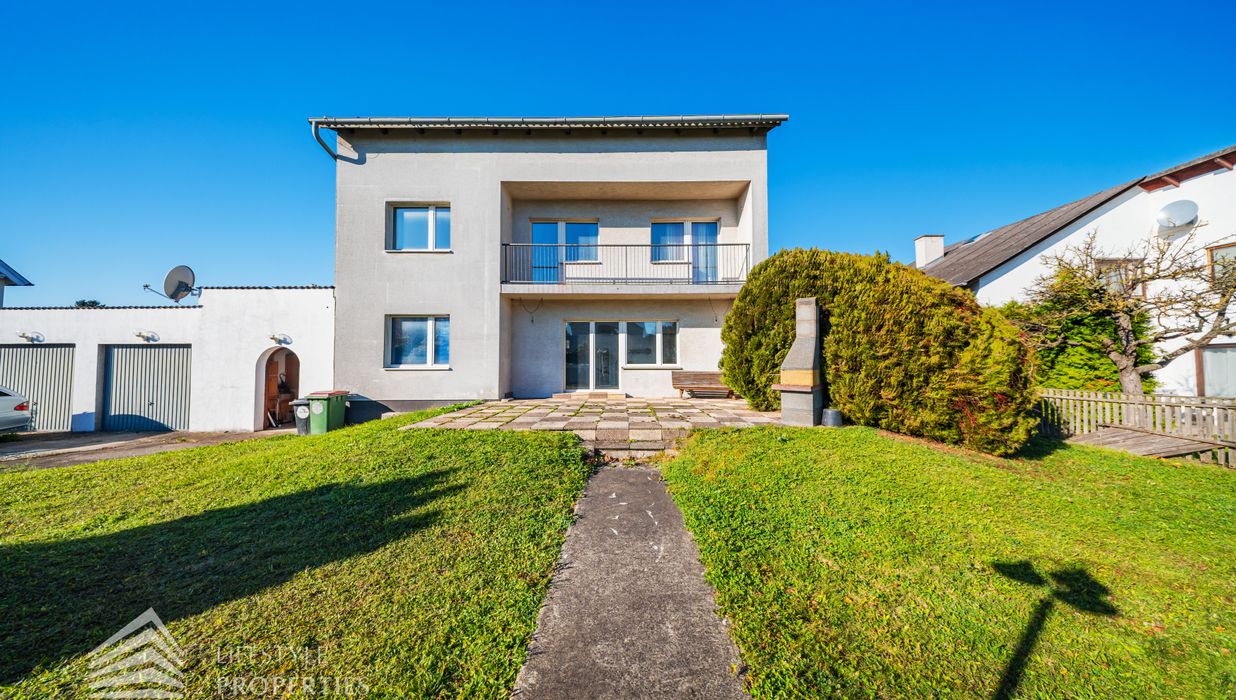 Der Außenbereich besteht aus einem großzügigen Garten mit rund 840 m² sowie einer Garage von etwa 60 m² und zusätzlichen Stellplätzen. Die Heizung erfolgt über eine Zentralheizung, betrieben mit Öl und Elektro. Aufgrund des guten Zustands des Bestandsgebäudes ist sowohl eine sofortige Nutzung als auch ein schrittweises Entwicklungsmodell möglich.