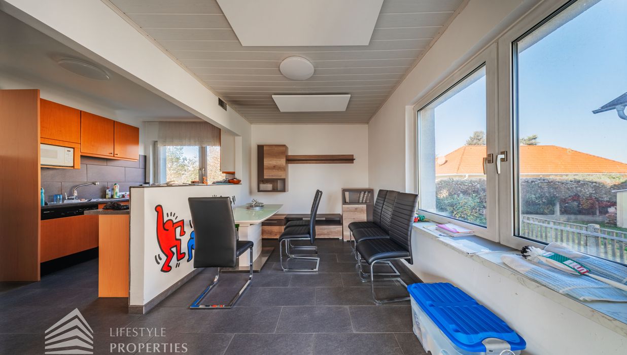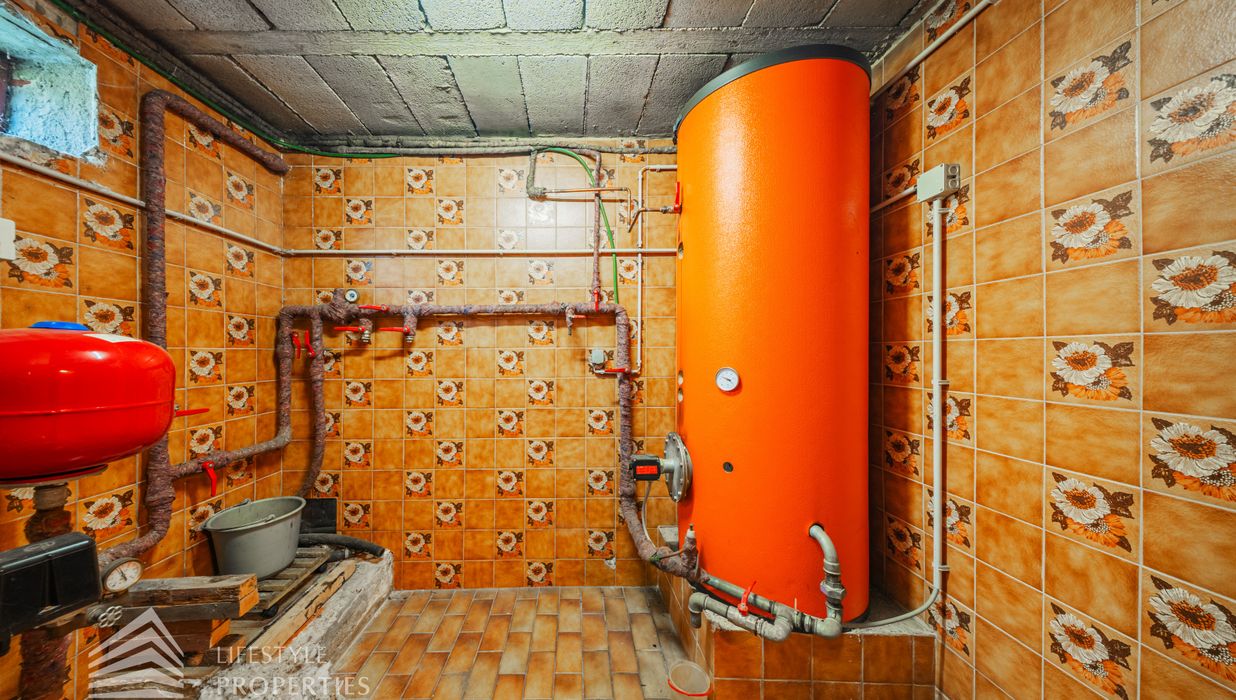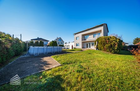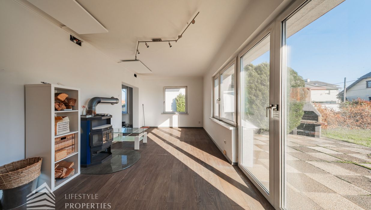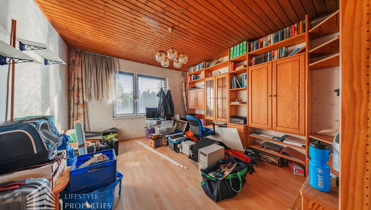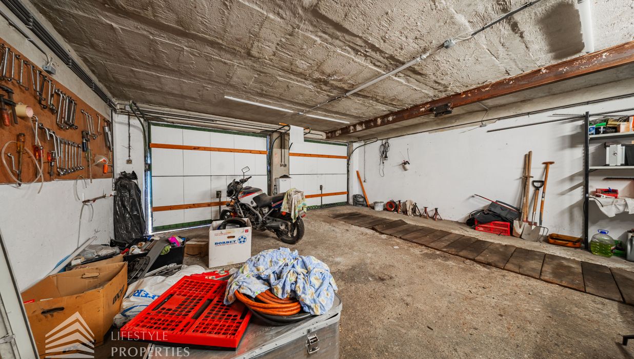 Der Außenbereich besteht aus einem großzügigen Garten mit rund 840 m² sowie einer Garage von etwa 60 m² und zusätzlichen Stellplätzen. Die Heizung erfolgt über eine Zentralheizung, betrieben mit Öl und Elektro. Aufgrund des guten Zustands des Bestandsgebäudes ist sowohl eine sofortige Nutzung als auch ein schrittweises Entwicklungsmodell möglich.
