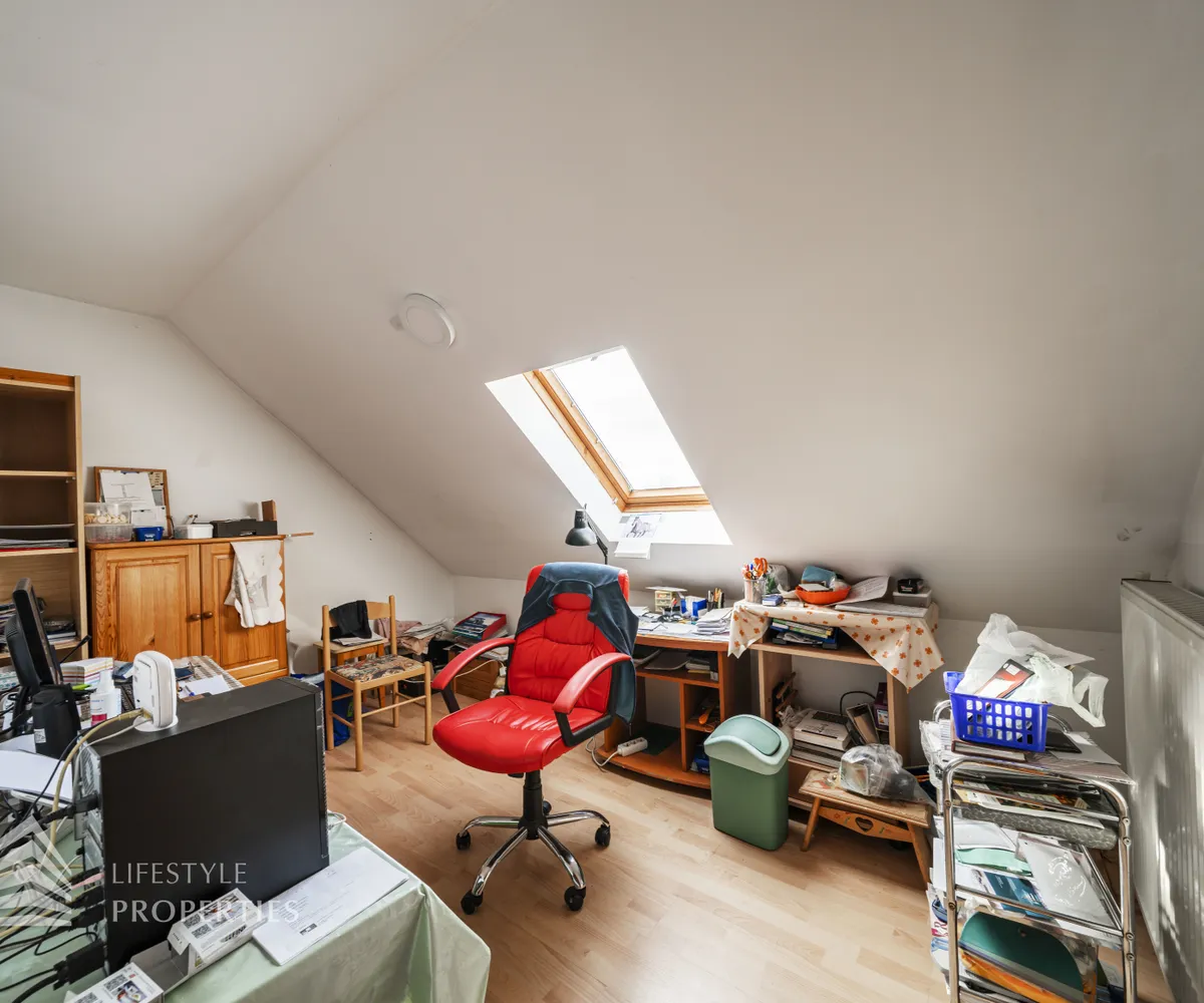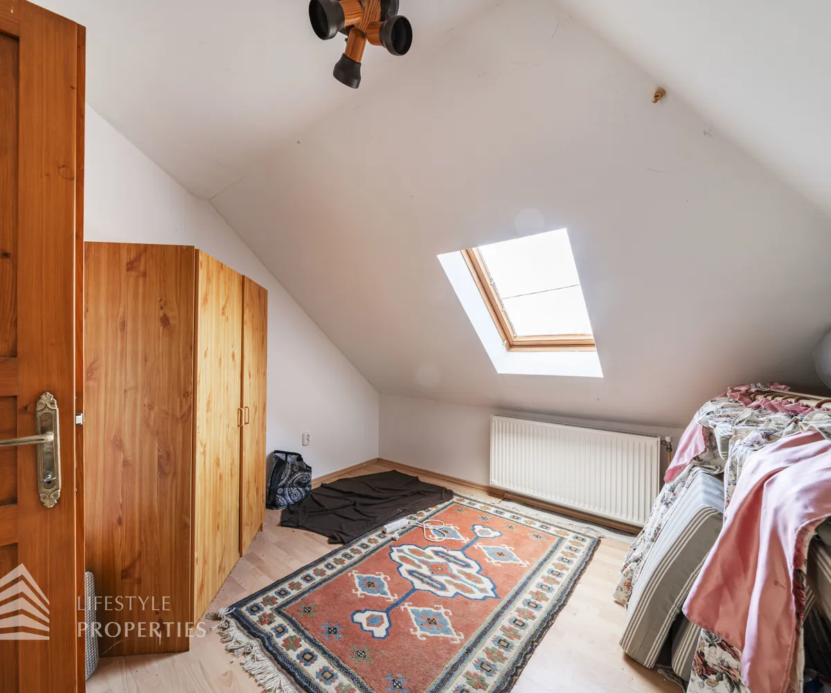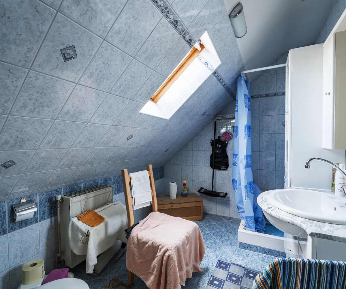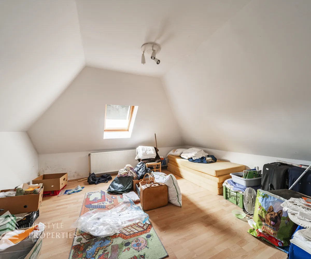 Über eine schöne Treppe gelangen Sie in die obere Etage. Hier treffen Sie auf drei weitere Zimmer sowie ein Bad. Alle drei Zimmer verfügen über jeweils ein Fenster, wodurch Sie hell und freundlich erscheinen. Die Dachschrägen verleihen den Räumen zudem besondere Gemütlichkeit. Das größte der drei Zimmer könnte beispielsweise als zweiter Wohnraum oder als Kinderzimmer genutzt werden. Das zweite Zimmer dient im Moment als Büro und ist mit einem Schreibtisch sowie diversen Schränken ausgestattet. Das dritte Zimmer verfügt über einen geräumigen Schrank und kann vielseitig genutzt werden. Das Badezimmer ist mit einer Dusche, einem Waschbecken, einem Schrank, einer Toilette sowie einem Fenster ausgestattet. Beheizt wird die Immobilie mittels Fußbodenheizung (Gas-Zentralheizung).
