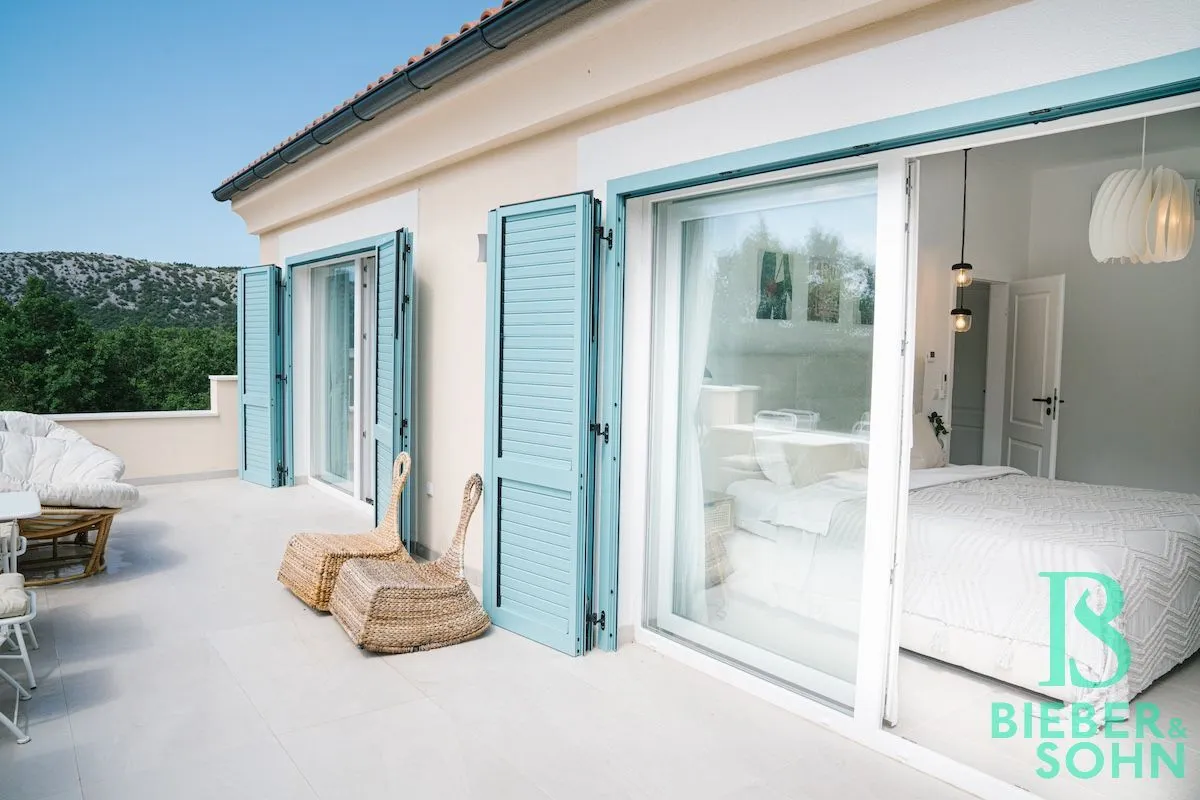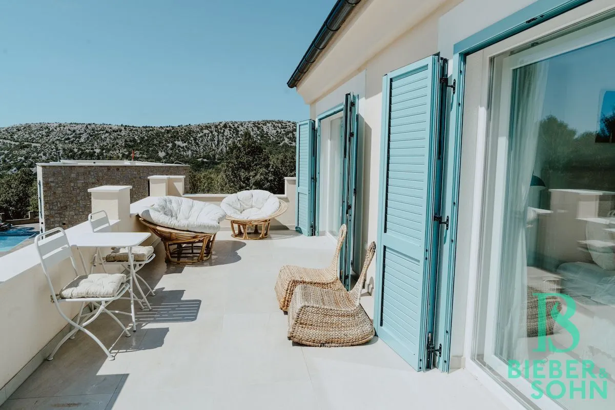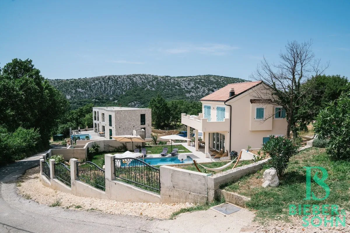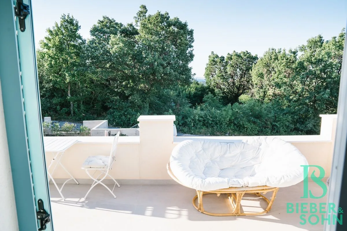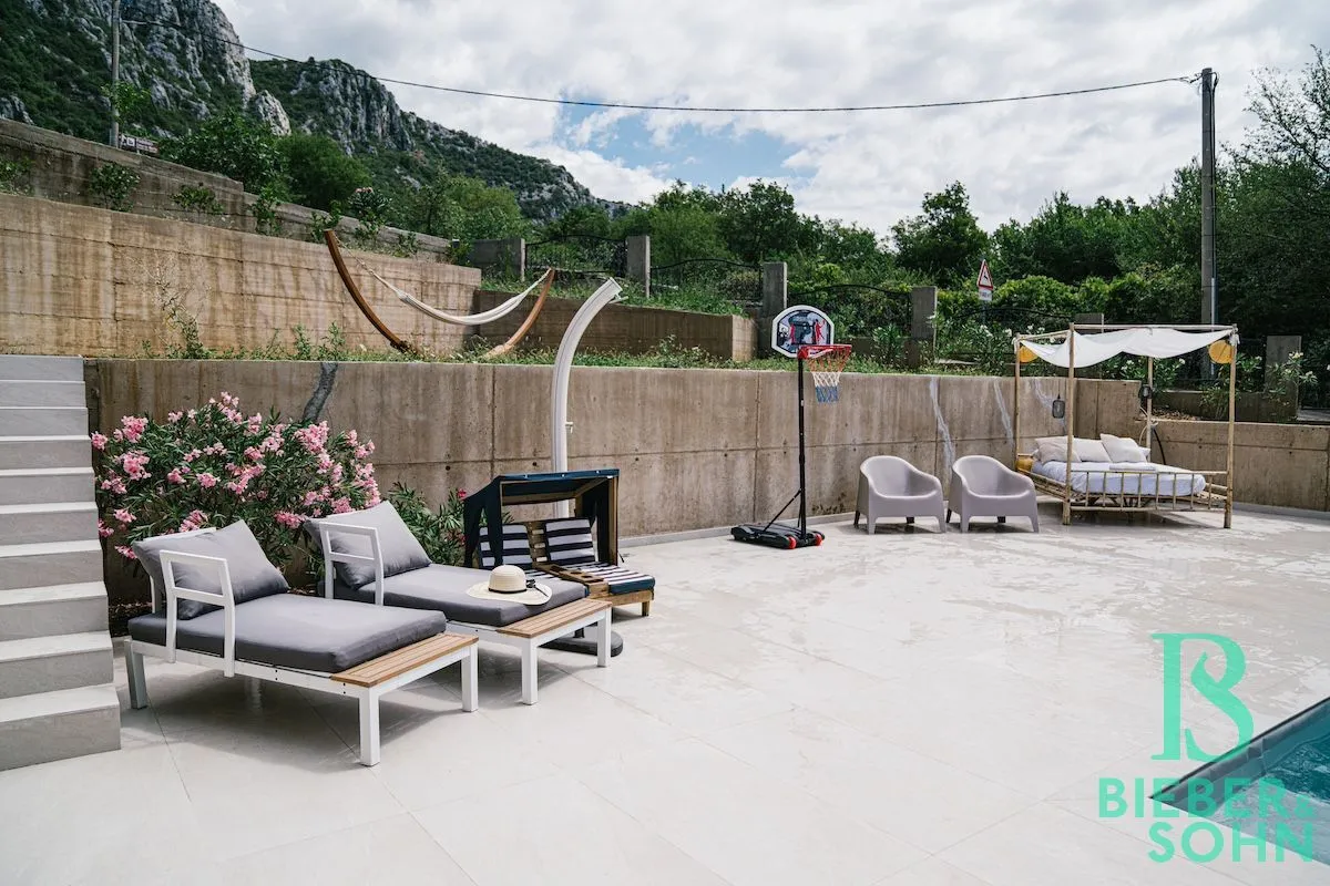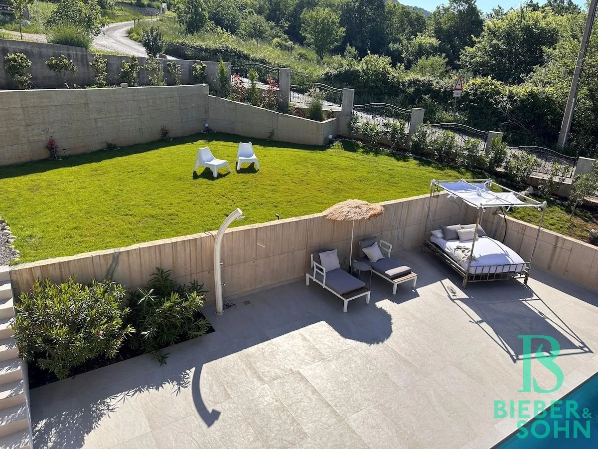 Auf einem großzügigen, terrassenförmigen, komplett eingezäunten Grundstück von über 1.000 m² wartet die Villa mit authentischer, kroatischer Architektur (Ziegel massiv, BJ 2023) auf, mit einer Wohnfläche von 120 m², die sich perfekt in die natürliche Umgebung einfügt.