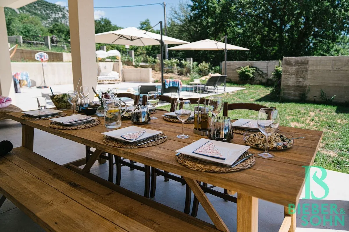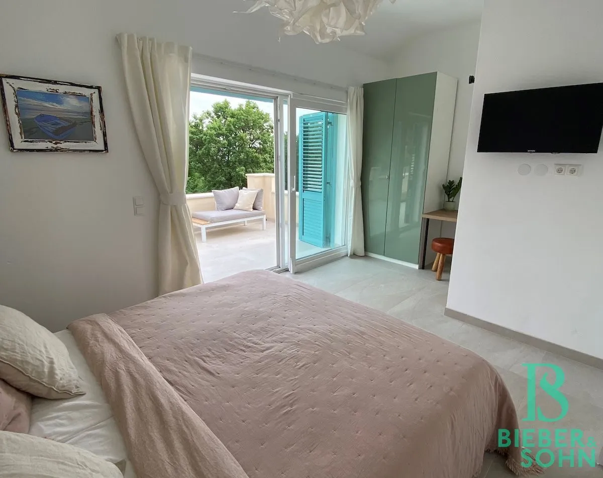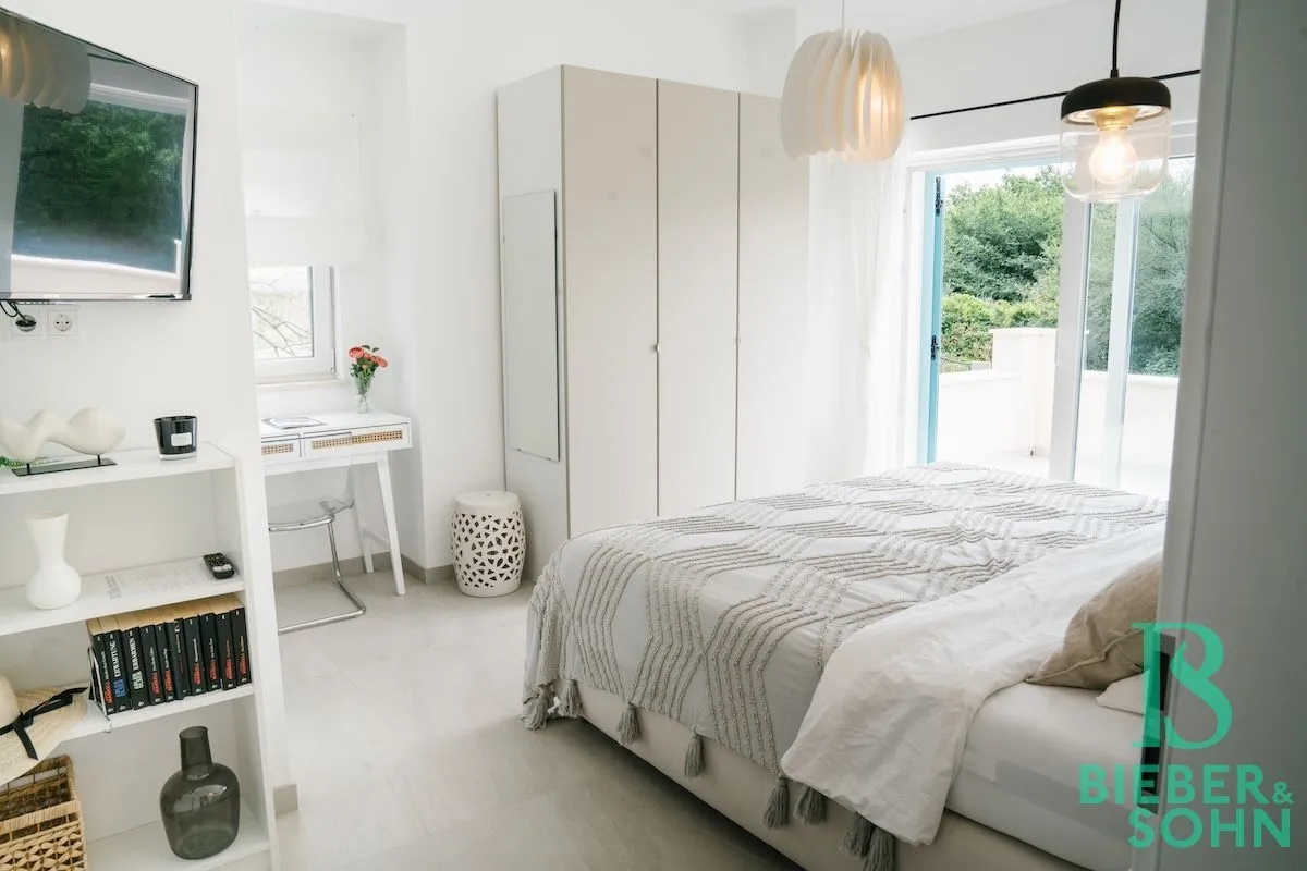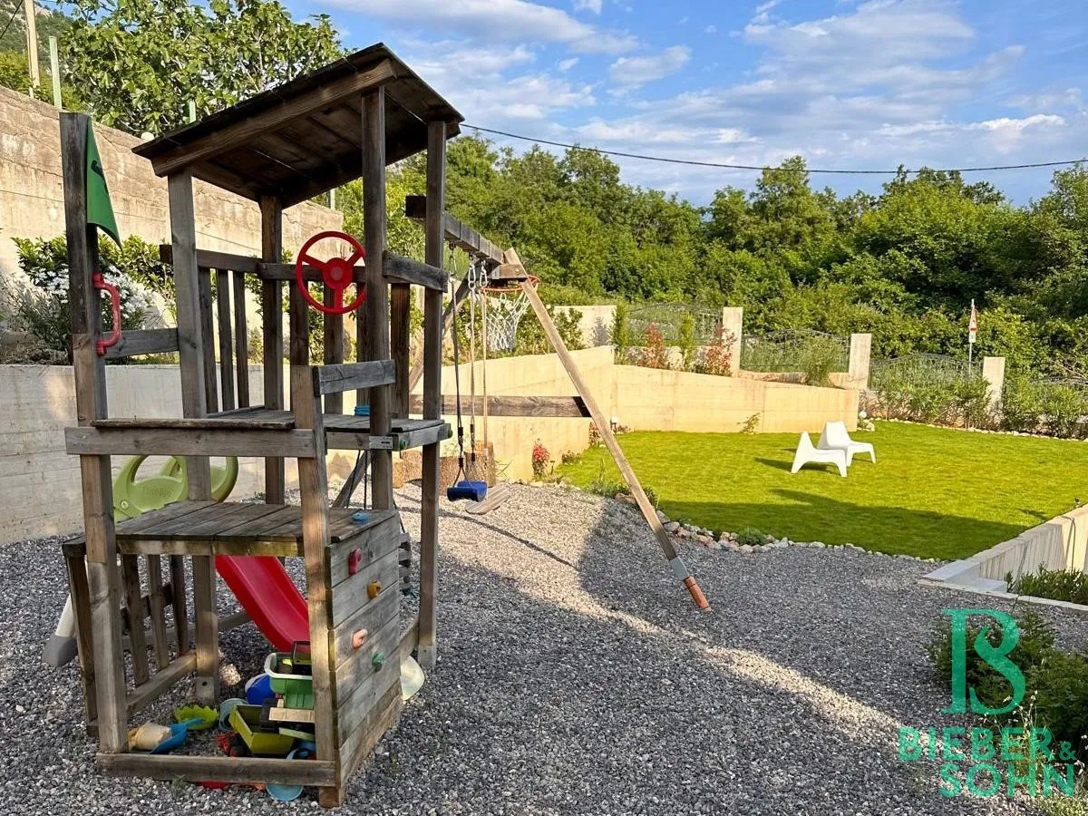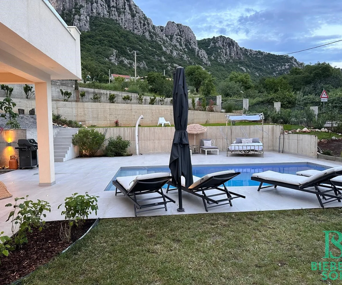 Auf einem großzügigen, terrassenförmigen, komplett eingezäunten Grundstück von über 1.000 m² wartet die Villa mit authentischer, kroatischer Architektur (Ziegel massiv, BJ 2023) auf, mit einer Wohnfläche von 120 m², die sich perfekt in die natürliche Umgebung einfügt.