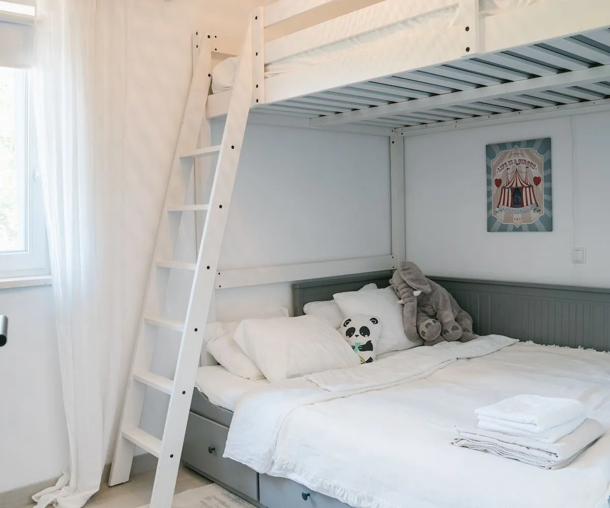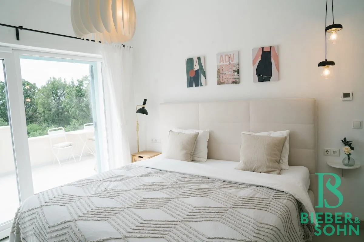 Zusätzlich steht Ihnen eine 32 m² große Terrasse im Obergeschoss zur Verfügung, die einen atemberaubenden Panoramablick auf die umliegende Landschaft und das Meer bietet. Die zwei geräumigen Schlafzimmer, jedes mit eigenem Bad, garantieren viel Privatsphäre. Ein weiteres Zimmer, als Gäste-, Kinderzimmer oder Büro verwendbar, befindet sich auf diese Etage.