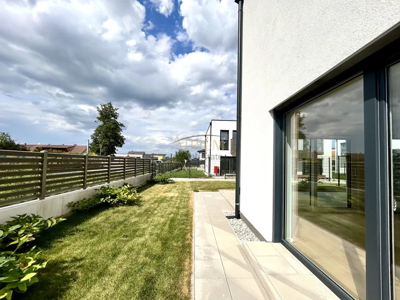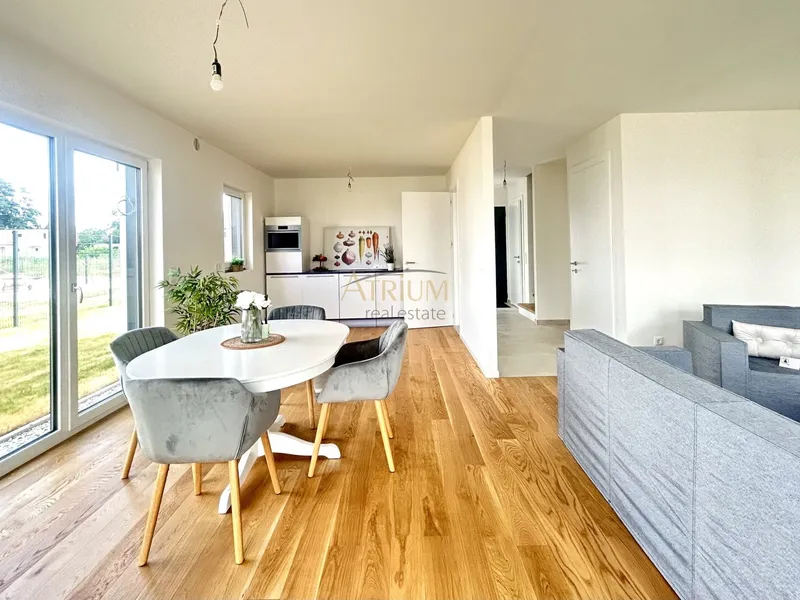 Noch vor dem Betreten Ihres neuen Zuhauses werden Sie vom einladenden Außenbereich und der großen modernen Eingangstür empfangen. Im schicken Vorraum angekommen, erblickt man sofort den hell strahlenden Wohnbereich mit Zugang zur Terrasse und dem Garten. Große Fensterflächen sorgen für natürliche Belichtung über den ganzen Tag verteilt. Die offene Küche bietet viel Platz für gemeinsames Kochen und Genießen. Ergänzend verfügt das Erdgeschoß noch über kleines Badezimmer mit WC, einen Abstellraum und einen zusätzlichen geräumigen Raum , der sich ideal als Büro anbietet. Über den Stiegenaufgang im Vorraum gelangt man vom Erdgeschoß ins Obergeschoß.