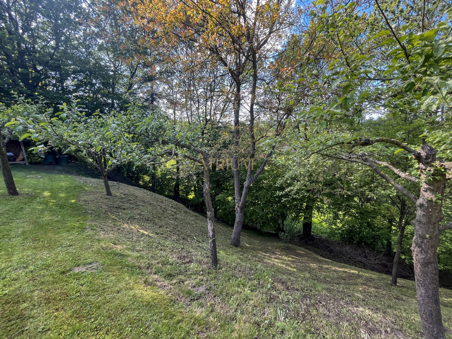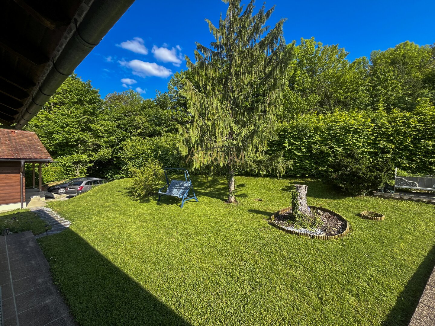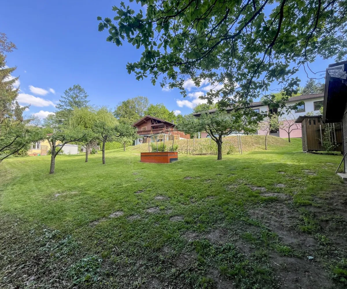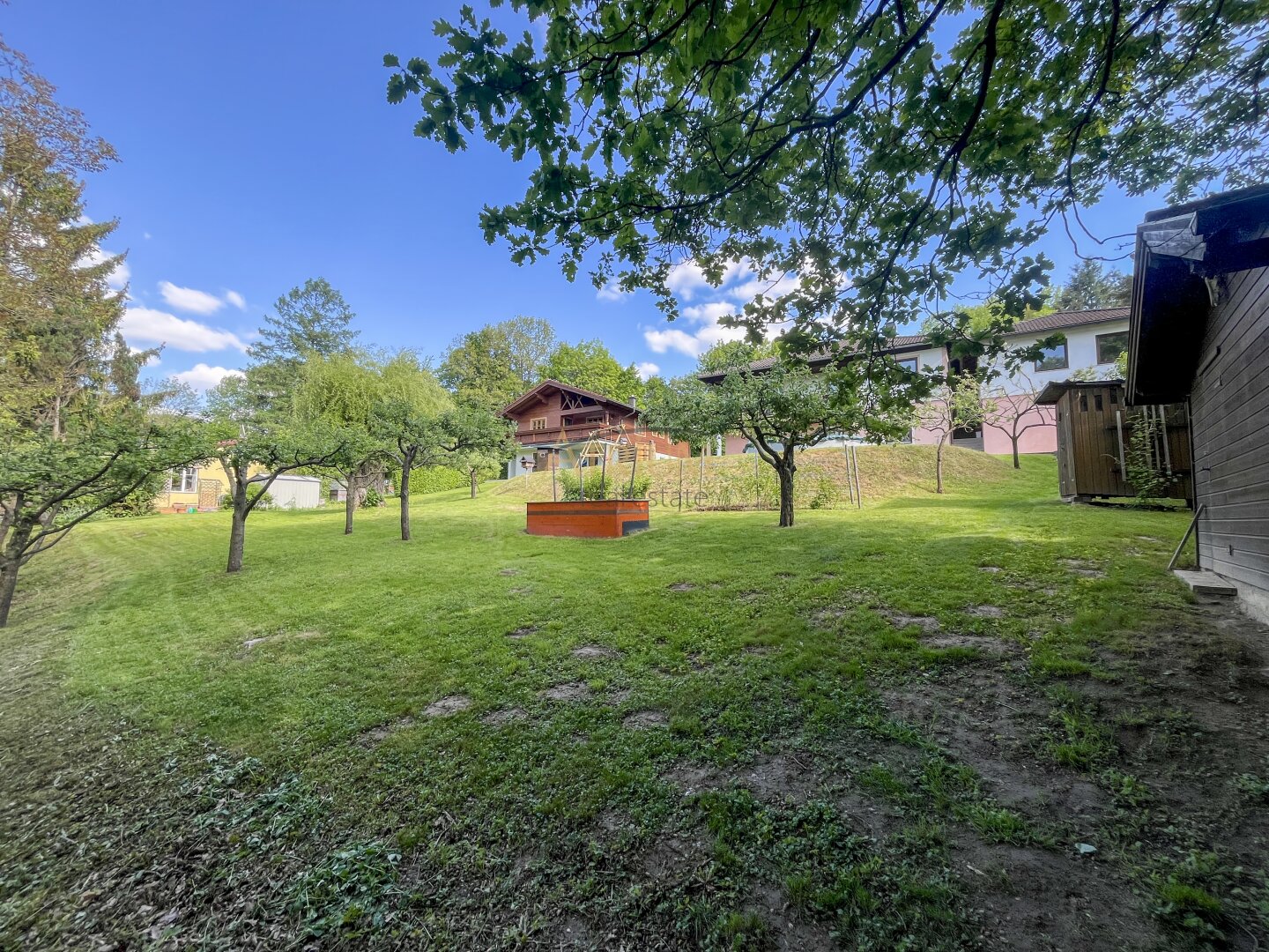 Das Grundstück liegt am Waldrand in Hanglage mit freiem Blick ins Hügelland.
