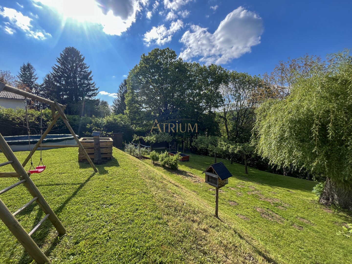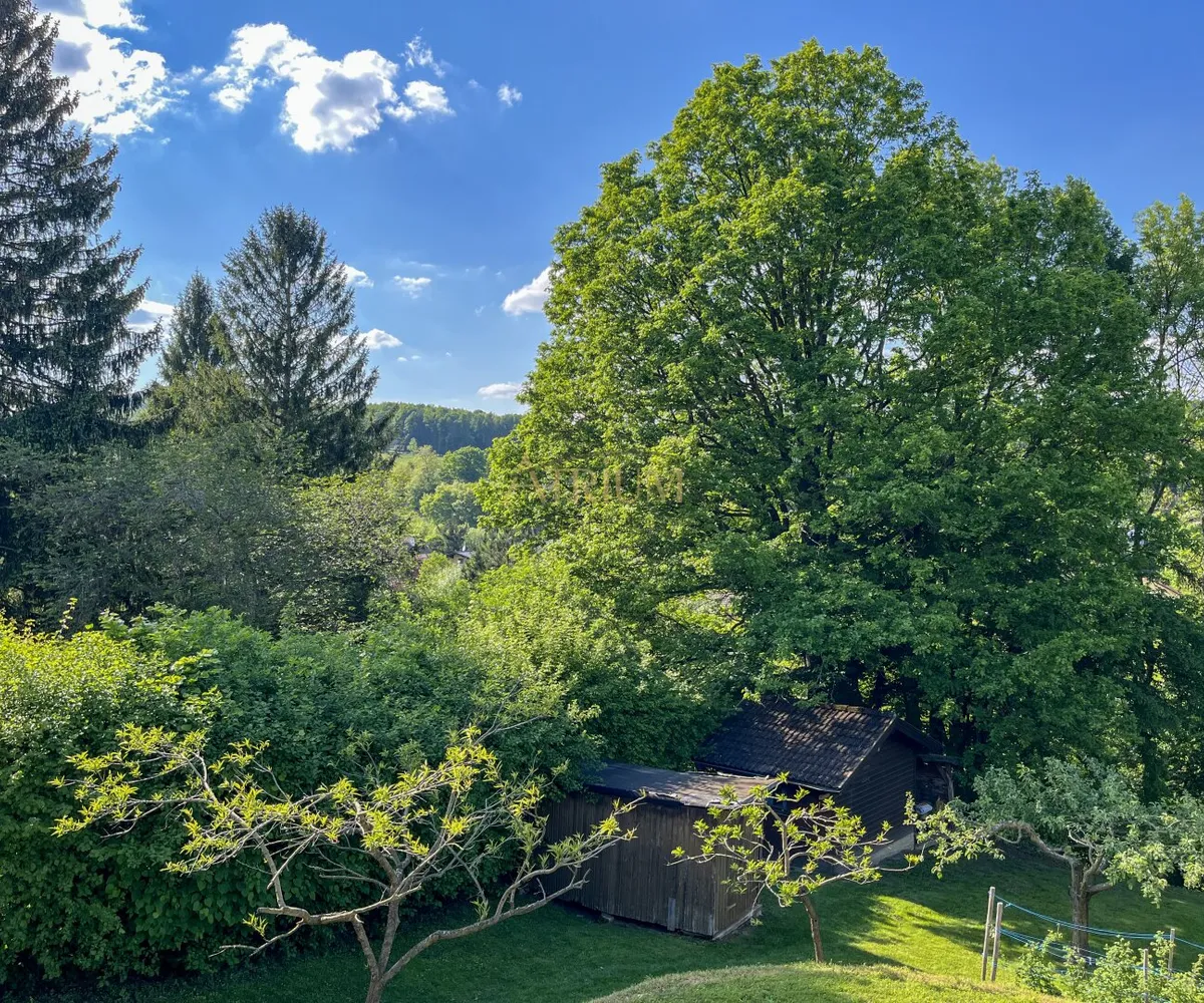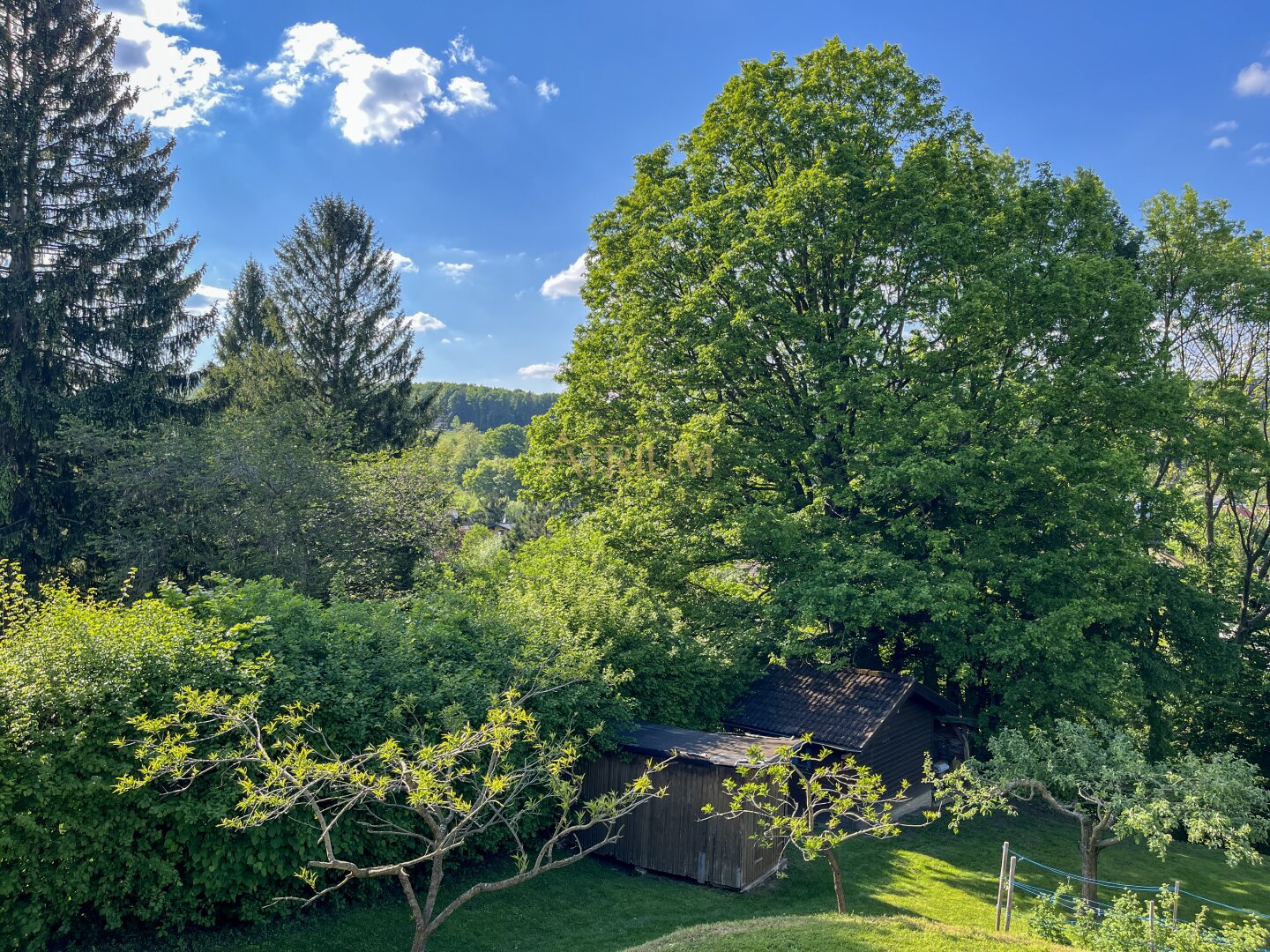 Das Grundstück liegt am Waldrand in Hanglage mit freiem Blick ins Hügelland.