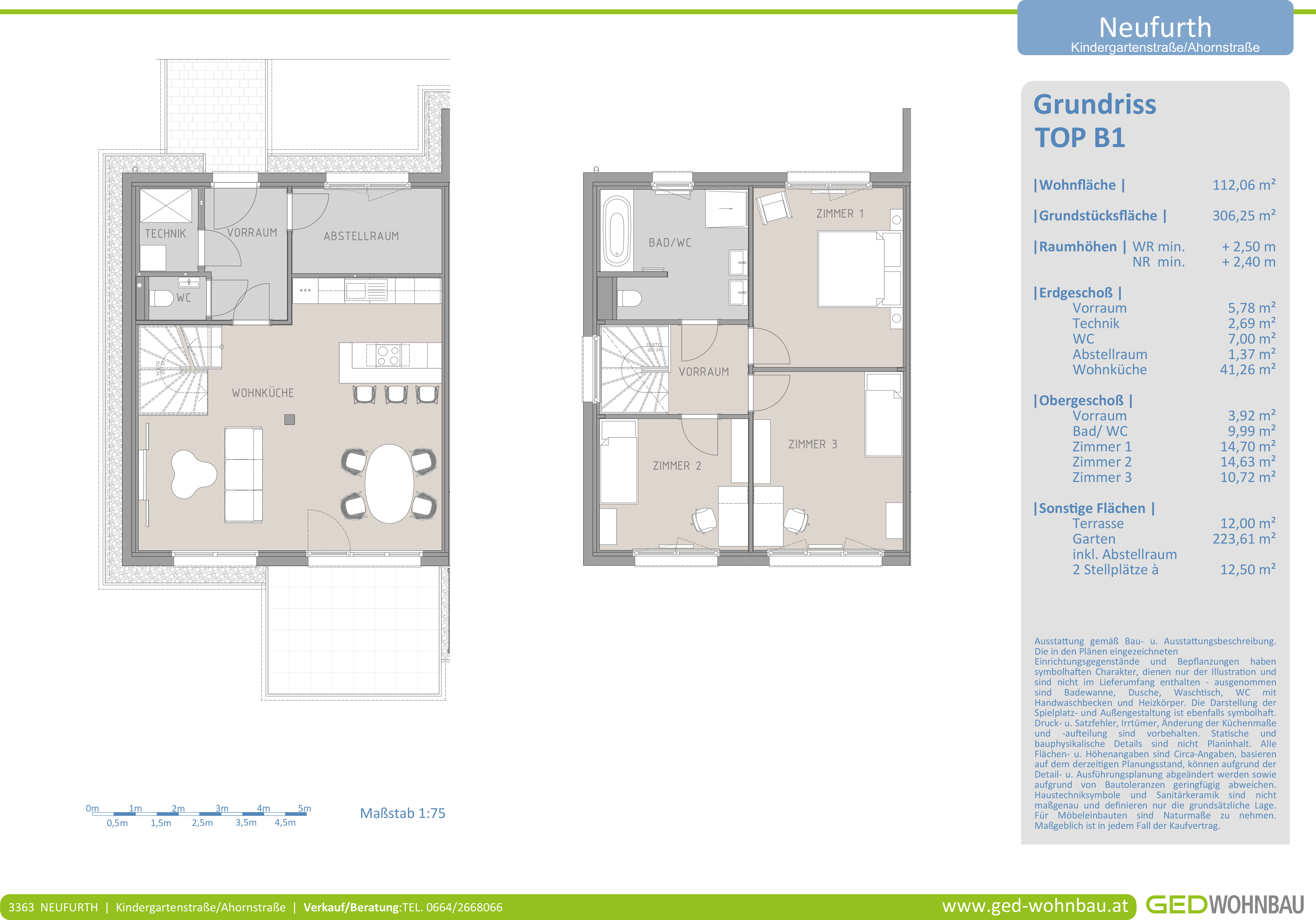 Das charmante Wohnbauprojekt umfasst insgesamt 7 Reihenhäuser sowie 2 Doppelhaushälften, mit Wohnnutzflächen zwischen 113 und 118 m². Das Erdgeschoß jeder Einheit besteht aus einem lichtdurchfluteten offenen Wohn-, Koch- und Essbereich mit Zugang auf die Terrasse und in den Garten. Vorzimmer, ein Gäste-WC, der Technikraum und ein zusätzlicher Abstellraum komplettieren diese Ebene. Eine elegante Holztreppe führt ins Obergeschoß, wo rund um die zentrale Galerie drei getrennt begehbare Schlafzimmer, in ein geräumiges Badezimmer mit Fenster und ein WC angeordnet sind. In Ihrem Eigengarten bietet ein modernes Gerätehaus zusätzliche Stellfläche .