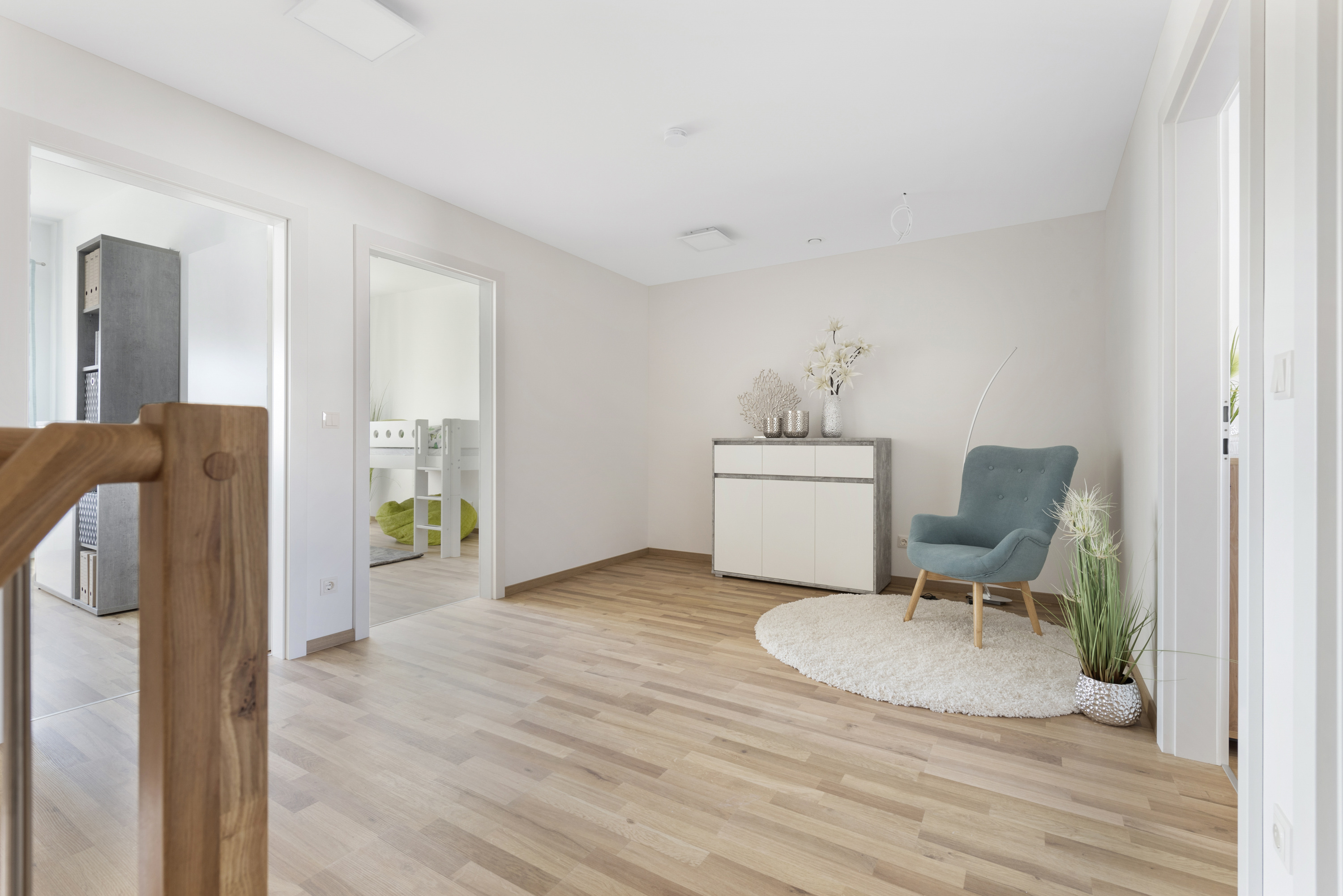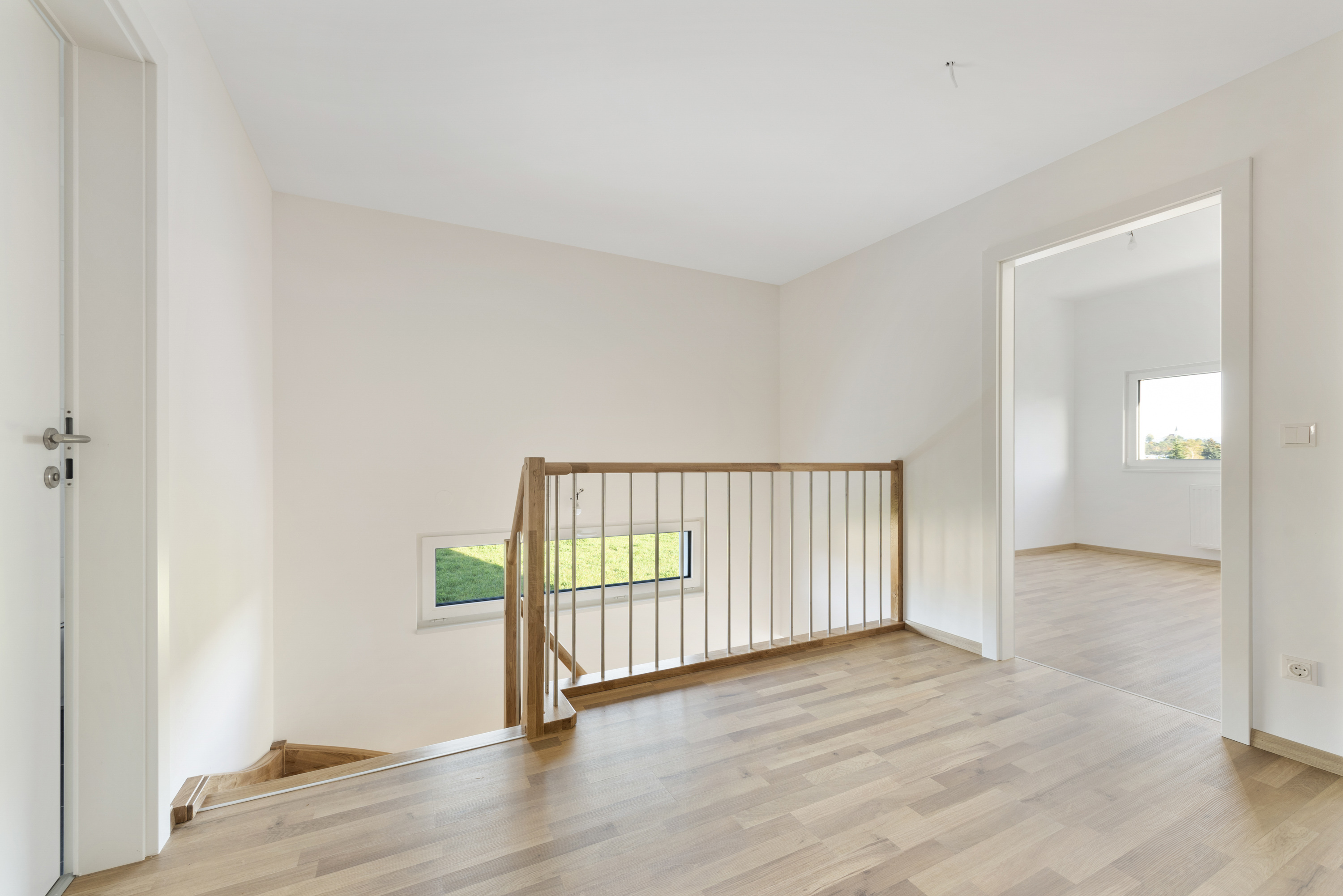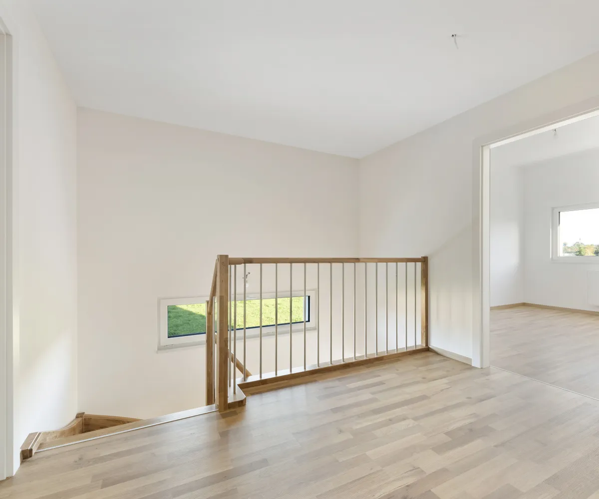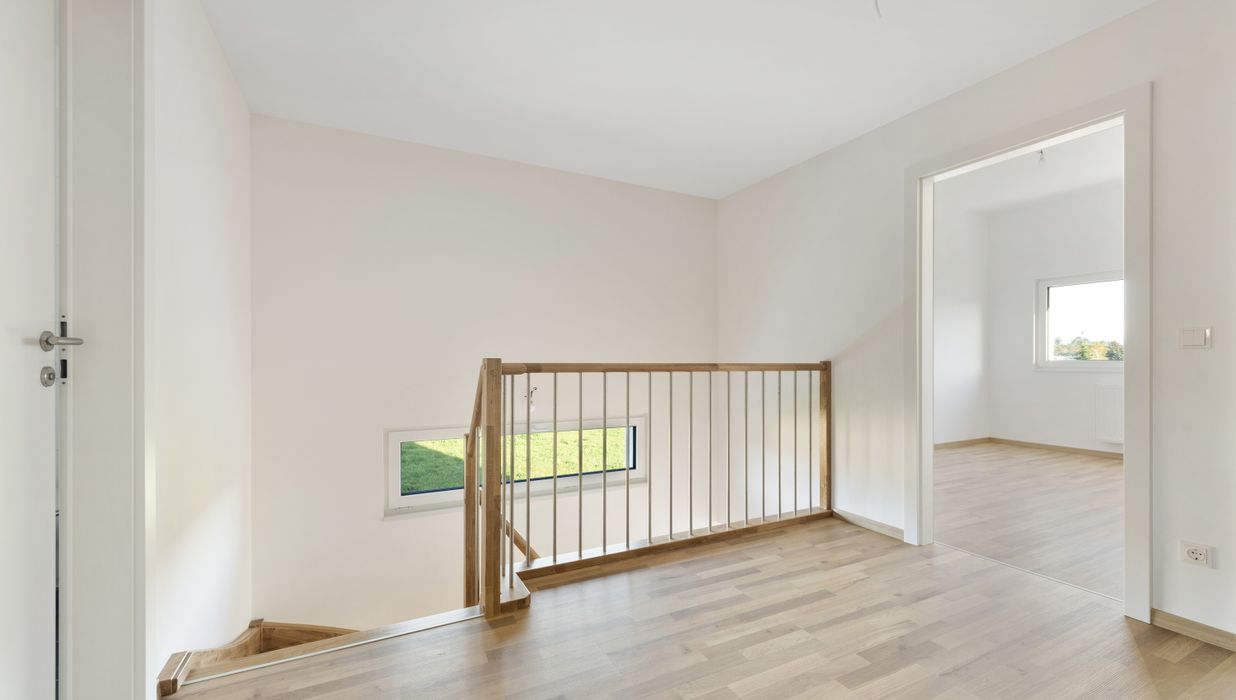 Das Erdgeschoss besteht aus einem lichtdurchfluteten offenen Wohn-, Koch- und Essbereich mit Zugang auf die Terrasse und in den Garten. Vorzimmer, ein Gäste-WC, der Technikraum und ein zusätzlicher Abstellraum komplettieren die Garten-Ebene. Eine elegante Holztreppe führt ins Obergeschoss, wo sich die BewohnerInnen und Gäste in drei getrennt begehbare Schlafzimmer mit einer Galerie, sowie in ein geräumiges Badezimmer mit Fenster und einem WC zurückziehen können. Zusätzliche Stellfläche bietet der Geräteraum im Garten .