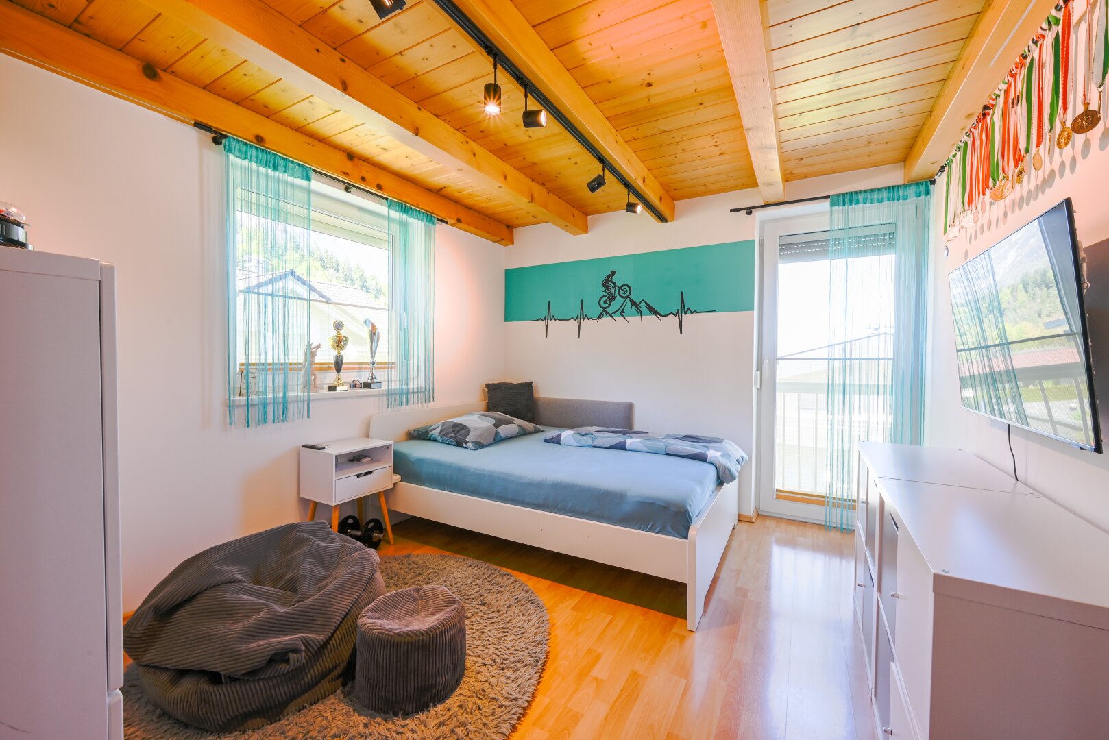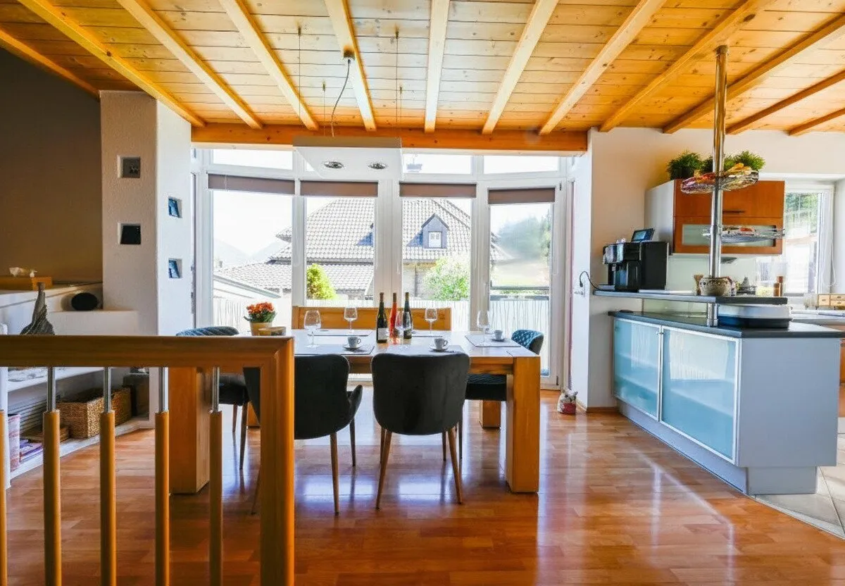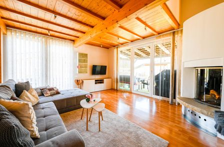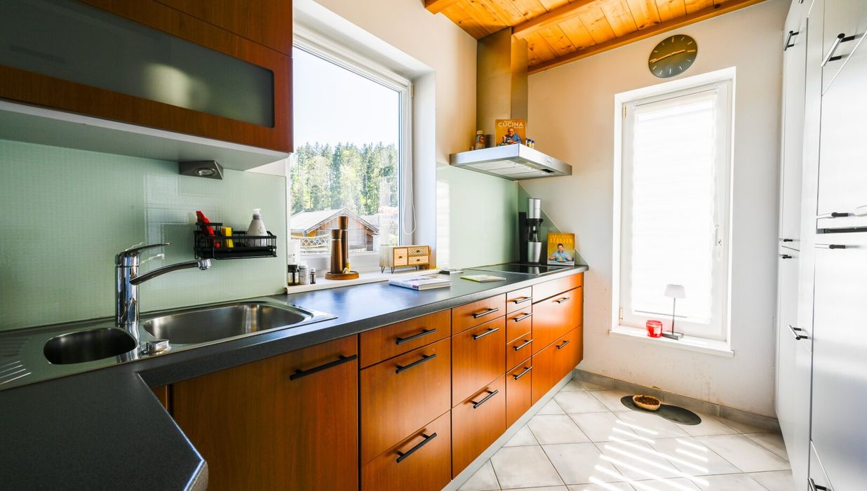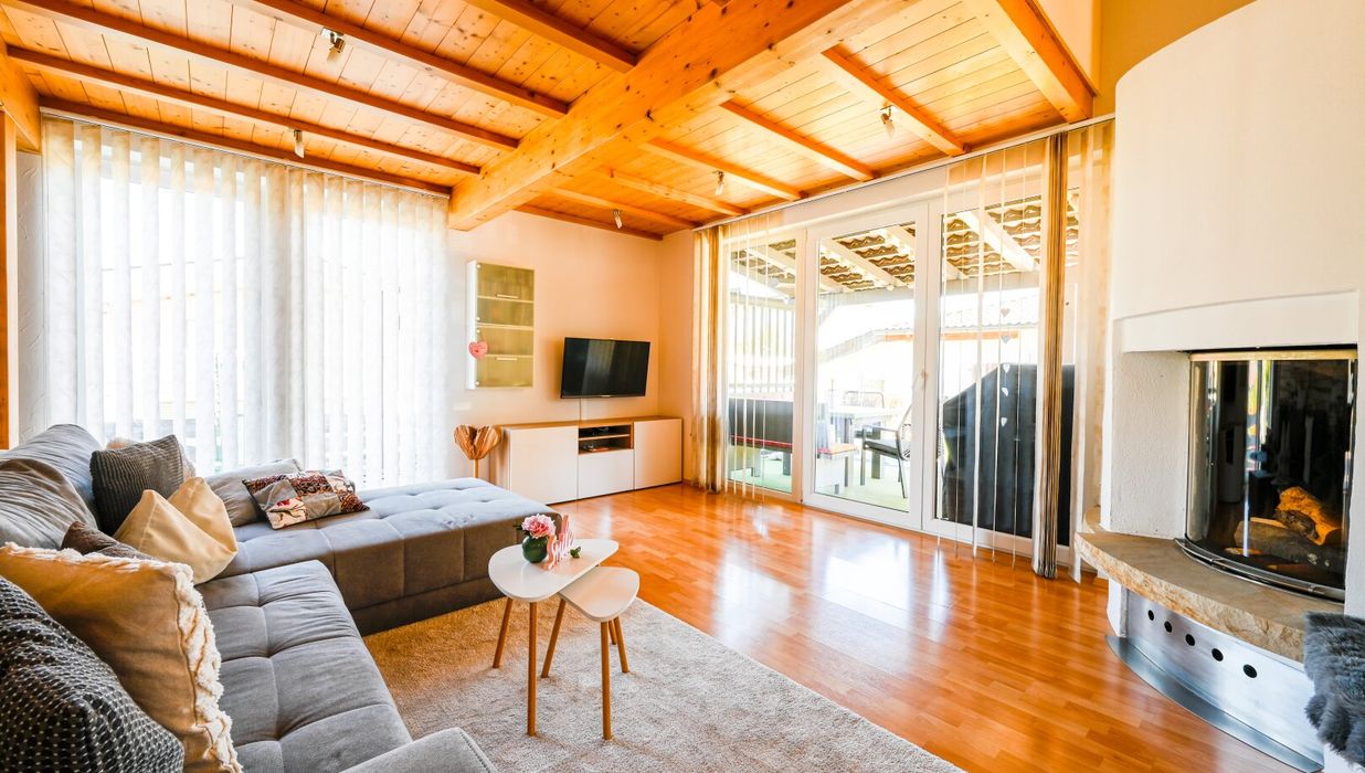 Das Haus empfängt Sie mit hellen Räumen, ausgestattet mit hochwertigen Fliesen und edlem Parkett. Das Herzstück ist die moderne Wohnküche mit offenem Konzept und Markengeräten. Der direkte Zugang vom Wohnzimmer auf die sonnige Terrasse verbindet den Innenbereich nahtlos mit dem Garten.