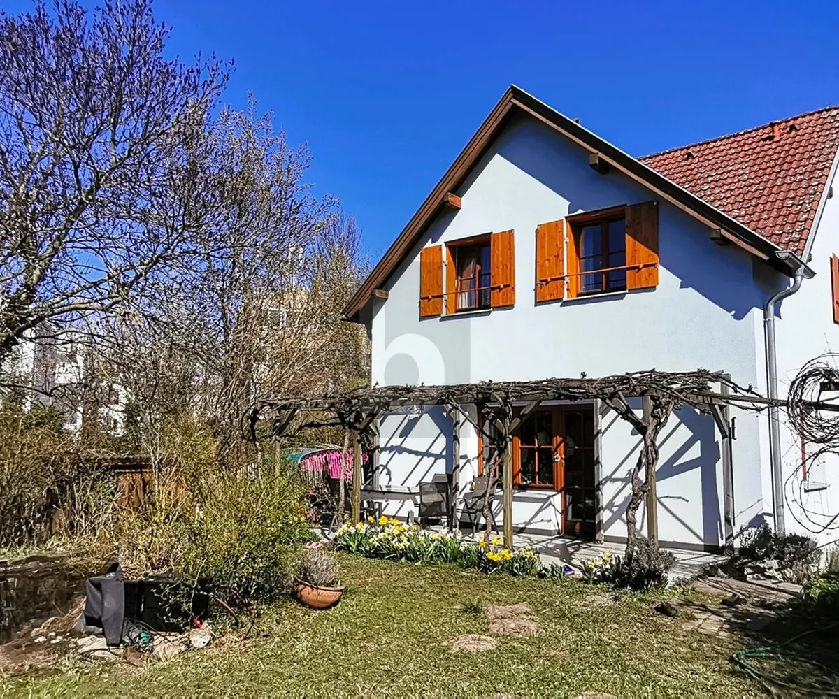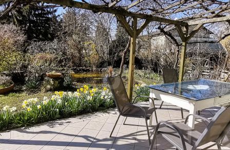 Erhöht über dem Ufer des Leithakanals (regulierter Zufluss), mit dem alleinigen Nutzungsrecht über etwa 100 m2 zusätzlicher Grünfläche bis zum Wasser, in verkehrsberuhigter Lage, und doch in wenigen Gehminuten am Bahnhof oder in der Altstadt von Bruck.