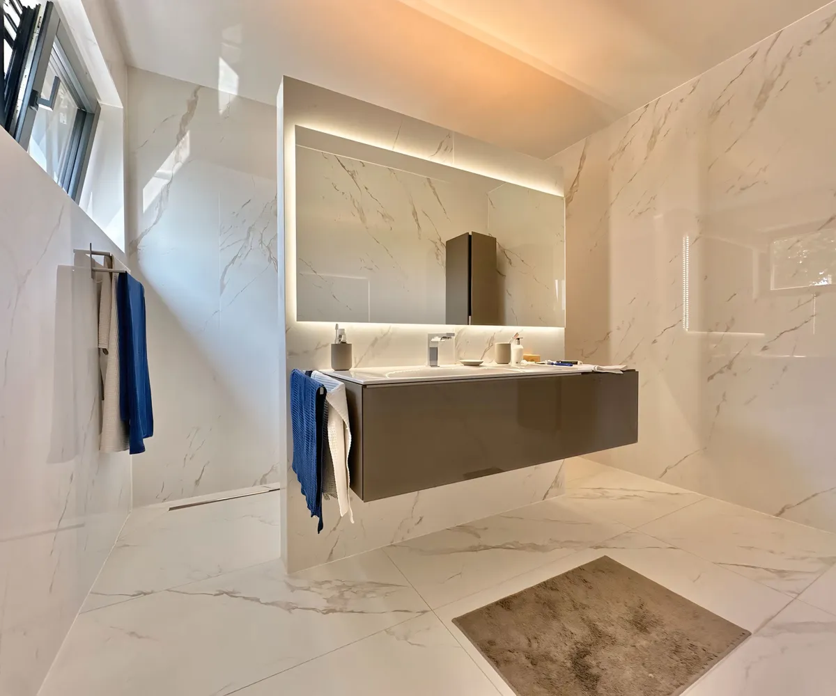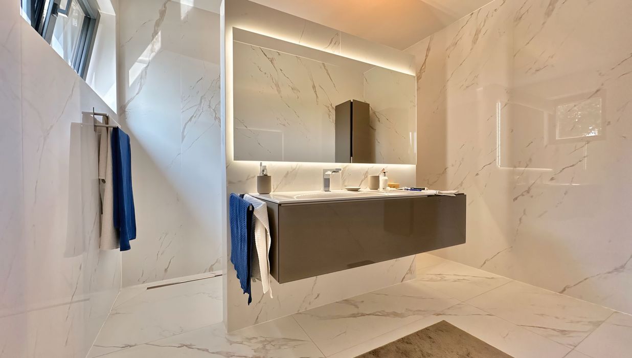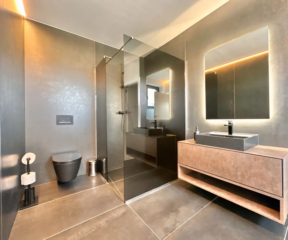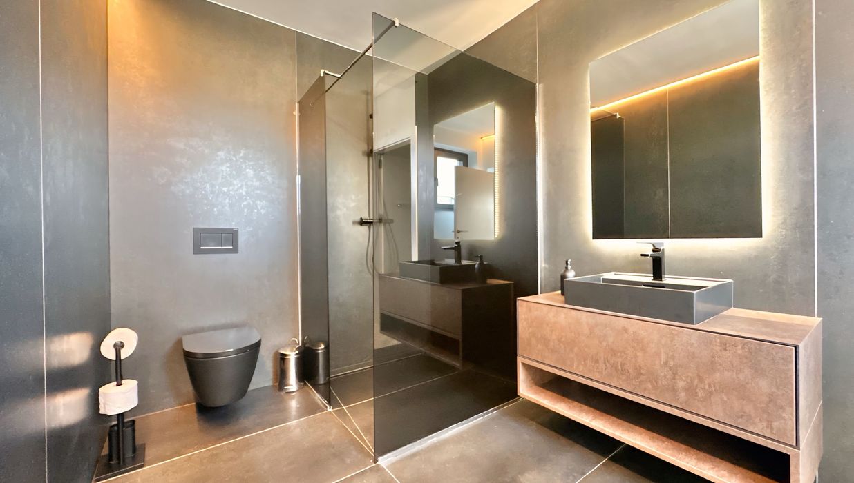 Im ersten Obergeschoss befinden sich zwei private Schlafbereiche , die jeweils mit einem eigenen Schrankraum und einem hochwertigen Badezimmer ausgestattet sind. Eines der Zimmer bietet Zugang zu einer ruhigen Loggia mit Blick ins Grüne.
