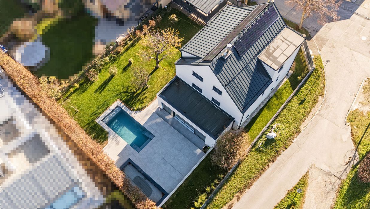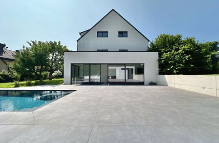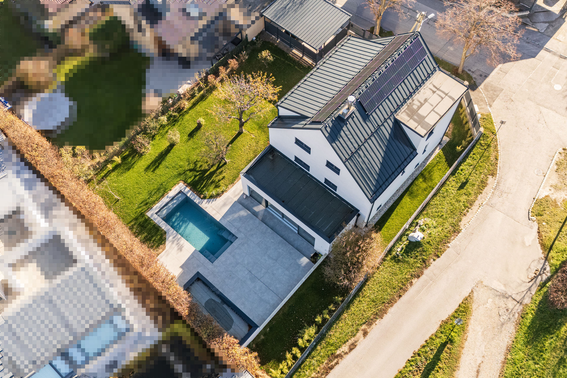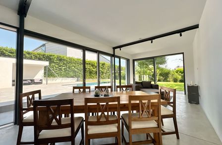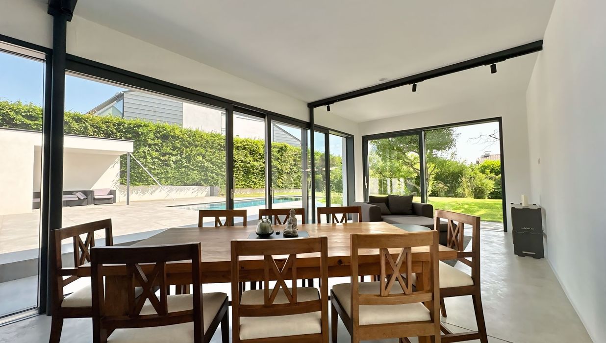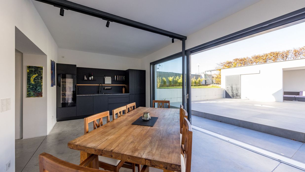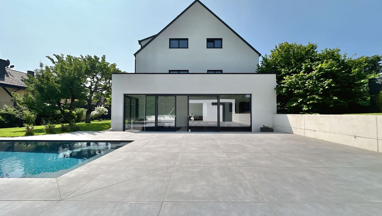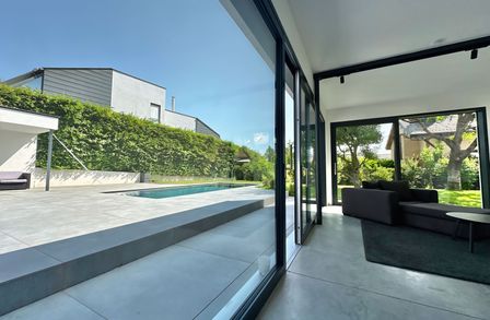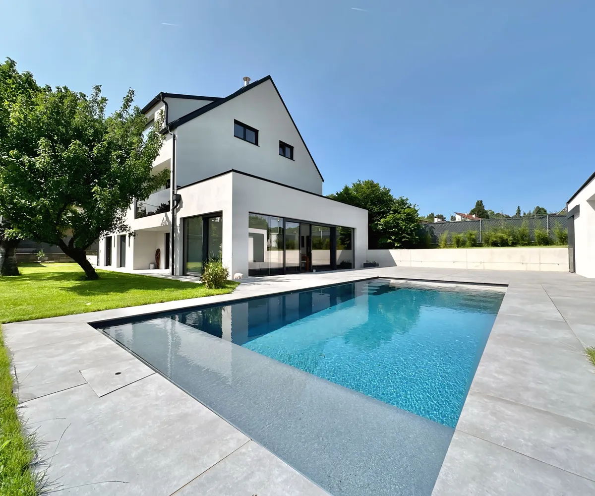 Das Erdgeschoss überzeugt mit einem weitläufigen Wohnbereich, der nahtlos in eine moderne "Sommerküche" übergeht und sich zum Garten hin öffnet . Große Fensterflächen lassen die Grenzen zwischen Innen und Außen verschwimmen. Der beheizbare Salzwasserpool im Garten wird zum natürlichen Mittelpunkt, nicht nur in den heißen Sommermonaten sondern auch in den Übergangszeiten.