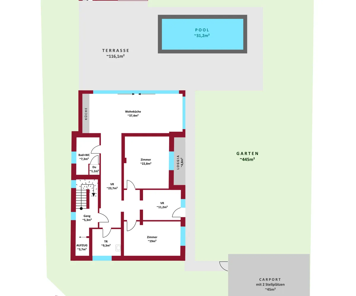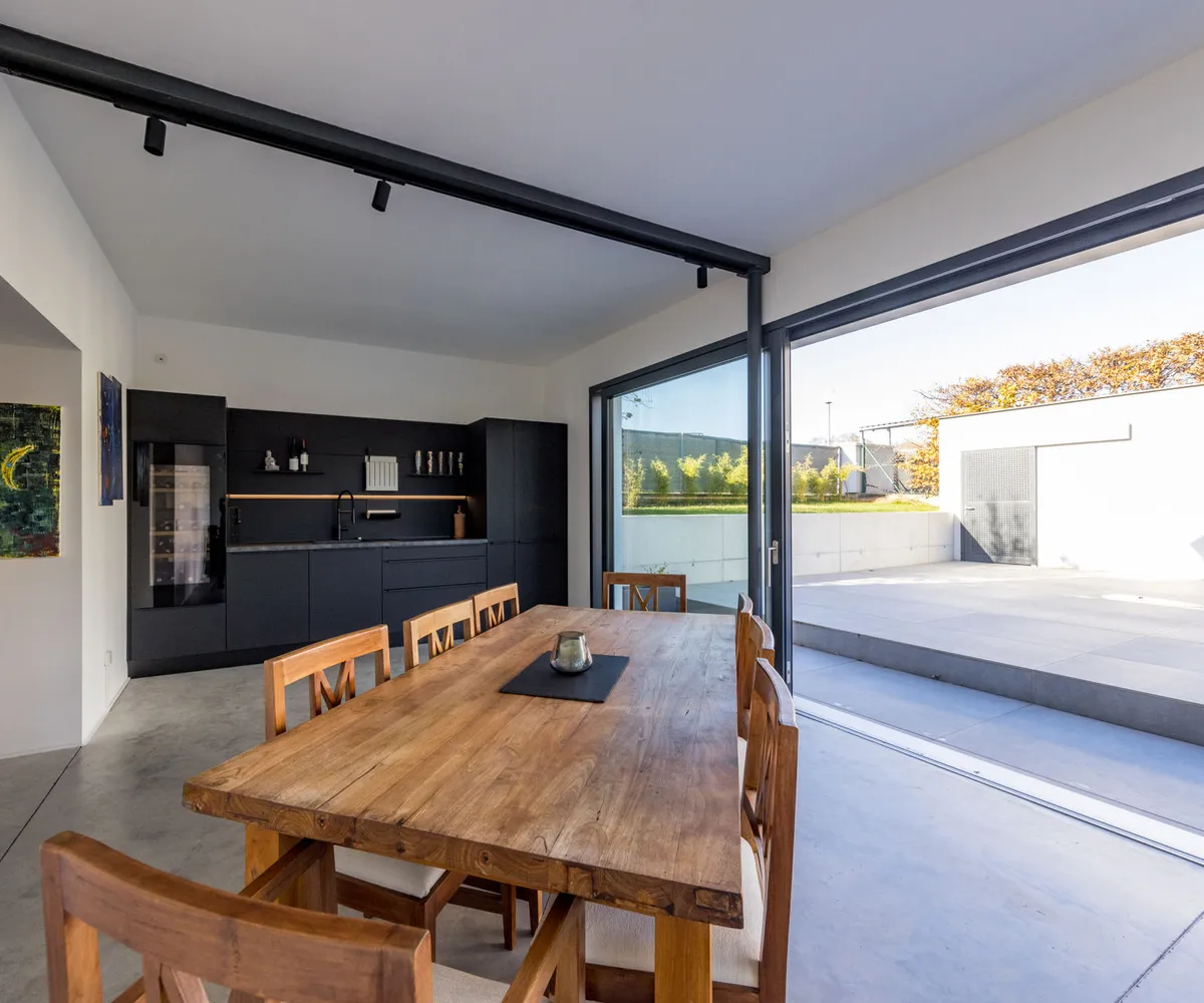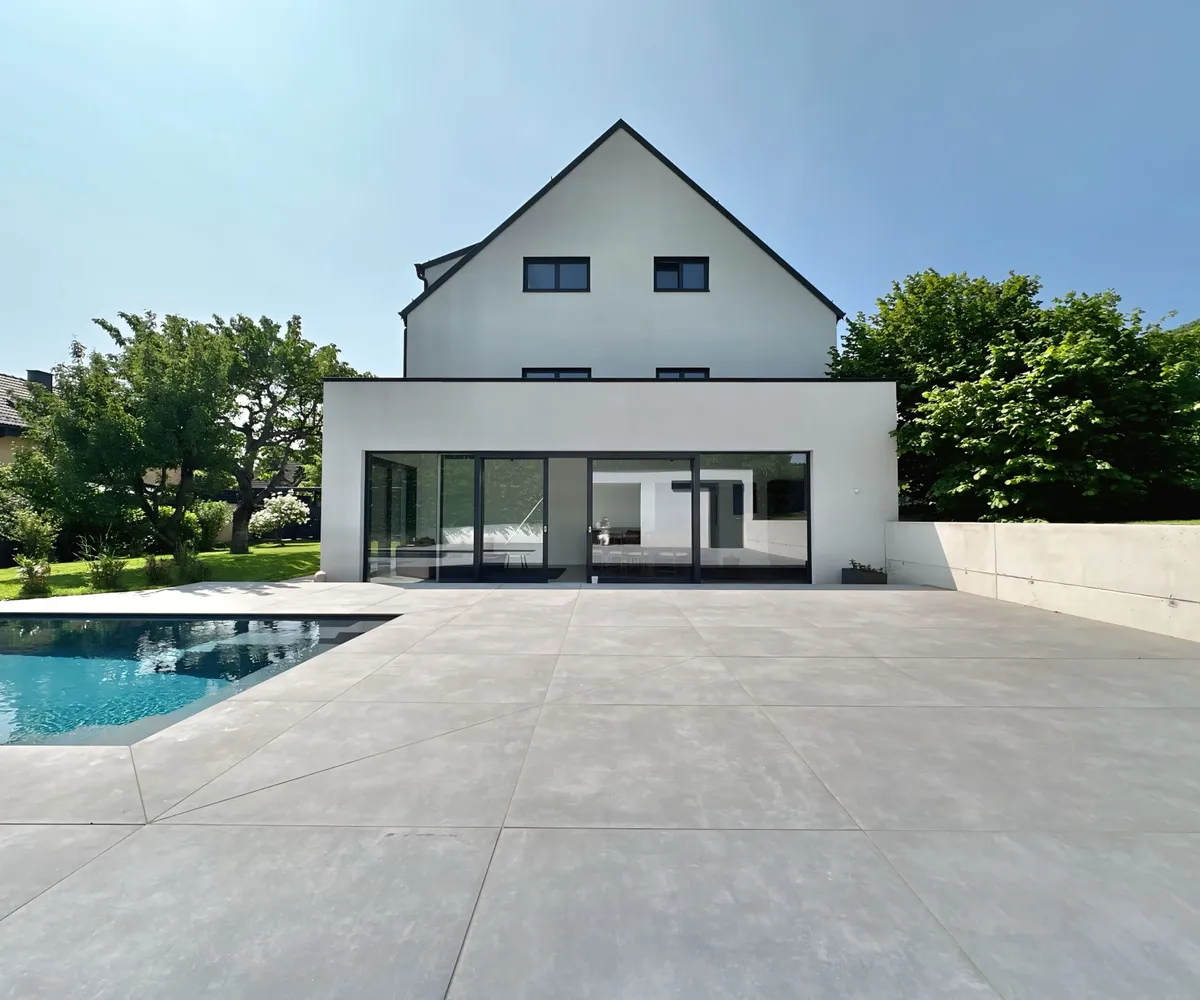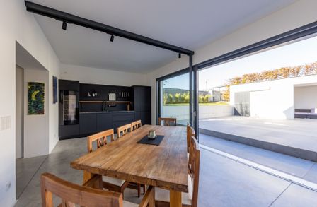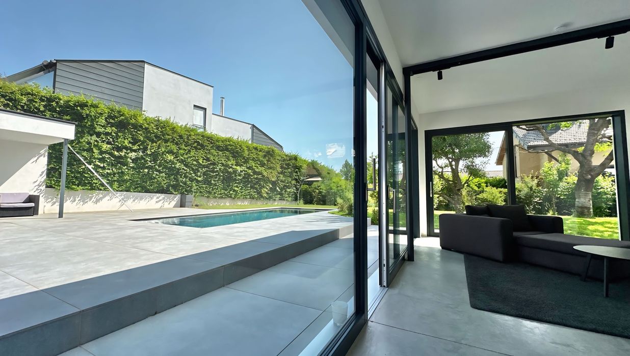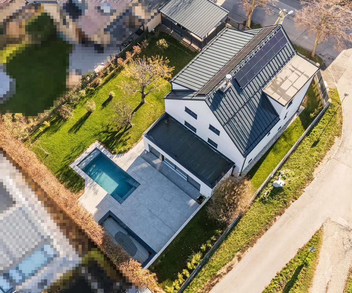 Das Erdgeschoss überzeugt mit einem weitläufigen Wohnbereich, der nahtlos in eine moderne "Sommerküche" übergeht und sich zum Garten hin öffnet . Große Fensterflächen lassen die Grenzen zwischen Innen und Außen verschwimmen. Der beheizbare Salzwasserpool im Garten wird zum natürlichen Mittelpunkt, nicht nur in den heißen Sommermonaten sondern auch in den Übergangszeiten.