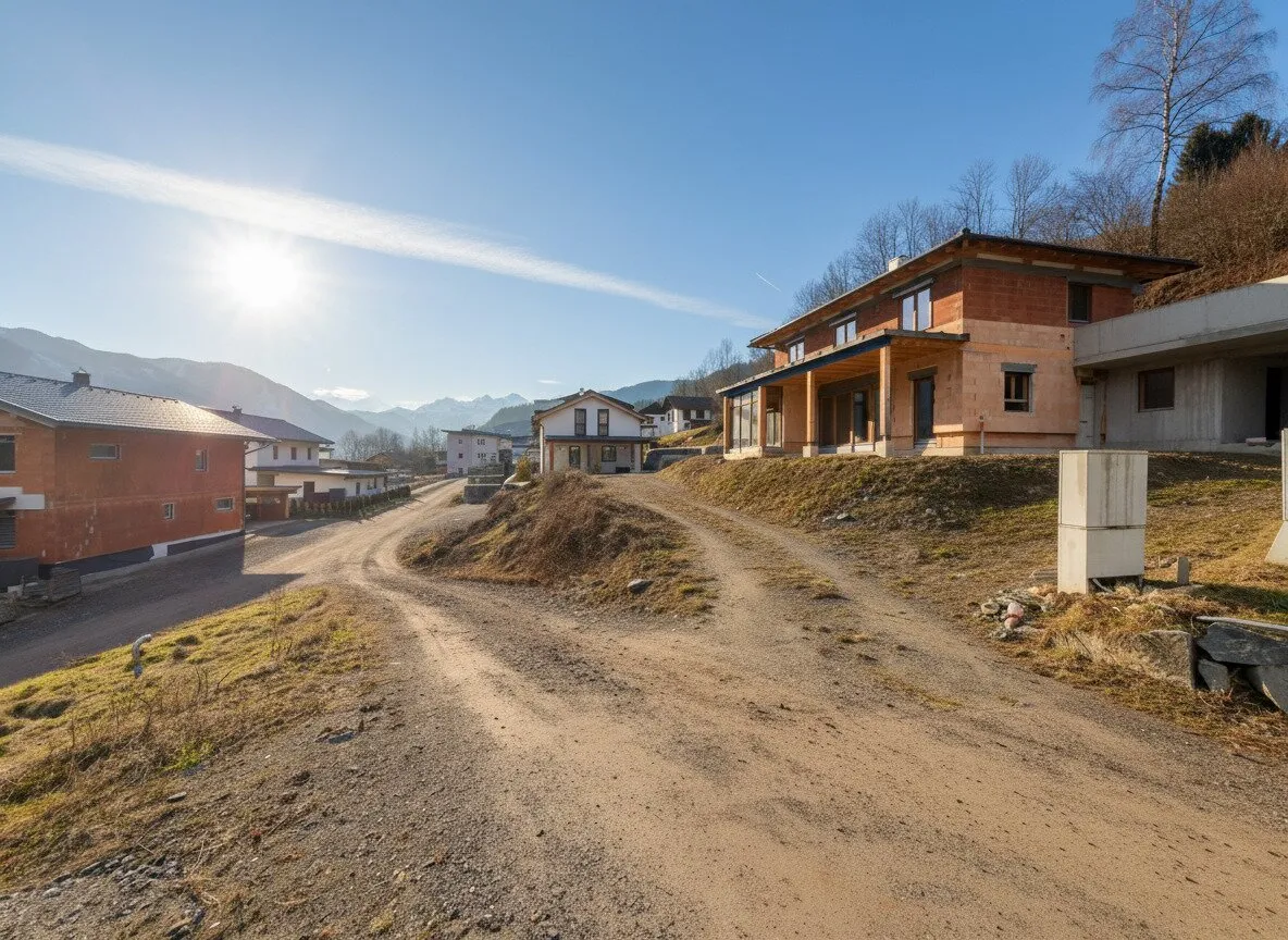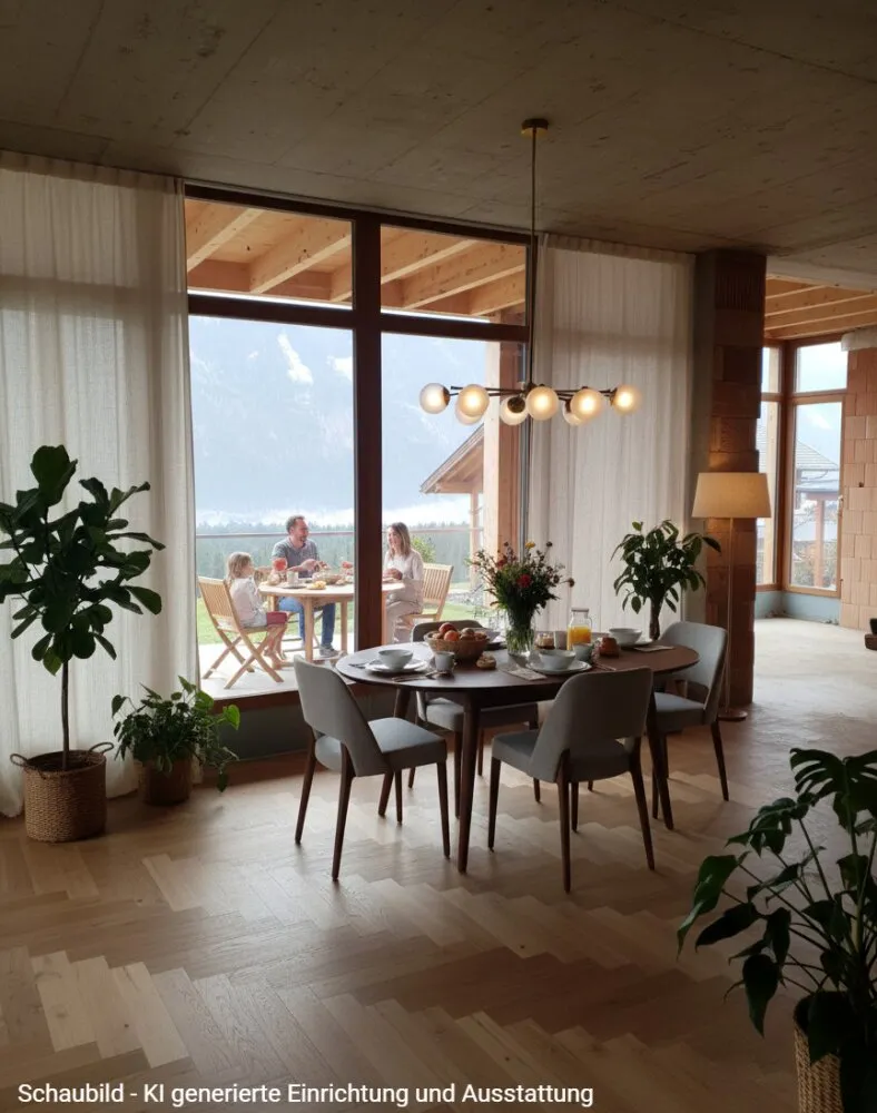 Die Umgebung präsentiert sich gepflegt und hochwertig, geprägt von mehreren neu errichteten Einfamilienhäusern. Diese gewachsene Neubau-Nachbarschaft unterstreicht die nachhaltige Werterhaltung des Standortes und macht das Objekt sowohl für Eigennutzer als auch für langfristig denkende Käufer attraktiv. Große Fensterflächen bieten sich an, um den unverbaubaren Blick auf die Täler und die umliegende Bergwelt bewusst in das Wohnkonzept einzubinden.