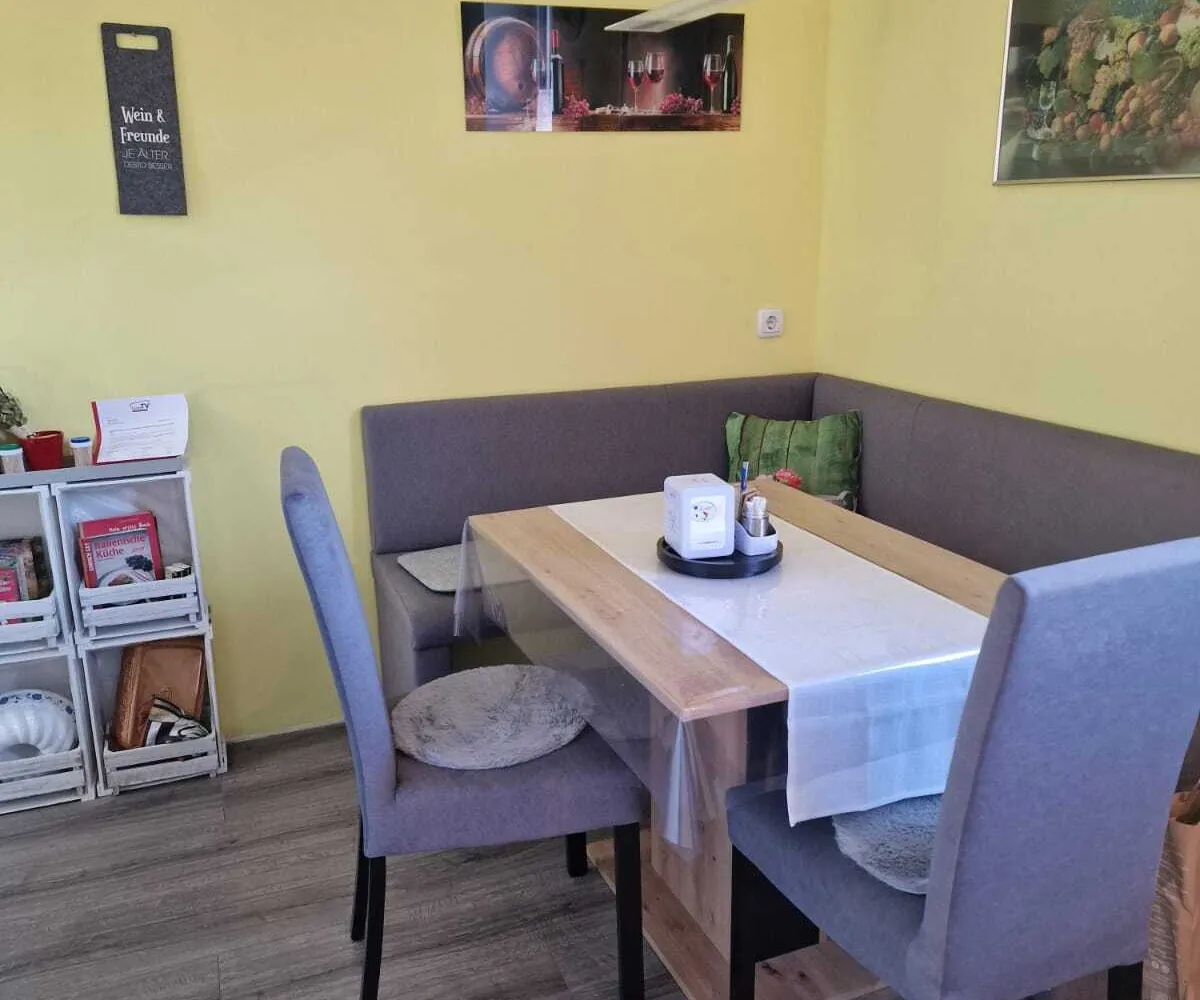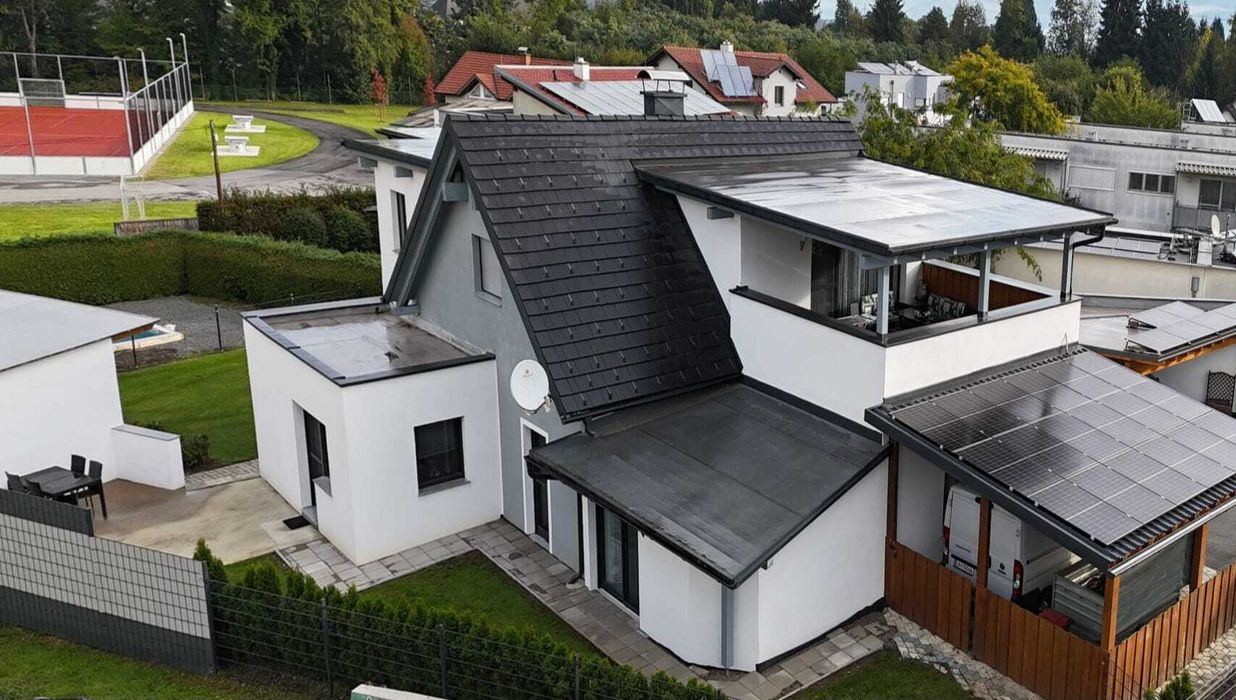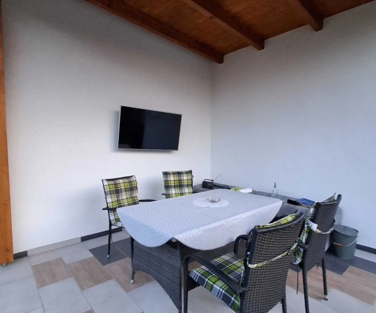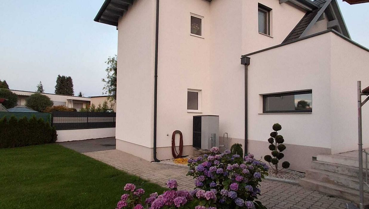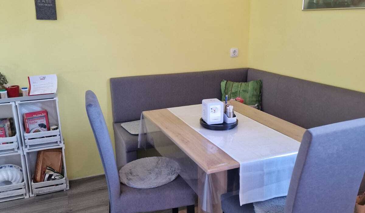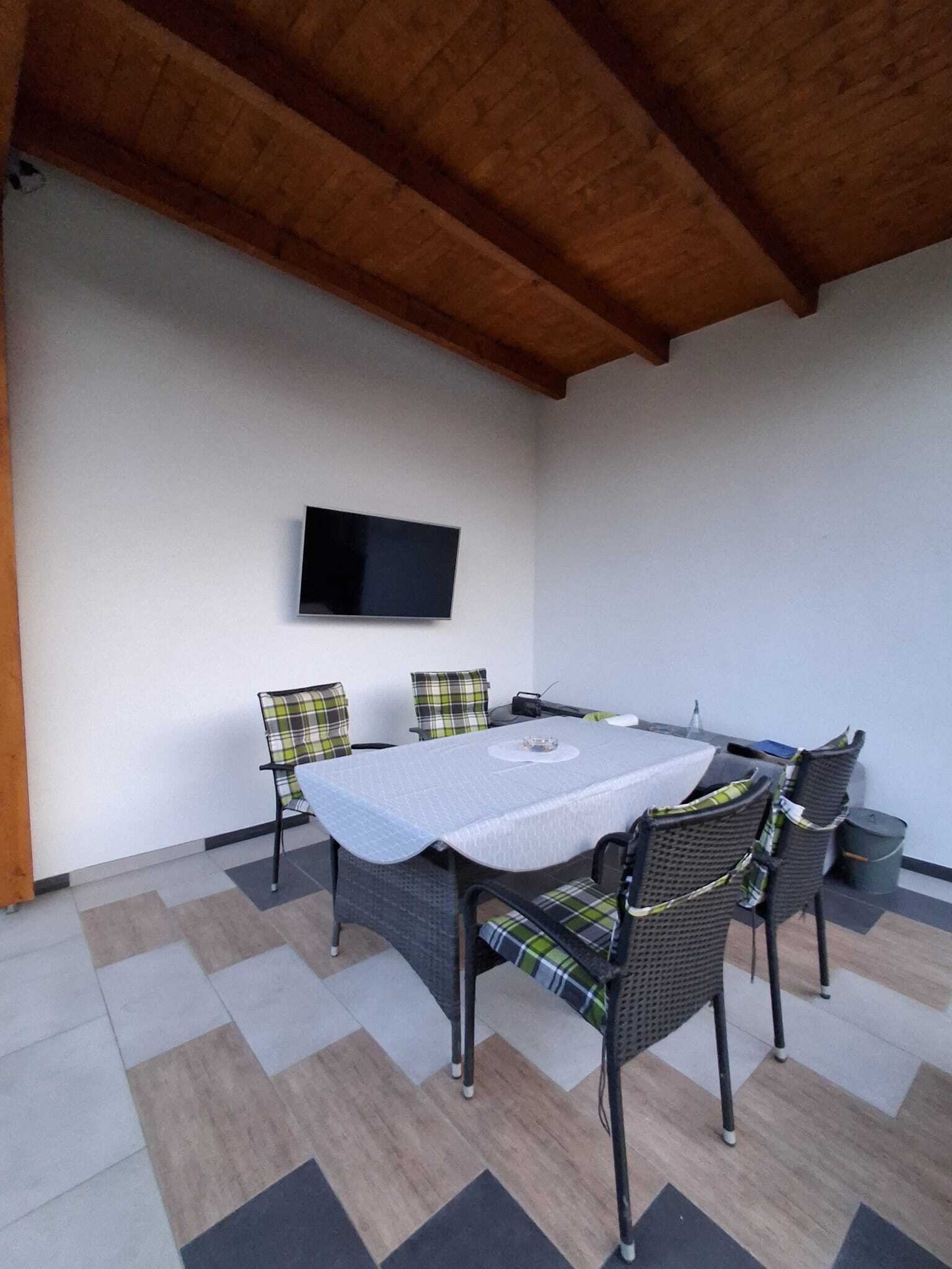 Beim Betreten des Obergeschosses befindet man sich direkt im Vorraum, diese mit einer Garderobe ausgestattet ist. Auf der linken Seite des Vorraumes erreicht man das Badezimmer, dieses mit einer Badewanne, einer Dusche, einen Waschbecken und einen Waschmaschinenanschluss ausgestattet ist. Nebenan befindet sich die separate Toilette. Den Gang entlang erreicht man auf der linken Seite die elegante Küche, die mit allen Geräten ausgestattet ist und über einen Esstisch und einer Sitzecke verfügt. Auf der rechten Seite befindet sich ein Abstellraum. Geradeaus vom Vorraum gelangt man in das großzügige Wohnzimmer, dieses mit einer Couchlandschaft ausgestattet ist. Direkt vom Wohnzimmer aus betritt man die einladende Terrasse, diese neu überdacht worden ist. Neben dem Wohnzimmer befindet sich das Schlafzimmer. Auch in dieser Etage sind alle Wohnräume mit viel Tageslicht durchflutet. Das Gebäude ist mit einer Luftwärmepumpe und mit Photovoltaik Paneelen ausgestattet.